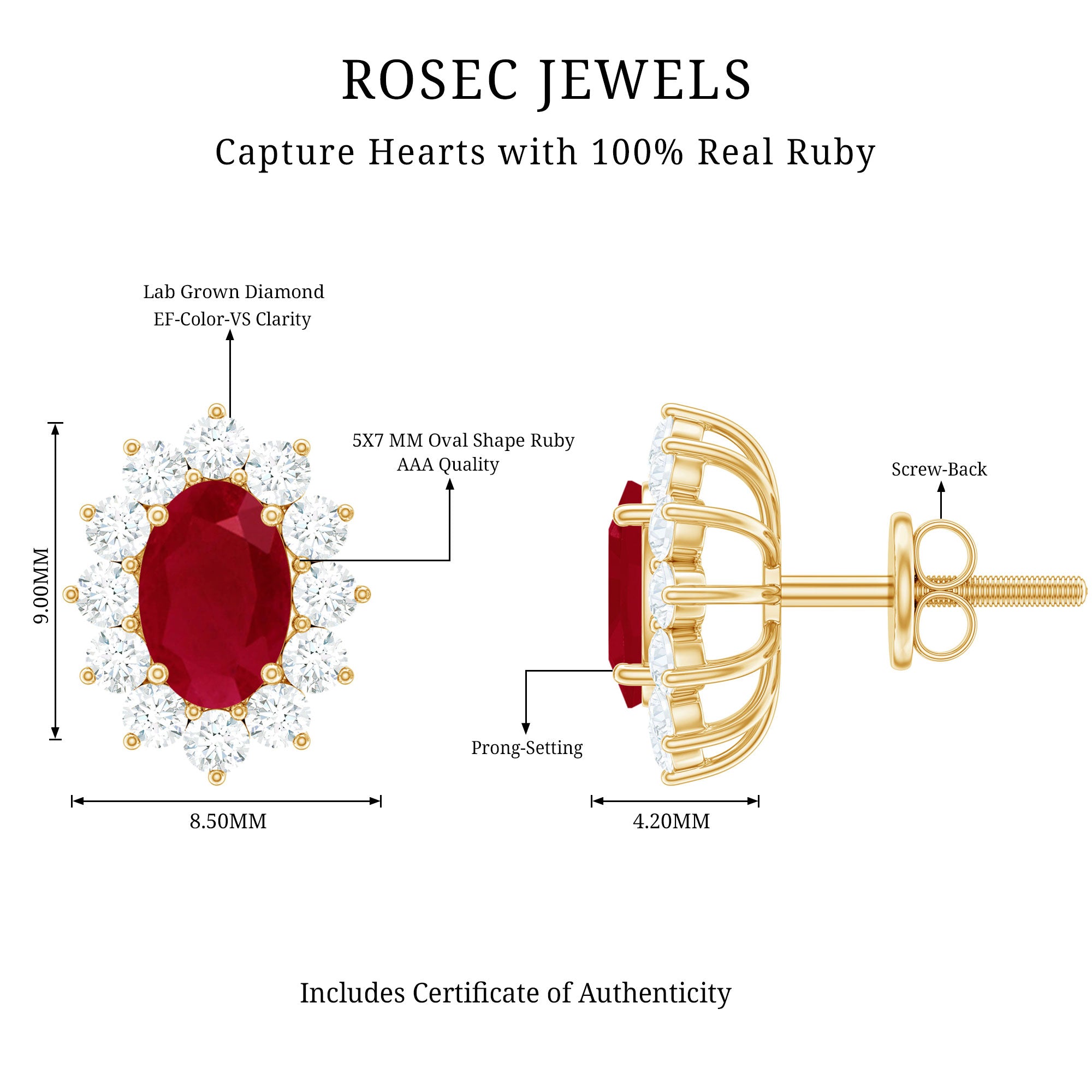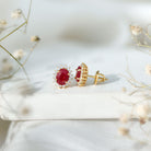 Natural 5X7 mm Oval Ruby Stud Earrings With Diamond Halo
