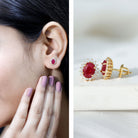 Elevate your jewelry collection with these exquisite Ruby Stud Earrings, set in luxurious Yellow Gold Plated Sterling Silver. Each earring showcases a vibrant, Oval Shape Ruby, measuring 5X7 mm, known for its deep, captivating red hue that symbolizes passion and timeless elegance. Surrounding each Ruby is a delicate Halo of EF-VS Quality Lab Grown Diamond stones to enhance the brilliance of the center stone, adding extra sparkle and a touch of modern sophistication. These Ruby Diamond Earrings are secure with Screw Back Closure, providing both comfort and confidence, ideal for daily wear or special occasions. The Yellow Gold Plating enhances the overall design, giving it a classic yet contemporary feel that easily complements both casual and formal looks. Whether gifted to mark a significant milestone or chosen as a treat for yourself, these AAA Quality Ruby Studs bring a perfect balance of color, sparkle, and craftsmanship. A statement of elegance and sustainability, these Real Ruby Earrings reflect a modern approach to timeless beauty. Packaged in a signature jewelry box, these Ruby Earrings are ready to dazzle from the moment you open them.
