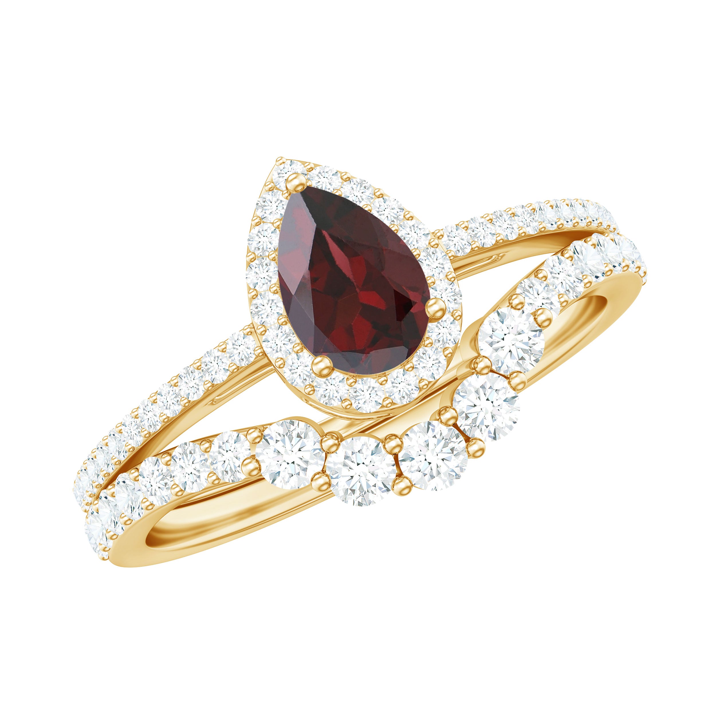 Embark on a beautiful journey of love with this Wedding Engagement Ring Set, crafted to shine as brightly as the moments you cherish. The engagement ring features a captivating 5X7 mm Pear Shape Garnet set in Prong Setting, its deep red glow surrounded by a sparkling Diamond Halo that adds timeless elegance. Diamond Side Stones continue the shimmer along the band, creating a graceful path of light that enhances the natural beauty of AAA Quality Garnet. Paired with a Curved Wedding Band adorned with delicate Round Shape Diamond stones, this Pear Shaped Engagement Ring Set forms a harmonious design that symbolizes unity and everlasting devotion. Whether worn together for a breathtaking bridal look or styled separately for a softer touch of sparkle, this Wedding Bridal Ring Set is designed to make every day feel special. Arriving in a signature jewelry box and offered in various sizes, this Garnet Wedding Ring Set is ready to be gifted as a heartfelt expression of eternal love.