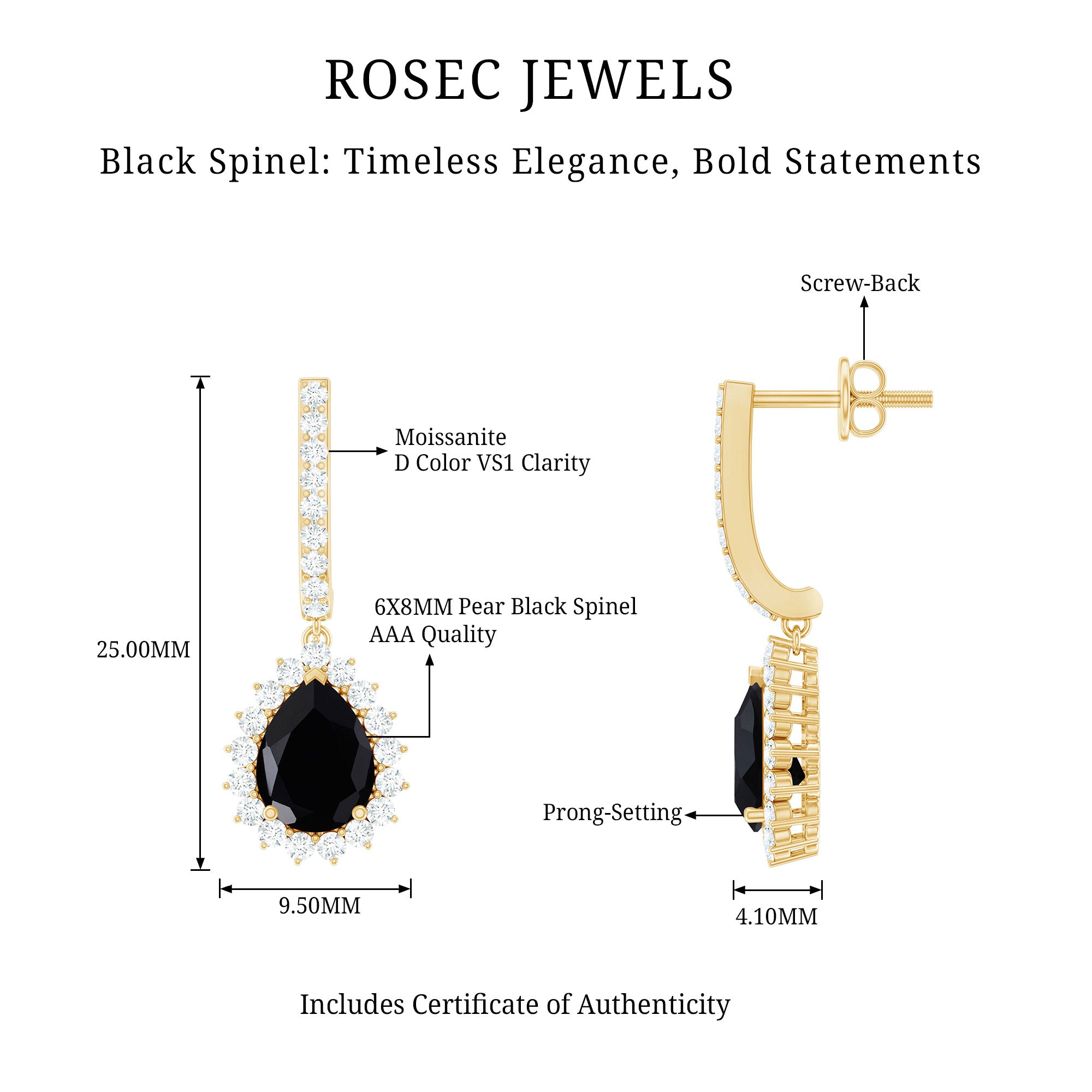 Enchanting and effortlessly glamorous, these Teardrop Earrings are a showstopper for any jewelry collection. Each Earring features a 6X8 mm Pear Shape Black Spinel in Prong Setting, surrounded by a sparkling Halo of Moissanite, catching the light with every movement for a dazzling effect. Suspended from a Moissanite studded J Hoop, these Hoop Drop Earrings combine elegance and modern flair, creating a design that feels luxurious. The Screw Back Closure ensures they stay secure, making them perfect for a night out, a special event or even elevating your everyday look. These Black Spinel Earrings arrive ready to gift in a chic jewelry box, making them an ideal present for anniversaries, birthdays or just to celebrate someone special. The striking contrast between the dark AAA Quality Black Spinel and sparkling D-VS1 Moissanite makes them versatile enough to pair with both casual and formal outfits, adding instant sophistication. They are the kind of piece that draws compliments and turns ordinary moments into something extraordinary.