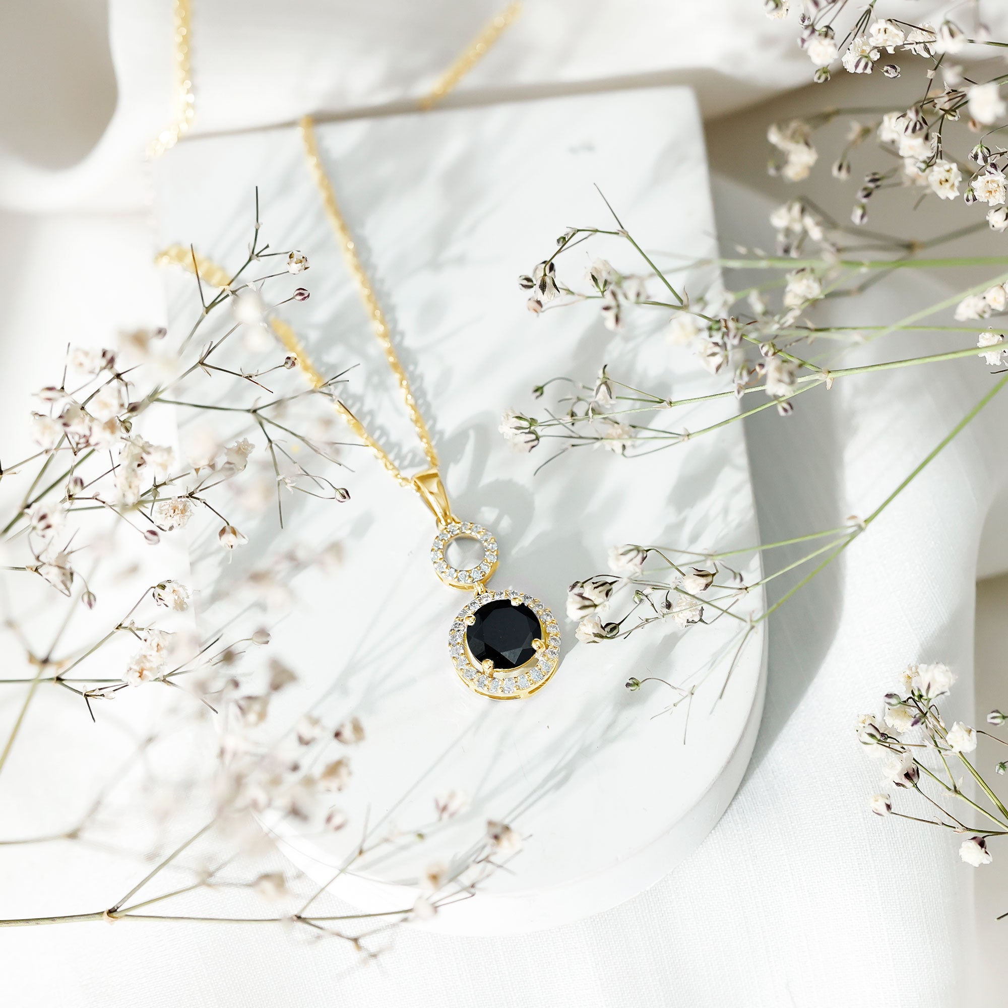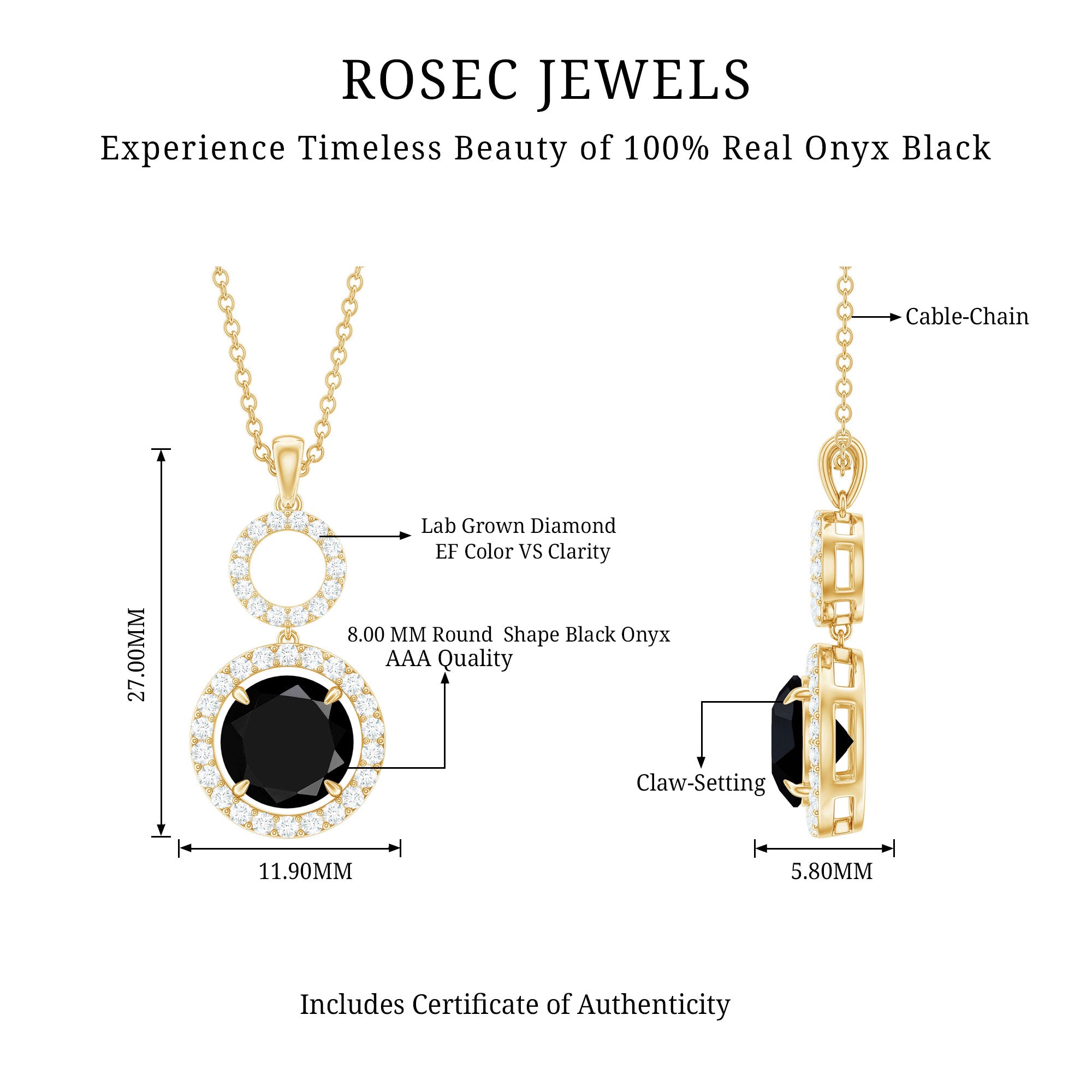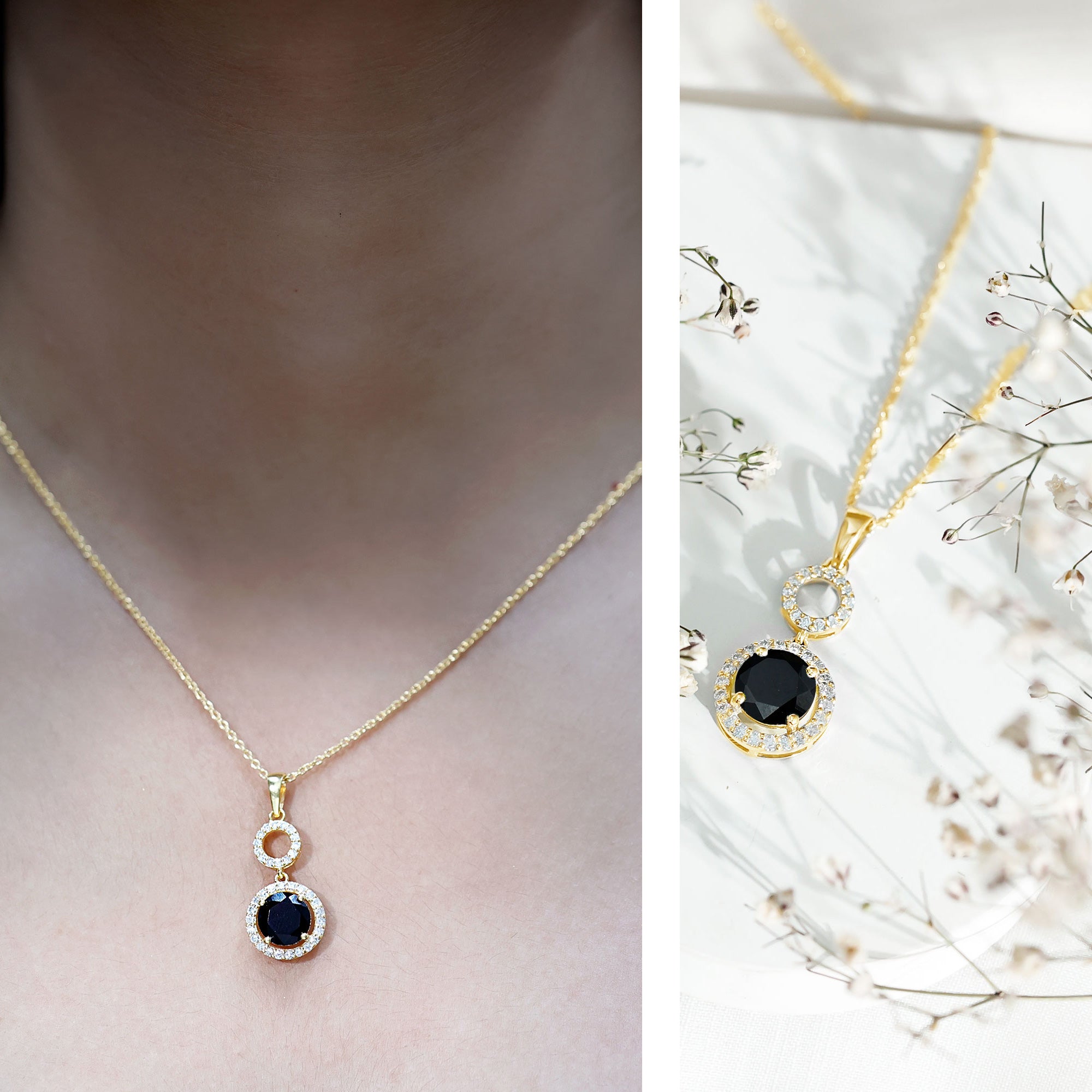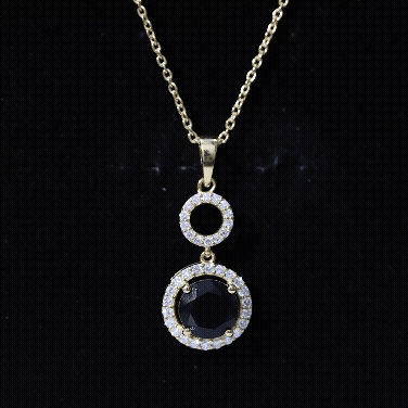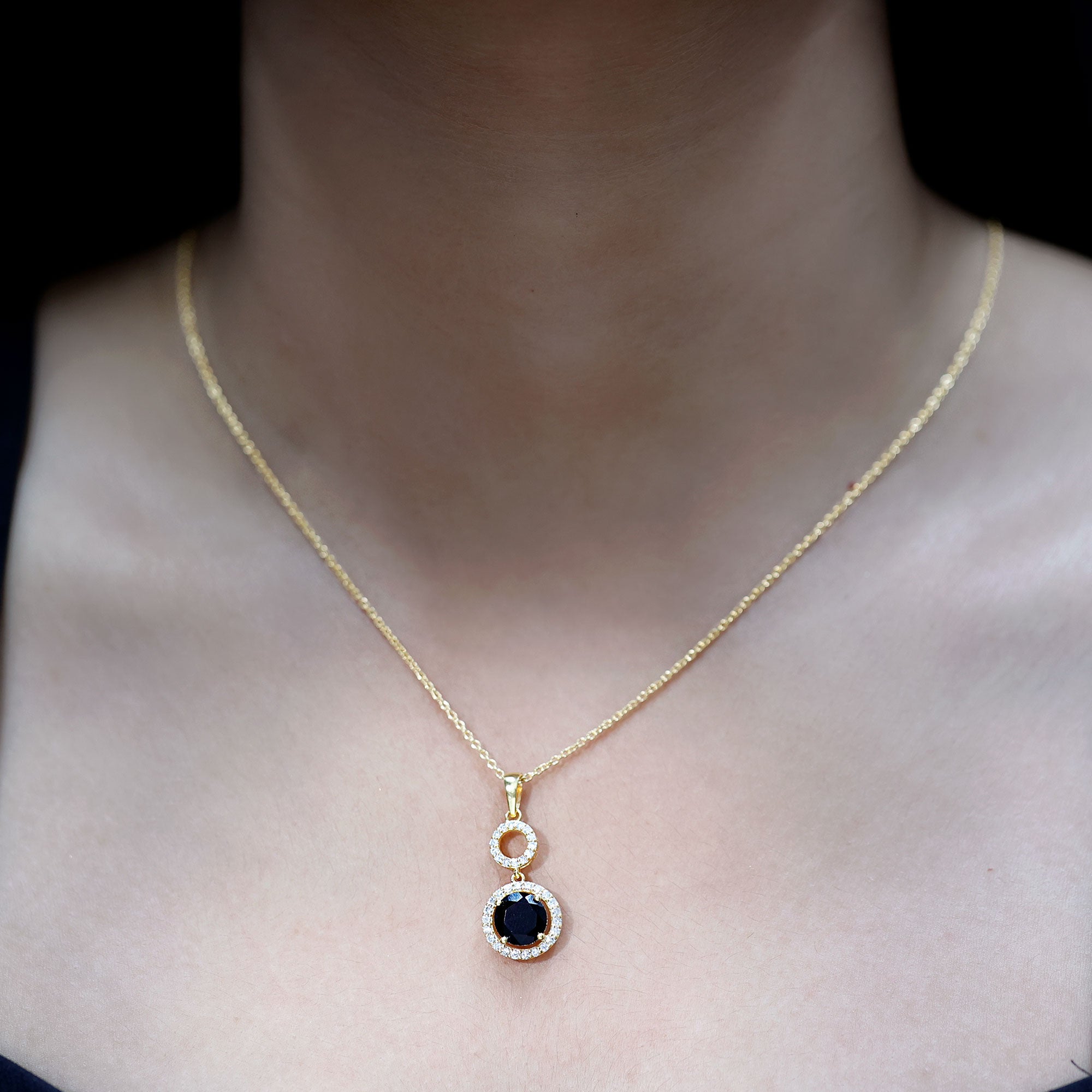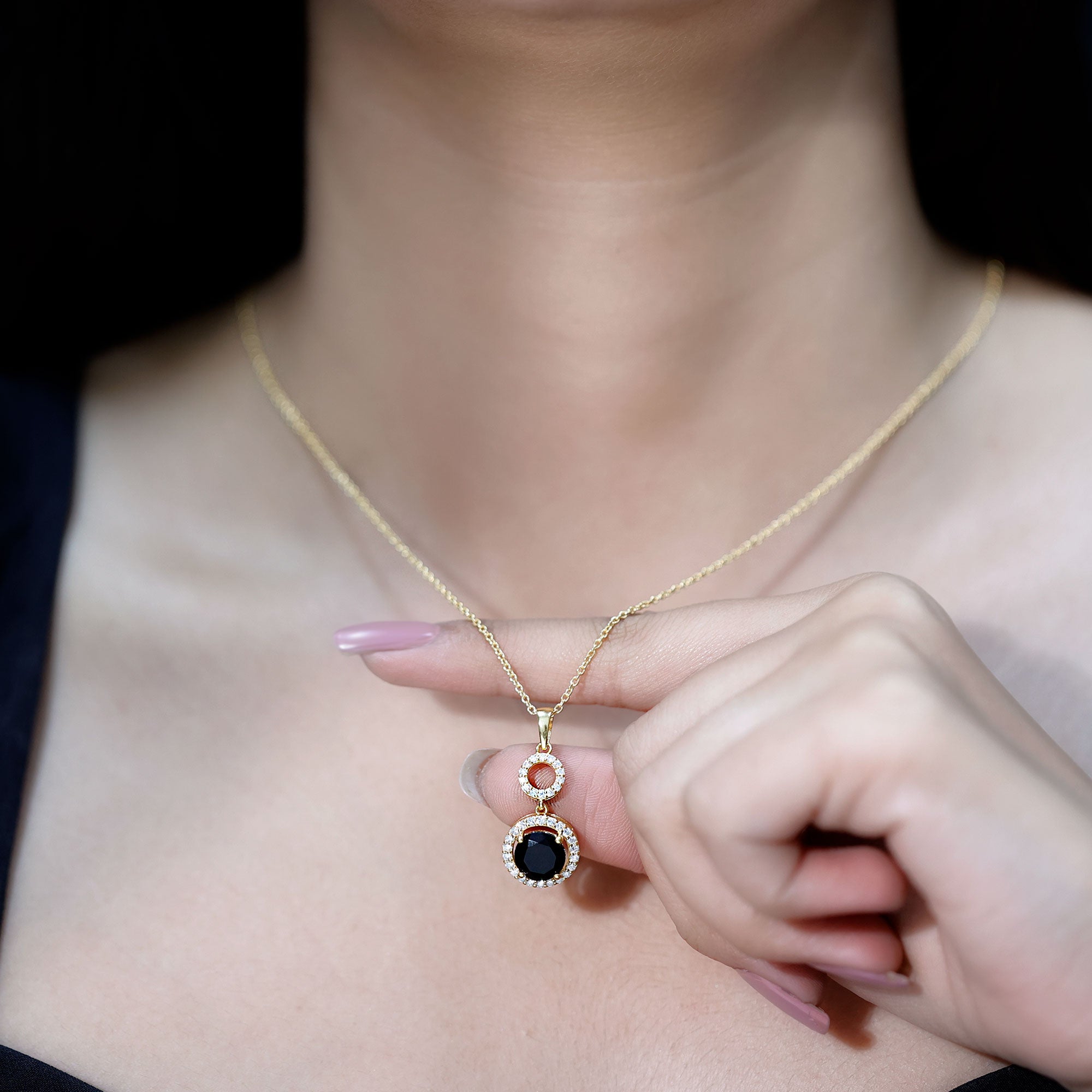 Make a bold entrance with this striking Black Onyx Pendant, designed to turn heads and spark conversations. Crafted in 14k yellow gold plated silver, this Dangle Necklace brings together a dramatic look with graceful movement, making it perfect for evenings, parties, or when you simply want to stand out. The Halo Pendant features an 8 MM round cut black onyx as the centerpiece, set securely in claw setting. Surrounding the onyx is a brilliant lab grown diamond halo that adds just the right amount of sparkle. Above the onyx, an open circle connector adds a fun twist to the design. The Black Onyx and Diamond Necklace hangs from a delicate yet sturdy chain, allowing it to rest beautifully at the neckline. It is lightweight and easy to wear, but the look it creates is far from simple. Whether you are dressing up for a cocktail party, a formal event, or just want something bold and chic to elevate your look, this Black Gem Necklace is a perfect choice. A modern twist on a timeless style, this necklace is your go-to piece when you want to keep things elegant, but unforgettable.