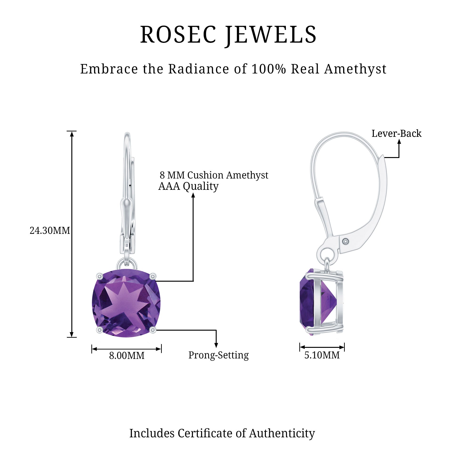 Natural 8mm Cushion Cut Amethyst Drop Earrings with Lever Back