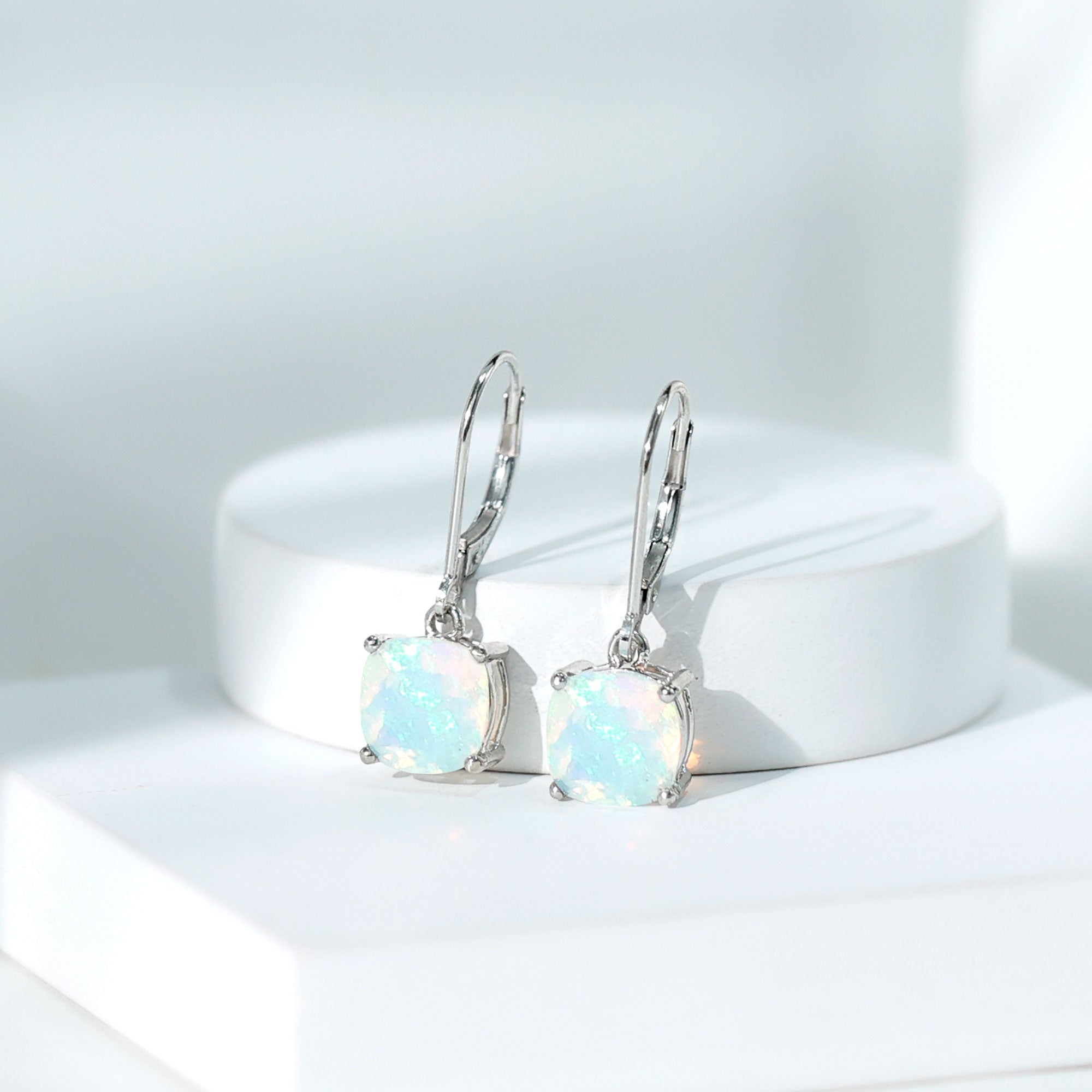Make your ears adorn with these Rainbow Opal Hoop Earrings. They feature 8 MM Cushion Cut Ethiopian Opal securely placed in Prong Setting. These Drop Earrings are perfect to mark a statement to elevate the look. These earrings are handcrafted with 14K White Gold Plated Silver that perfectly beholds the shine of AAA Quality natural Ethiopian Opal. These Solitaire Earrings come with a Lever Back Closure making them easy to wear. Get these earrings and make your style statement talk of the town.