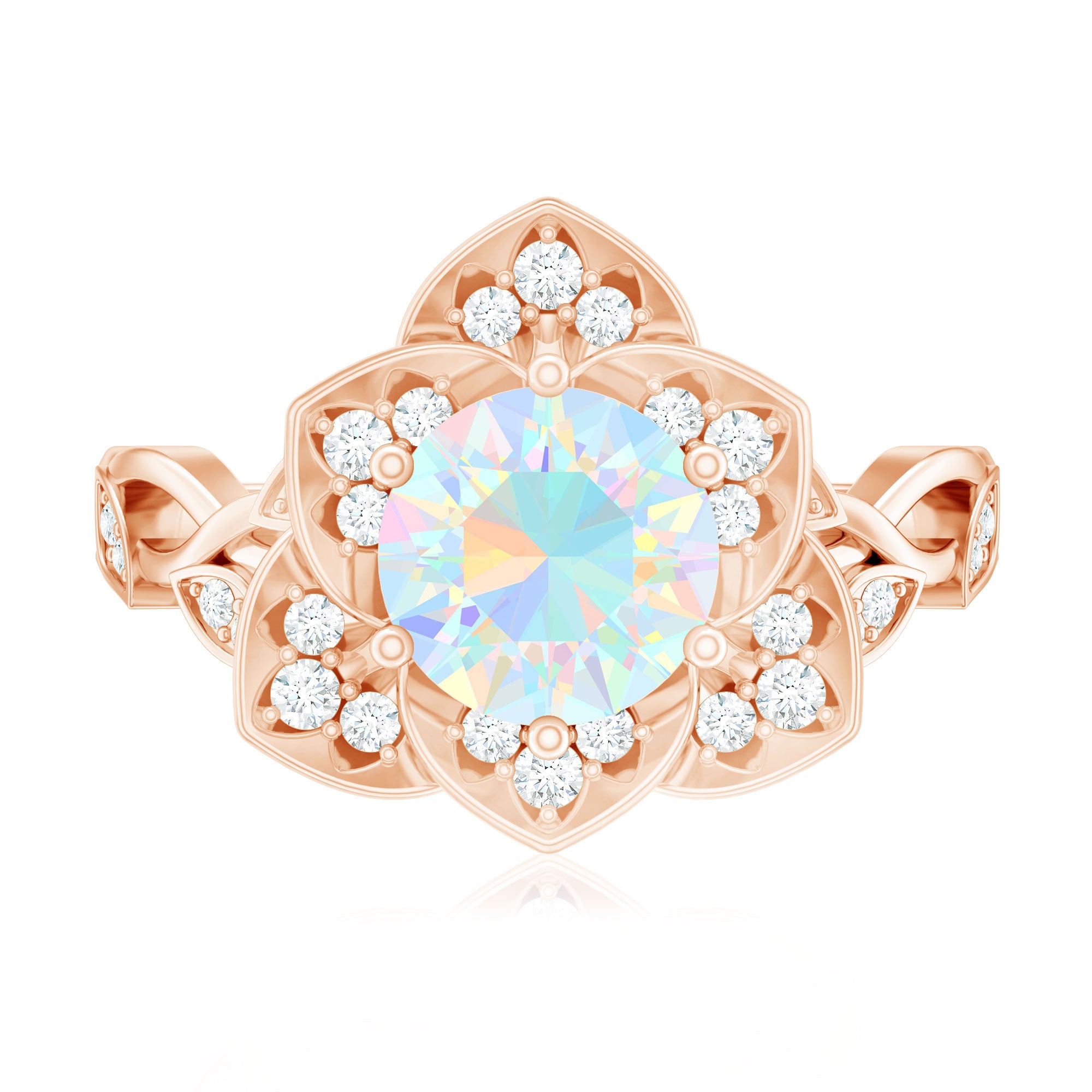 The combination of an opal centerpiece and floral-inspired design creates a ring that blends organic inspiration with classic jewelry craftsmanship. This style offers a refined alternative to traditional engagement ring designs.
