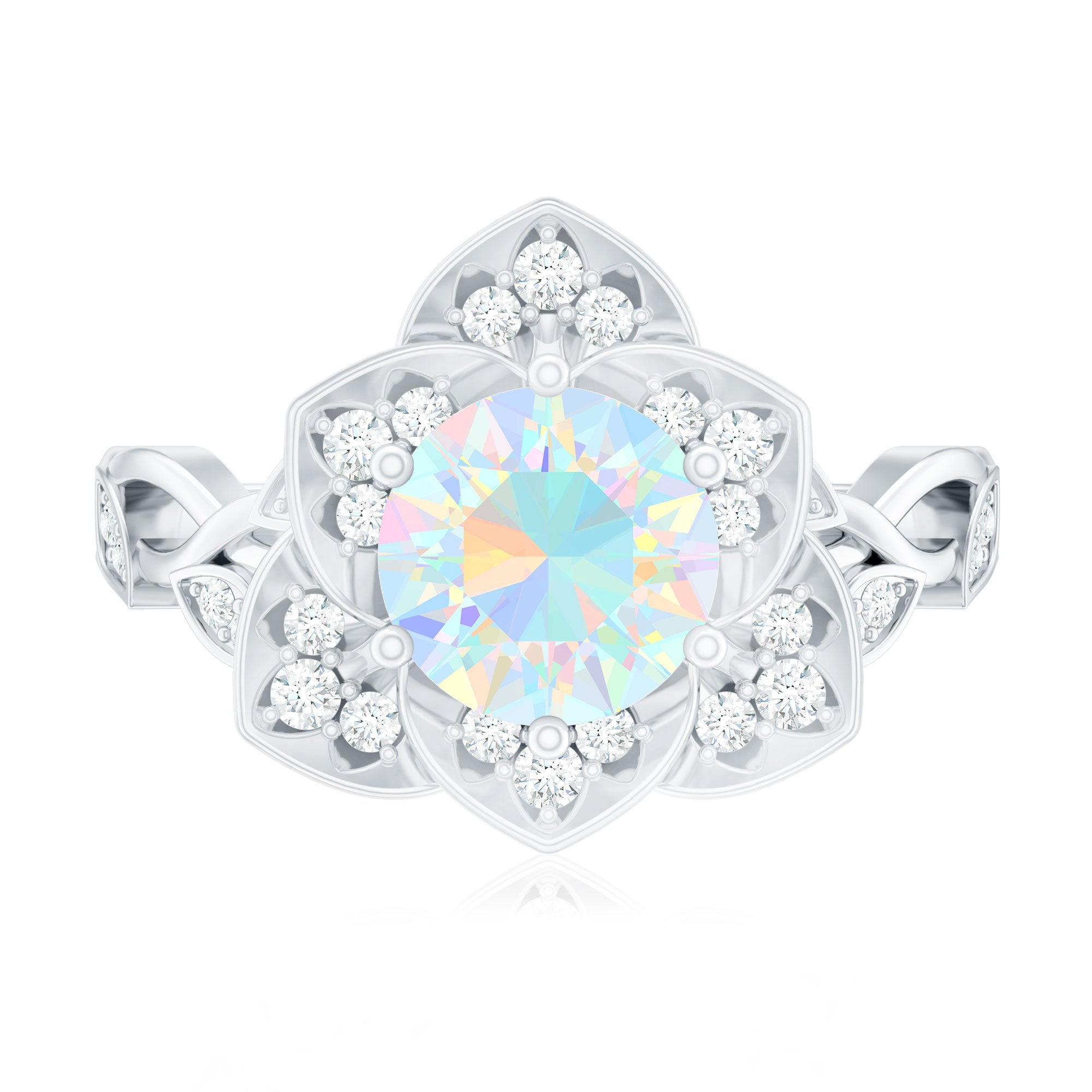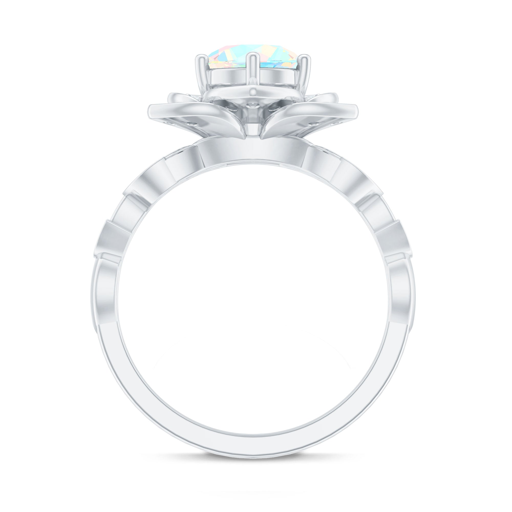 The design draws inspiration from the natural shape of a flower, with the center gemstone framed by surrounding accents that resemble petals. This structure highlights the opal while adding decorative detail that enhances the ring’s overall aesthetic.