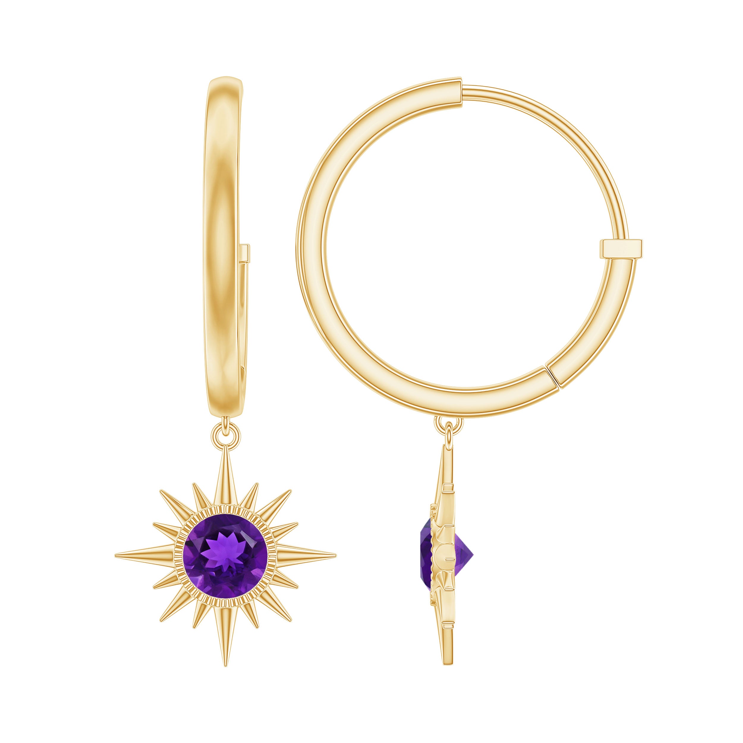 Bring a touch of elegance to your look with these Sunburst Earrings, a dazzling celebration of light, color and timeless beauty. Each earring features a 5 mm Round Shape Amethyst, symbolizing creativity and passion, set within a striking sunburst design that captures the warmth and energy of the sun itself. The Hoop Drop design adds graceful movement, allowing the earrings to shimmer and sparkle with every turn, making them perfect for both everyday glamour and special occasions. Crafted with precision, these Hoop Drop Earrings strike the perfect balance between contemporary style and classic sophistication, effortlessly elevating any outfit. Arriving in a signature jewelry box, these Amethyst Drop Earrings are ready to gift for birthdays, anniversaries or simply to show your love in a meaningful way. Romantic, versatile and eye-catching, these Amethyst Hoop Earrings are a wearable expression of joy. Let them illuminate your style and become a signature sparkle that captures hearts wherever you go.