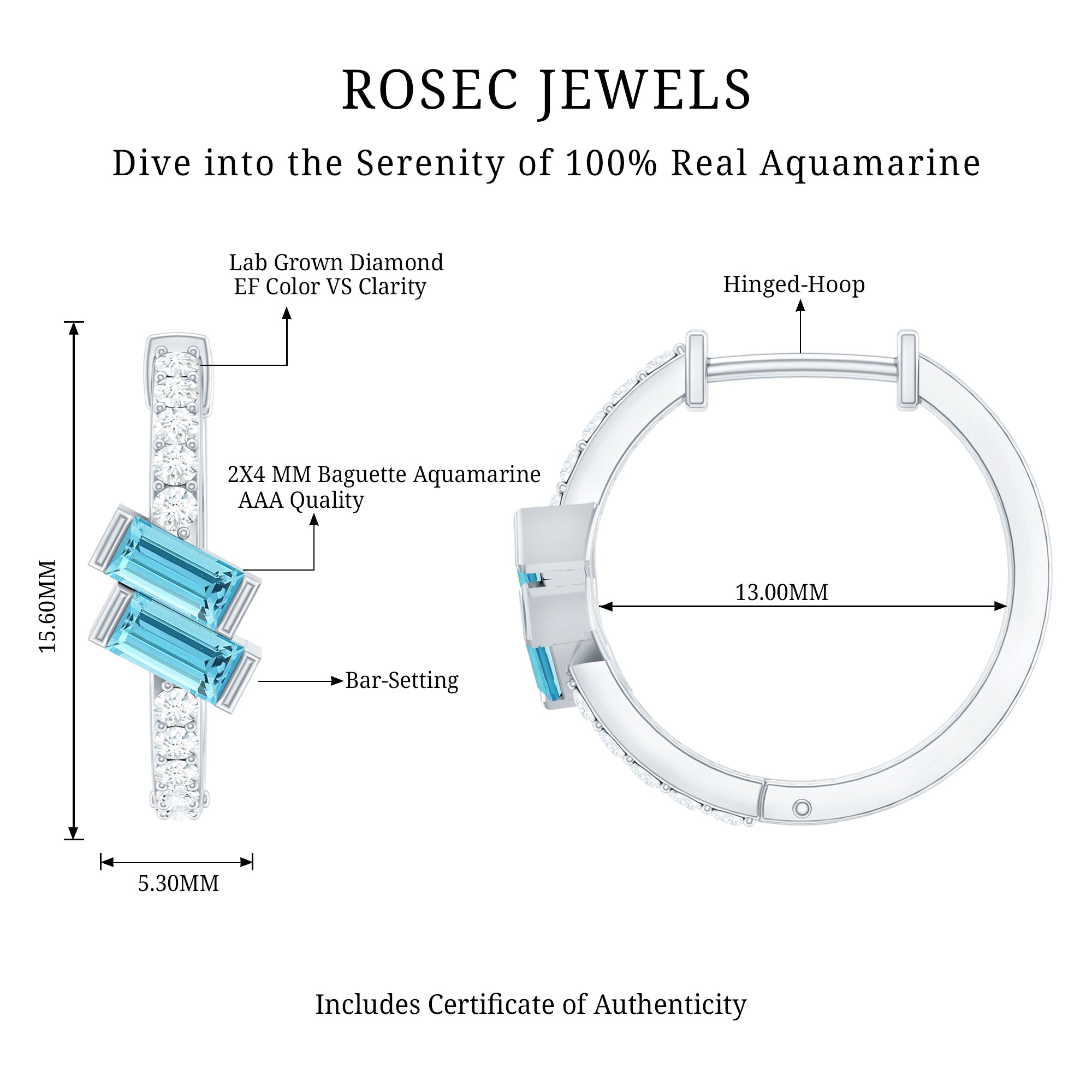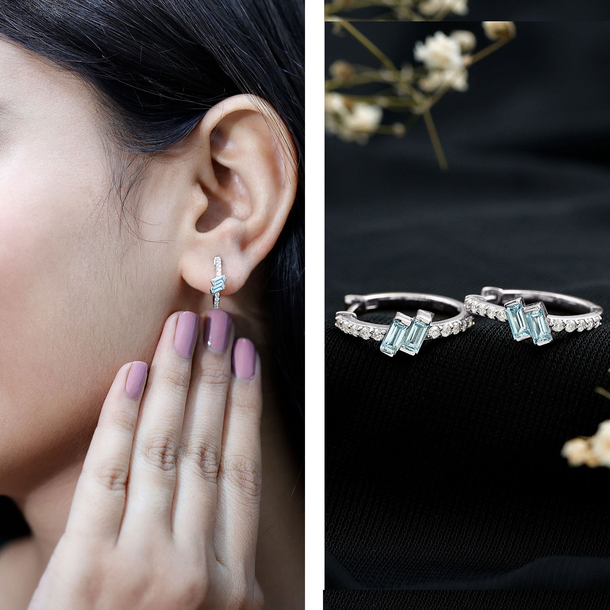 These Aquamarine Hoop Earrings are sure to turn heads and steal the spotlight wherever you go. Perfect for adding a touch of elegance and modern flair to any outfit, these Hinged Hoop Earrings feature two stunning 2X4 mm Baguette Shape AAA Quality Aquamarine gemstones, artfully set in a slightly slanted design over the hoop. This unique placement gives the earrings a contemporary and chic look. To elevate their sparkle even further, the Aquamarine Earrings are adorned with shimmering Lab Grown Diamond stones of EF-VS Quality, creating a perfect balance of color and radiance. These Aquamarine Diamond Earrings are versatile enough to pair with both casual and formal ensembles, whether it is a brunch date, office meeting, or glamorous evening event, they will effortlessly complete your look with grace and sophistication. The combination of natural Aquamarine gemstones and Lab Grown Diamond stones offers both luxury and sustainability, making them a smart and stylish choice. Presented in an elegant signature jewelry box, these Aquamarine Earring Silver also make a thoughtful gift for someone special.