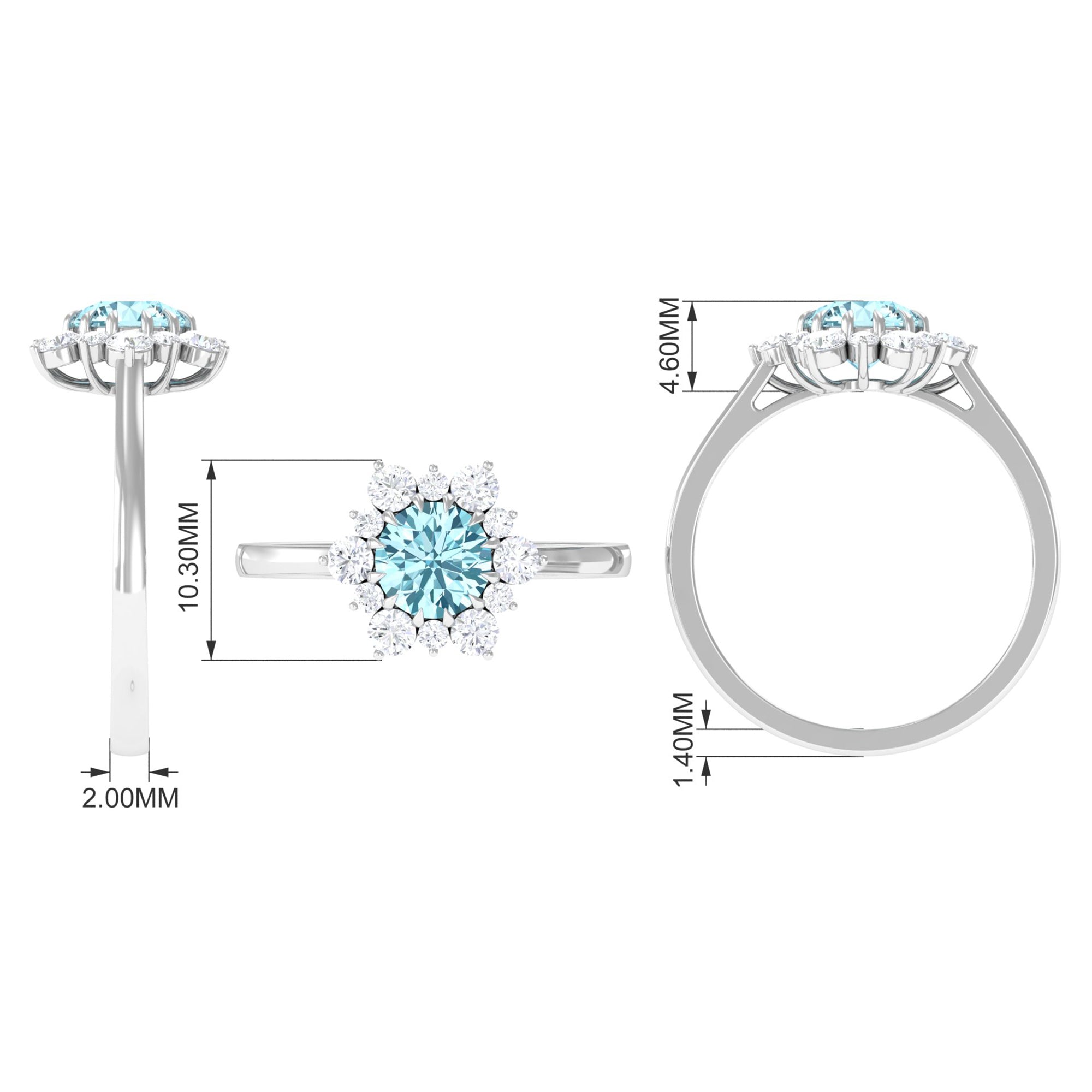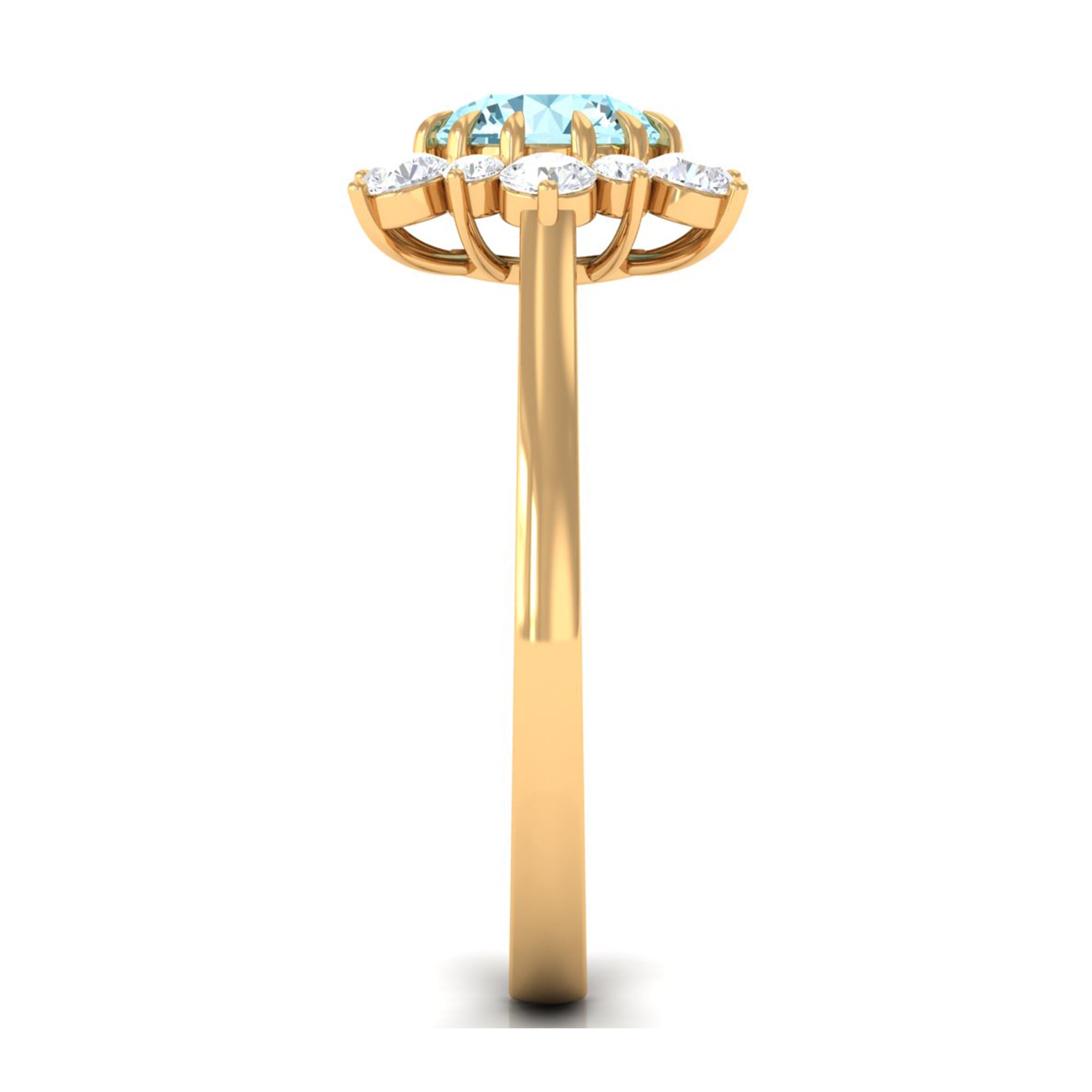 Exude grace with this elegant Classic Aquamarine Ring, showcasing Round Shape Aquamarine in a Claw Setting with a Diamond Halo. This Halo Engagement Ring exudes luxury and allure, making it a truly captivating piece.