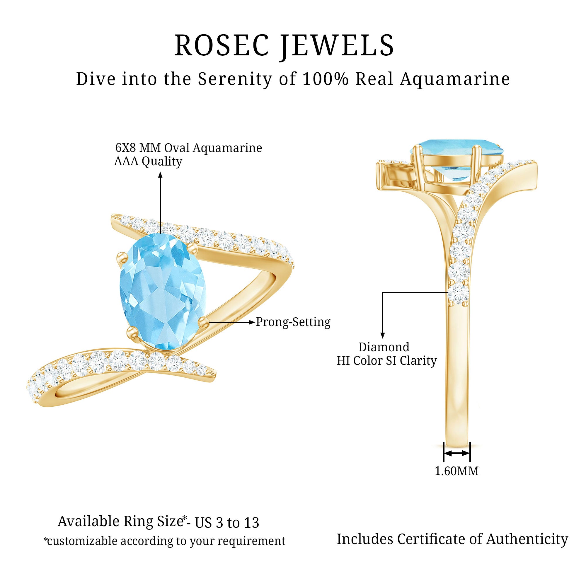 A synonym of grace, beauty and everlasting love, this Oval Engagement Ring is a true masterpiece that speaks the language of romance. At its center gleams a captivating 6X8 mm Oval Shape Aquamarine in Prong Setting, radiating a blue hue that symbolizes trust, harmony and the purity of true affection. The elegant Bypass Shank, adorned with dazzling Diamond stones, wraps gently around the centerpiece, creating a modern design that represents two souls coming together as one. Thoughtfully crafted to combine contemporary design with timeless sentiment, this Aquamarine Diamond Engagement Ring is ideal for the modern romantic who values both meaning and style. Presented in a signature jewelry box and available in various ring sizes, this Bypass Engagement Ring is ready to become a cherished token of love, whether given as an engagement ring or a heartfelt gift to celebrate the most beautiful moments of life. Elegant and effortlessly radiant, this Oblong Engagement Ring captures the essence of everlasting connection, a dazzling reminder that true love shines brightest when two hearts move together in perfect harmony.