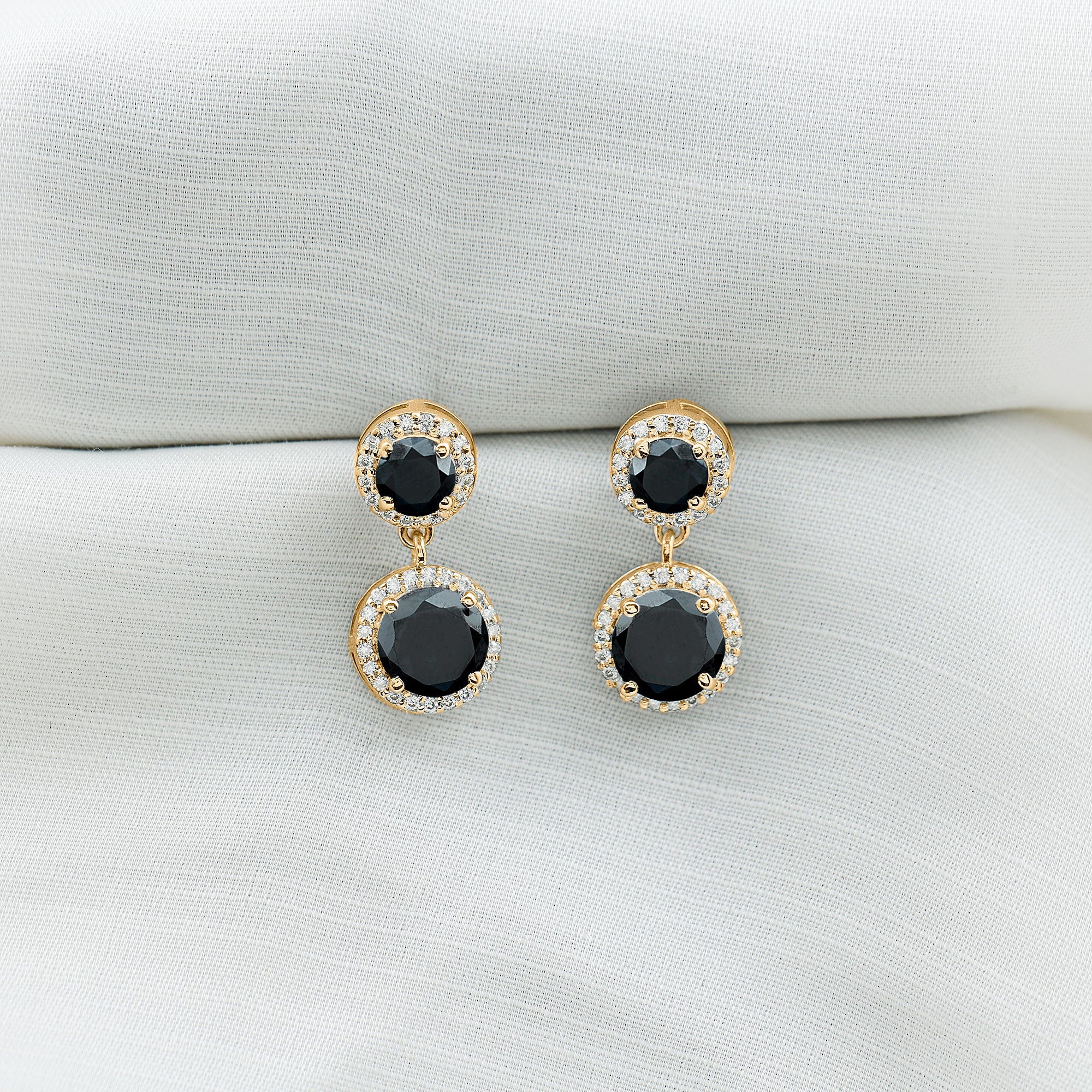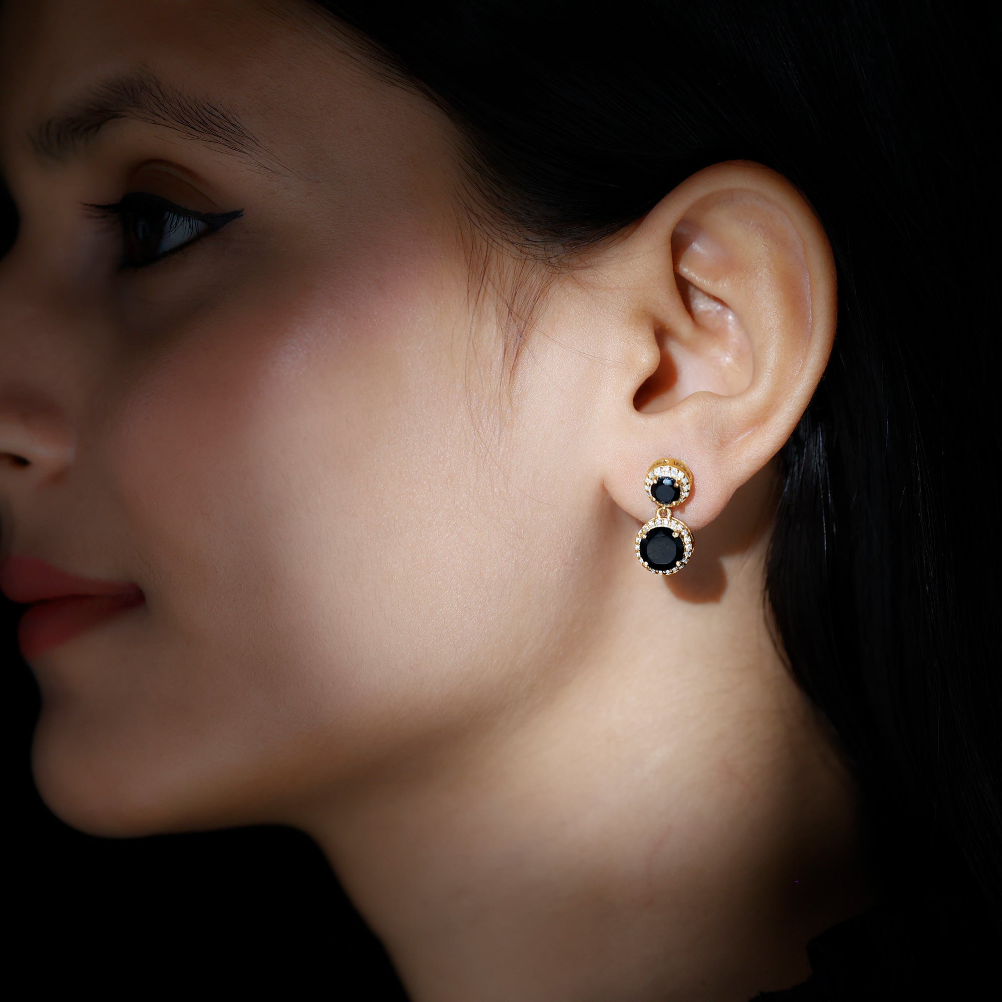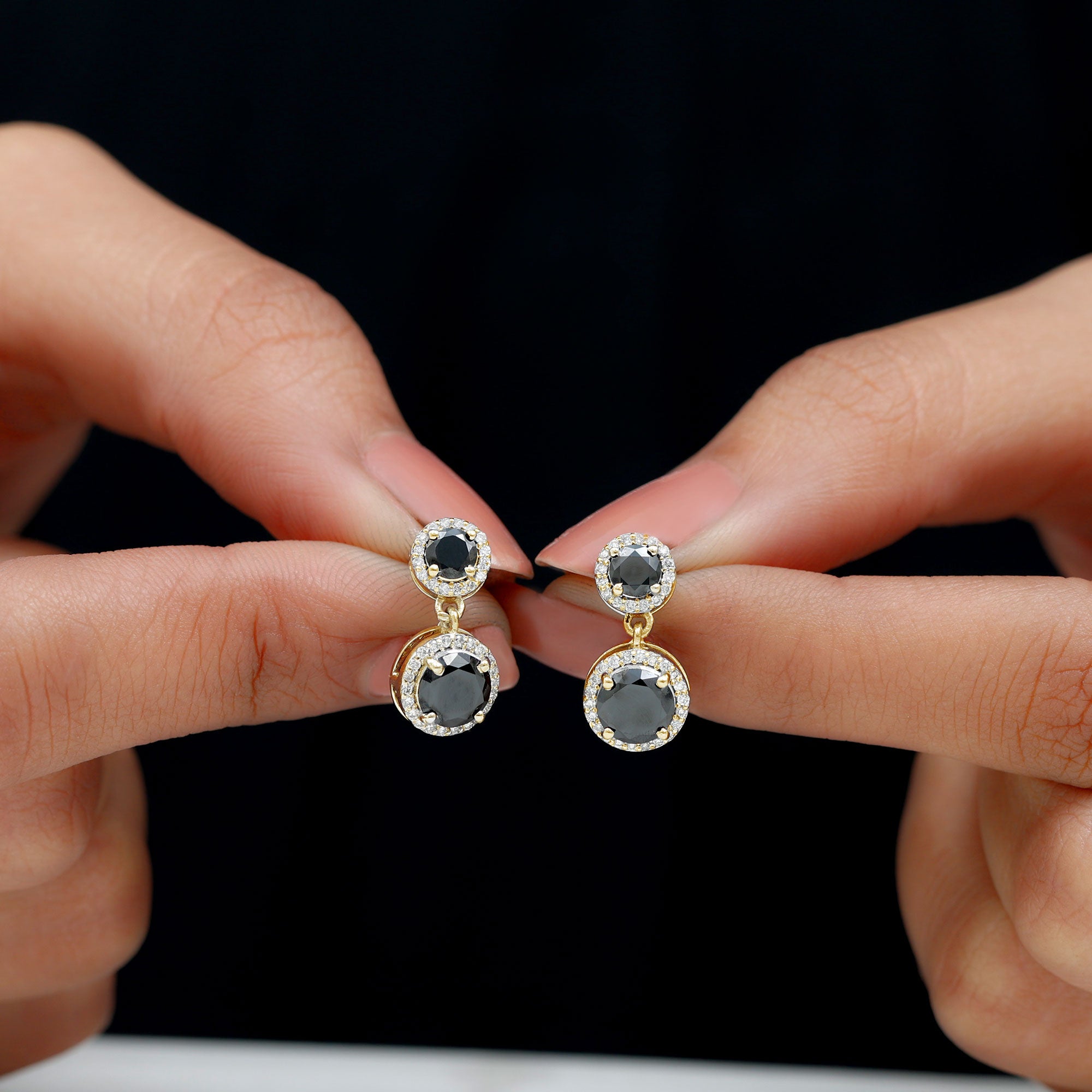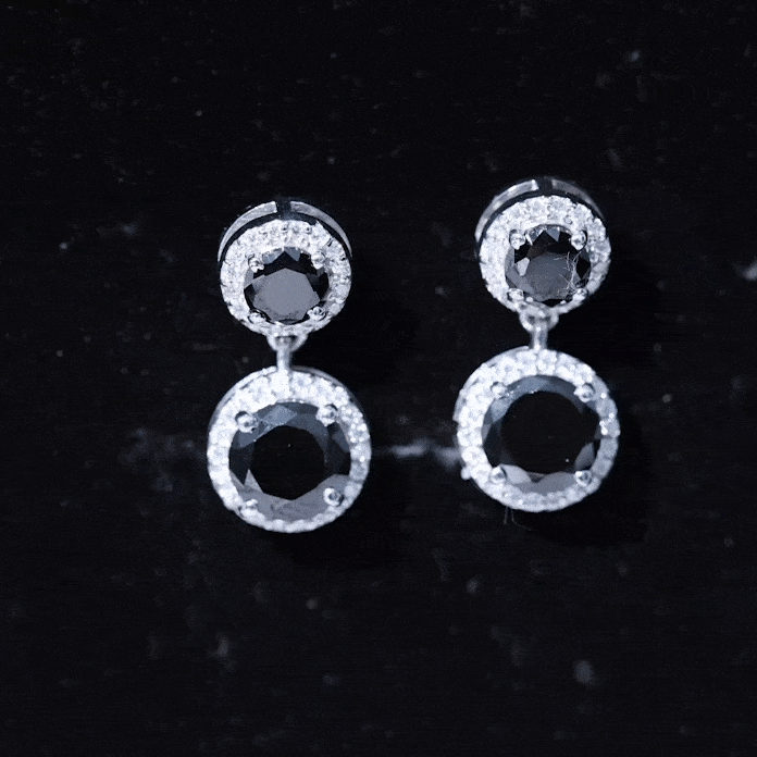 Bold elegance flows through every detail of this Black Onyx Dangle Earring, crafted with a striking black and white contrast that captures attention instantly. Featuring a 5 MM round black onyx at the top and an 8 MM round black onyx gracefully hanging below, the design creates a beautiful balance of sophistication and movement. Each gemstone is surrounded by a sparkling moissanite halo, adding radiant brilliance that highlights the deep richness of the onyx. Set in secure prong setting, the stones shine brightly from every angle, giving the Halo Earrings a luxurious look. The graceful dangle drop style adds soft motion, making these Black and White Earrings perfect for both special events and everyday elegance. A reliable screw-back closure ensures comfort and security, so they stay in place all day. The classic combination of AAA quality black onyx and D-VS1 quality moissanite blends seamlessly with any outfit, from modern and minimal to glamorous and bold.