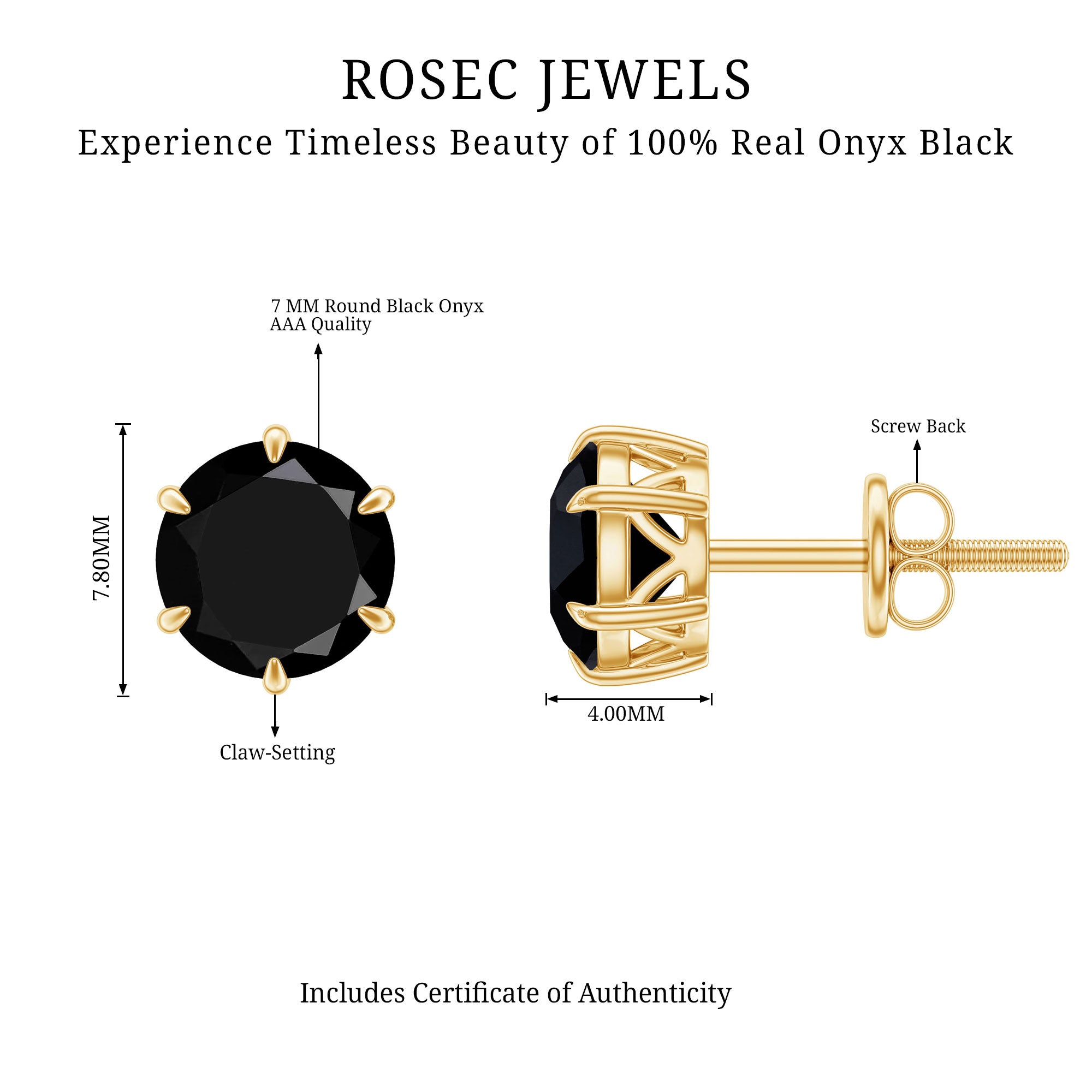 Simply stunning, these Black Onyx Stud Earrings are a beautiful way to celebrate elegance. Featuring 7 mm Round Shape Black Onyx in Claw Setting, these Stud Earrings radiate a sophisticated charm that pairs effortlessly with any outfit, from casual daytime looks to glamorous evening wear. The rich black hue of the AAA Quality Onyx symbolizes strength and protection, making these Black Onyx Ear Studs a stylish accessory but also a thoughtful lucky charm for December-born beauties. Designed with secure Screw Back Closure, these Black Onyx Earrings offer all-day comfort while keeping your style effortless. Carefully presented in a jewelry box, these December Birthstone Earrings are ready to gift for birthdays, holidays or special moments that deserve a memorable touch. Wear them alone or paired with other favorites to add a subtle yet striking sparkle that draws attention most elegantly.