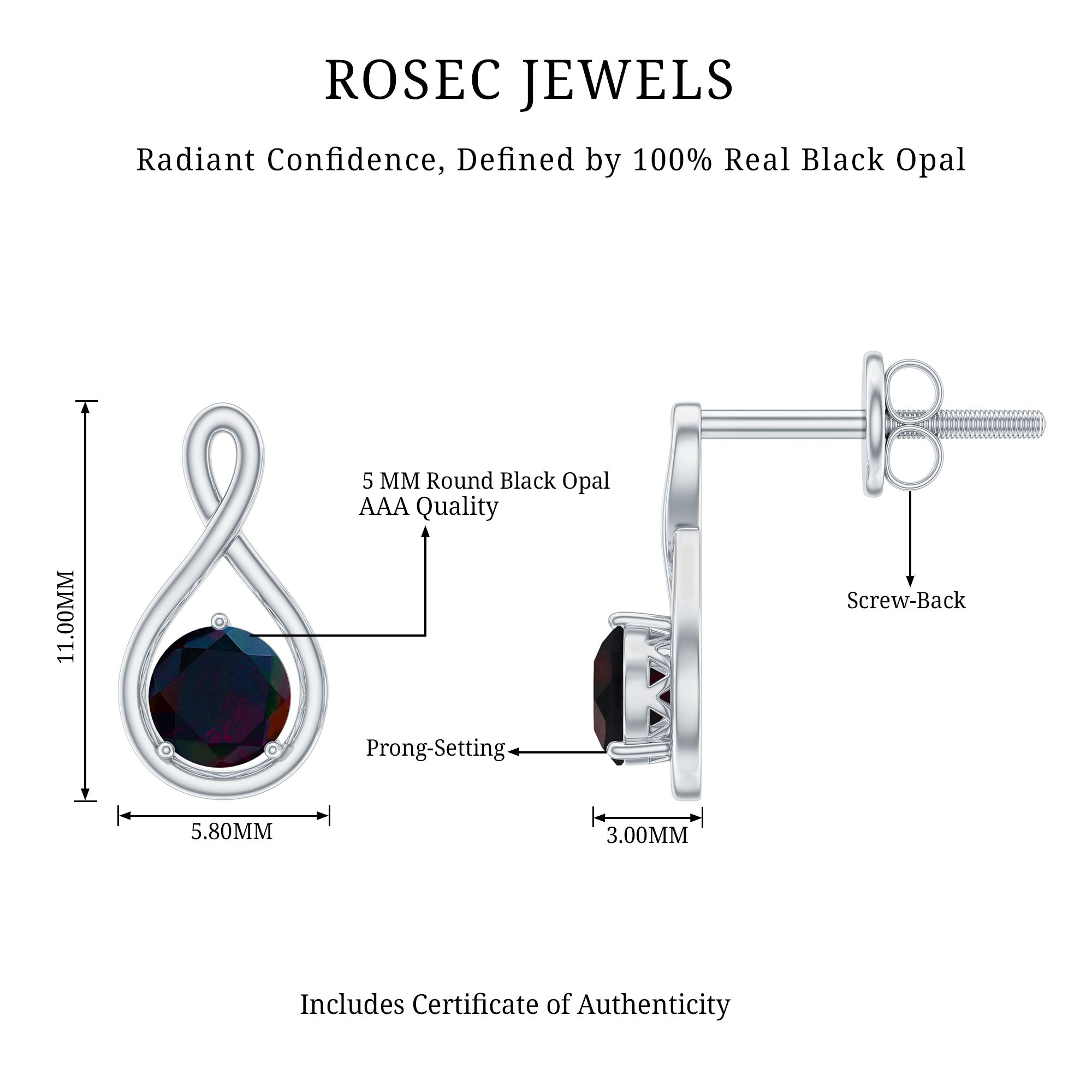 A symbol of endless love and effortless elegance, these Infinity Earrings are designed to make every moment feel a little more special. These Love Knot Earrings feature a captivating 5 mm Round Shape Black Opal set in Prong Setting within a graceful infinity loop, creating a meaningful design that represents forever, connection and a bond that never fades. The Black Opal shimmers with deep hues that shift beautifully with the light, adding depth and intrigue to any look. Secured with comfortable Screw Back Closure, these AAA Quality Black Opal Earrings offer both style and peace of mind, making them perfect for daily wear or special occasions. Their versatile design pairs beautifully with everything from chic dresses and elegant evening outfits to casual weekend looks. Ready to gift and presented in a lovely jewelry box, these October Birthstone Earrings make a heartfelt surprise for birthdays, anniversaries, holidays or simply to show someone how much they mean to you. Thoughtful, romantic and beautifully crafted, these Black Opal Stud Earrings are a timeless piece she will cherish every time she puts them on.