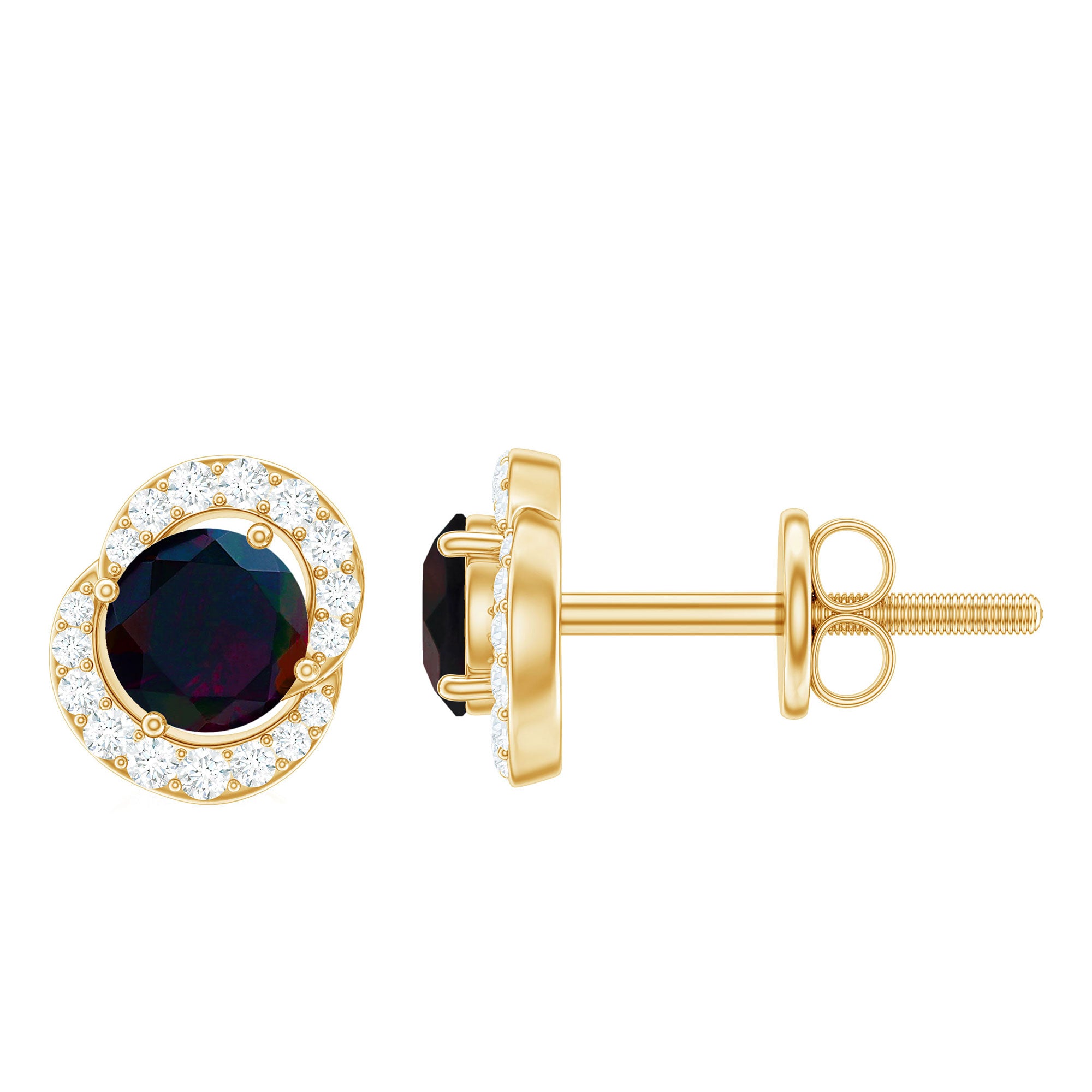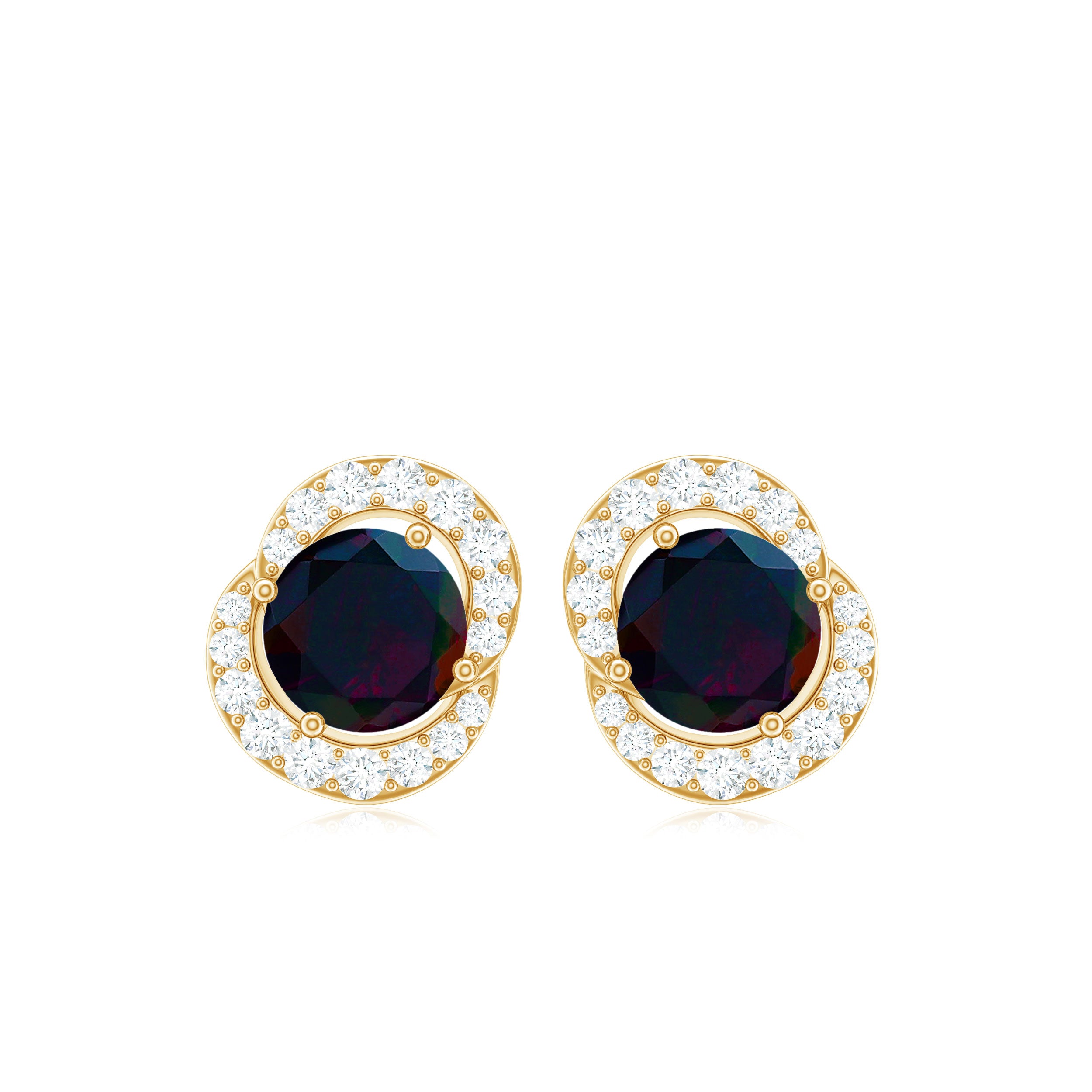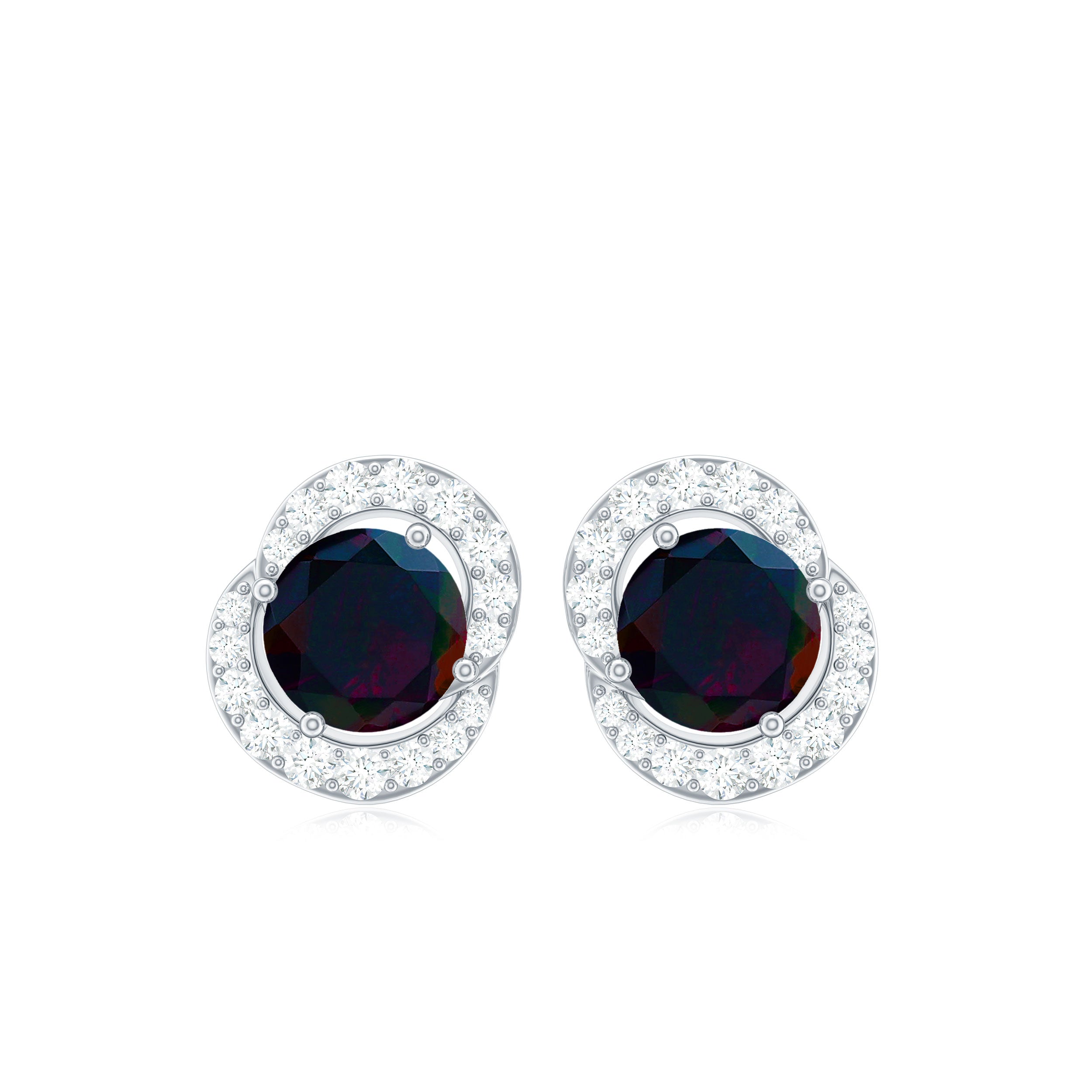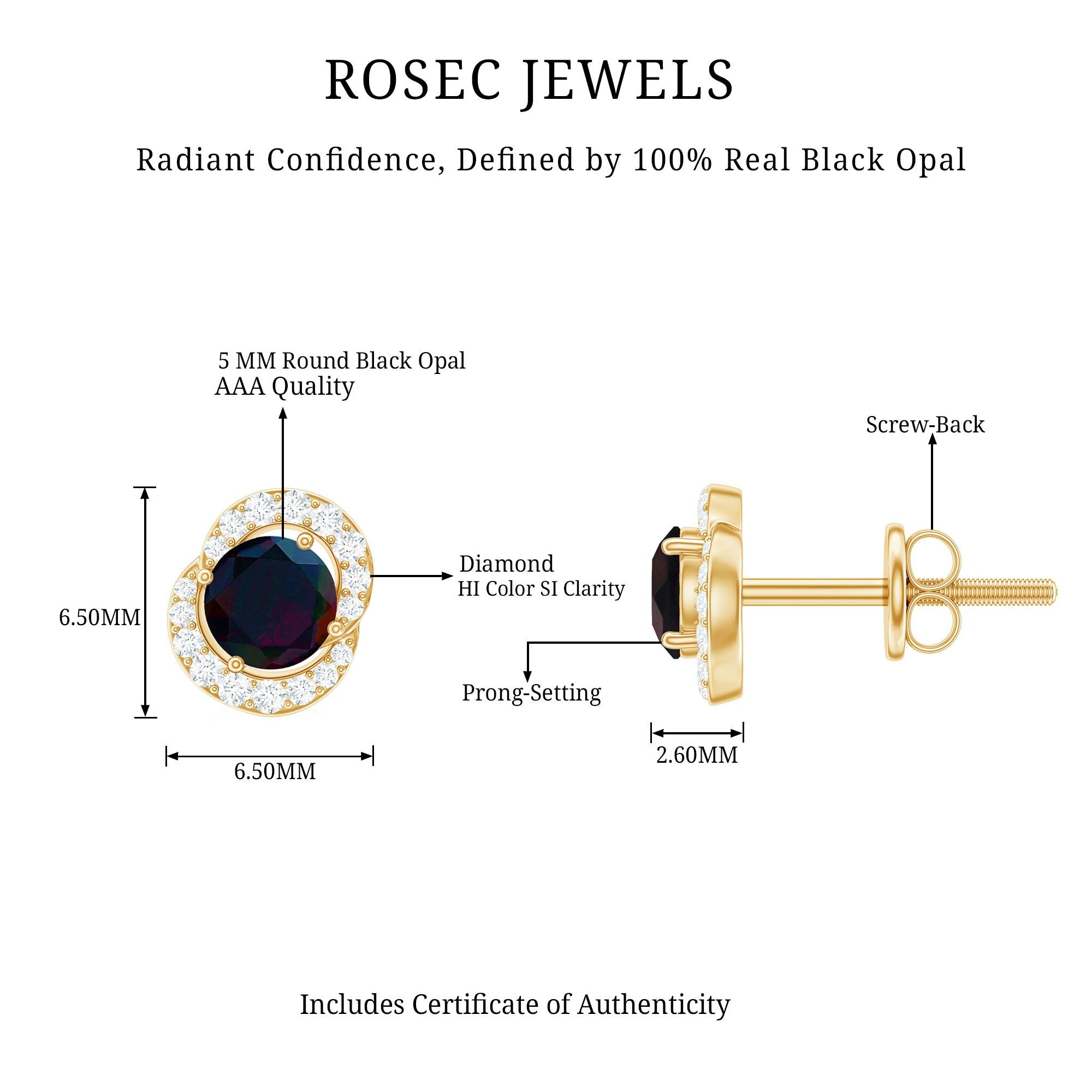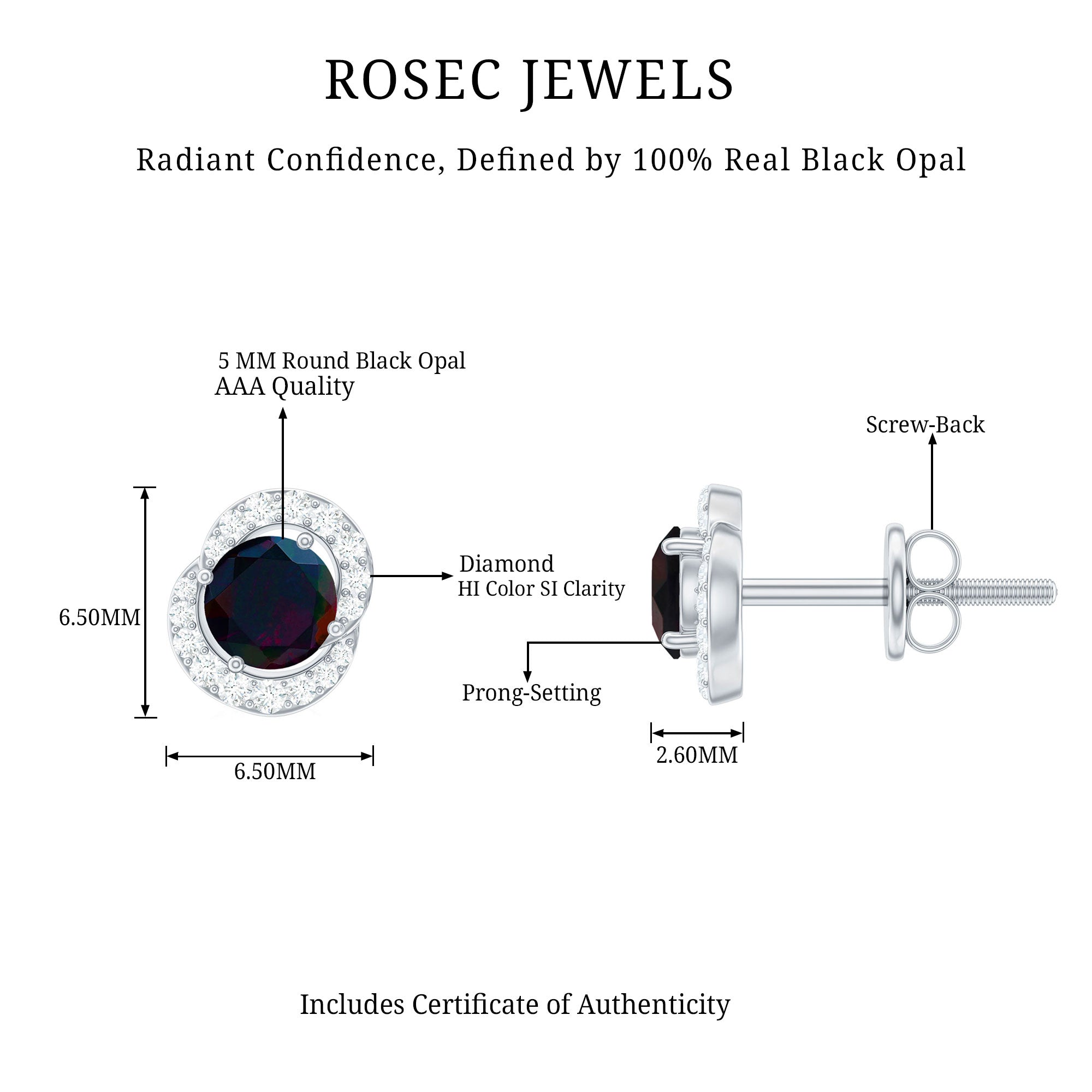 A captivating addition to your jewelry collection, these Black Opal Stud Earrings blend timeless elegance with a touch of mystical charm. Each earring showcases a stunning 5 mm Round Shape Black Opal at the center in 4 Prong Setting, glowing with dark hues. Surrounding the Black Opal, sparkling Diamond stones add a gentle brilliance to these Stud Earrings. The combination creates a look that feels both refined and enchanting, perfect for anyone who loves jewelry with character and depth. Crafted with secure Screw back Closure, these Black Opal Earrings are comfortable to wear throughout the day, whether you are heading to a special dinner or simply elevating your everyday style. Ready to gift and presented in a signature jewelry box, these Black Opal Diamond Earrings make an unforgettable surprise for birthdays, anniversaries, holidays or any moment worth celebrating. Elegant, meaningful and beautifully detailed, these Black and White Earrings will quickly become a cherished favorite.