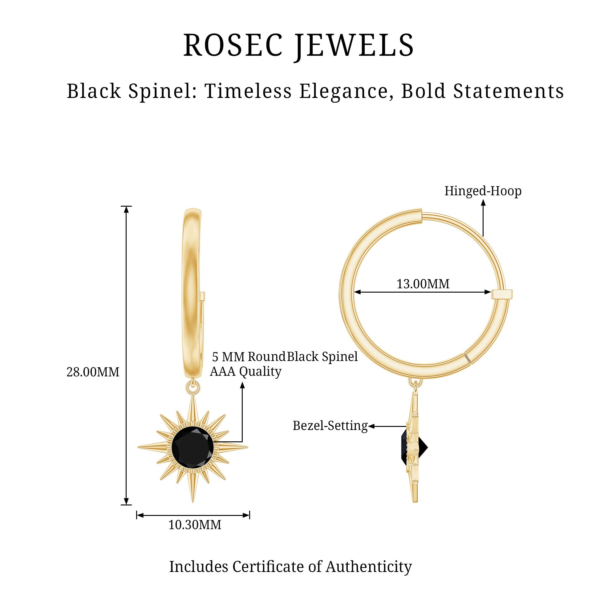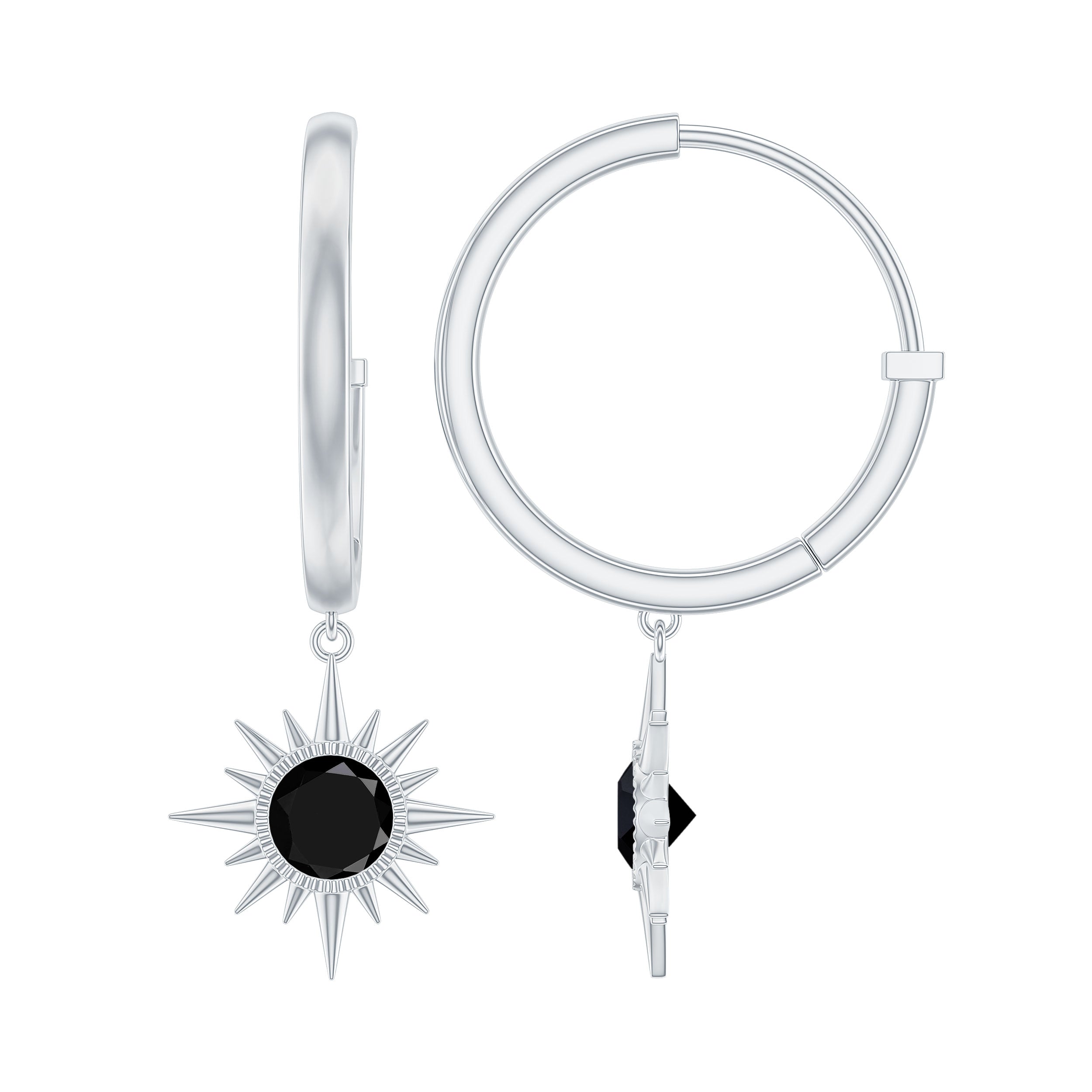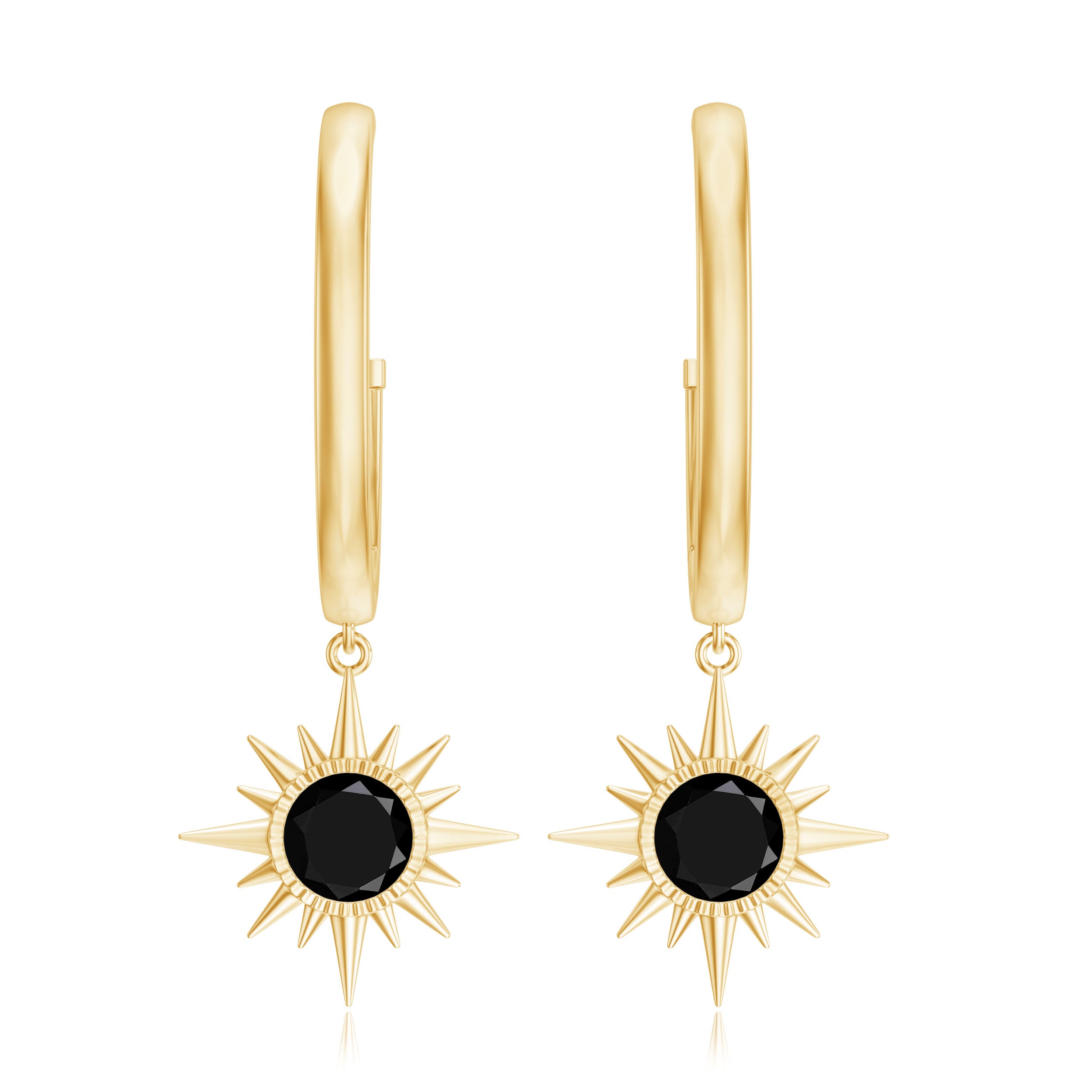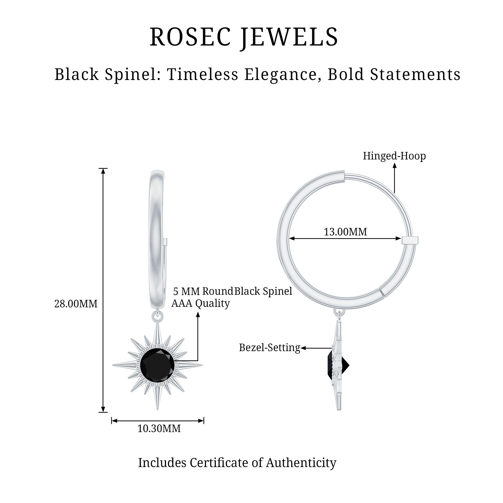Shine bright with these Sunburst Earrings, a statement piece designed to add a touch of luxury to any look. The striking sunburst design features 5 mm Round Shape Black Spinel that shimmer with every movement, creating a bold yet elegant focal point. Suspended from a Hinged Hoop, these Black Spinel Earrings offer a secure fit while adding movement to your ensemble. Whether you are heading to a formal event, a night out with friends or simply want to elevate your everyday style, these Hoop Drop Earrings are the perfect choice. The mysterious AAA Quality Black Spinel adds a touch of drama, while the sunburst shape brings a playful twist to your accessory game. Crafted with care and presented in a beautiful jewelry box, these August Birthstone Earrings are ready to gift to someone special or keep for yourself as an eye-catching treat. Pair these versatile earrings with everything from casual outfits to evening wear and let their sparkle take your style to the next level. With their modern yet timeless appeal, these earrings are sure to turn heads and become your new favorite go-to accessory.