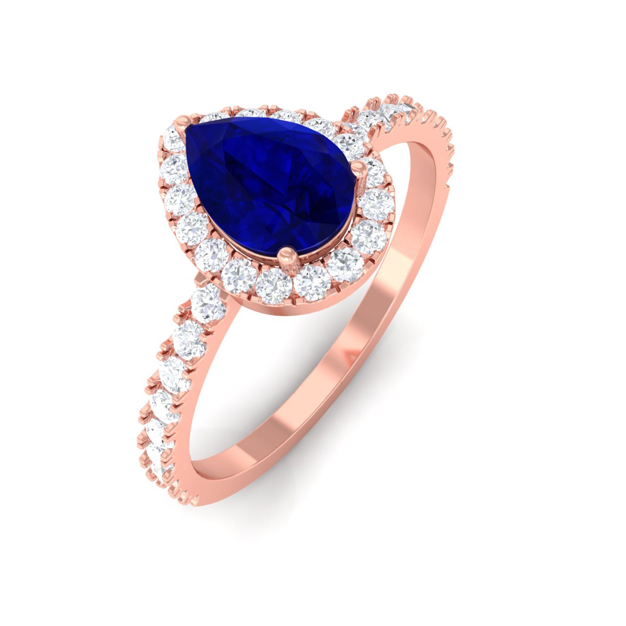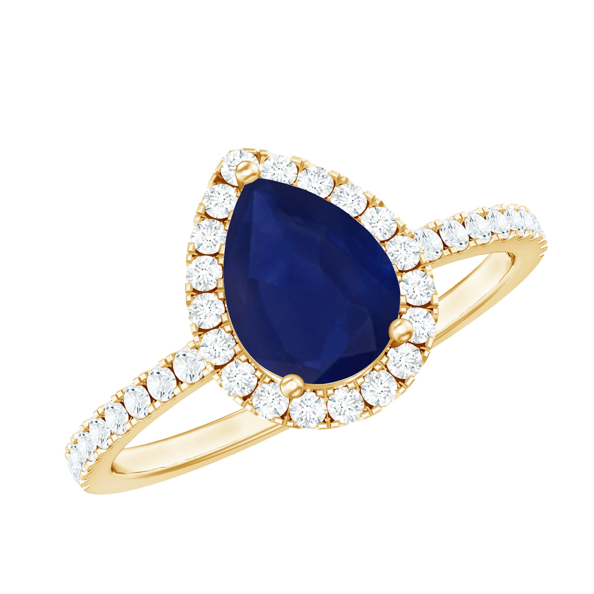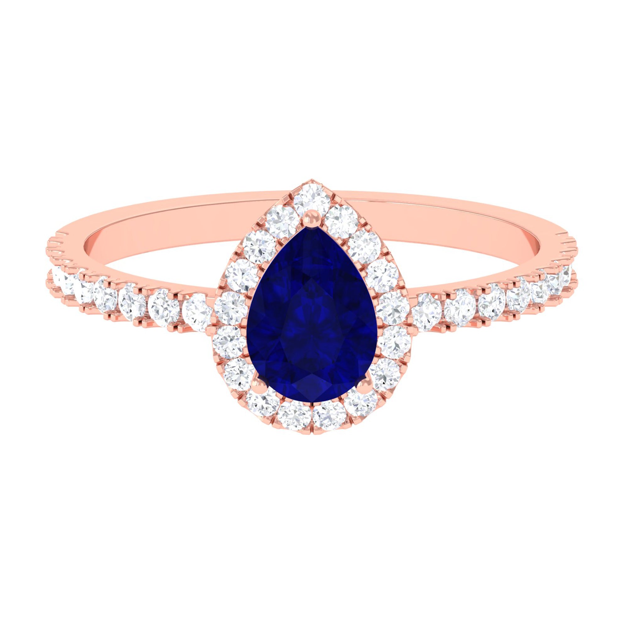 This engagement ring features a natural blue sapphire center in a teardrop shape, framed by a diamond halo. The design emphasizes elongated proportions, saturated color, and enhanced brilliance through its halo setting.