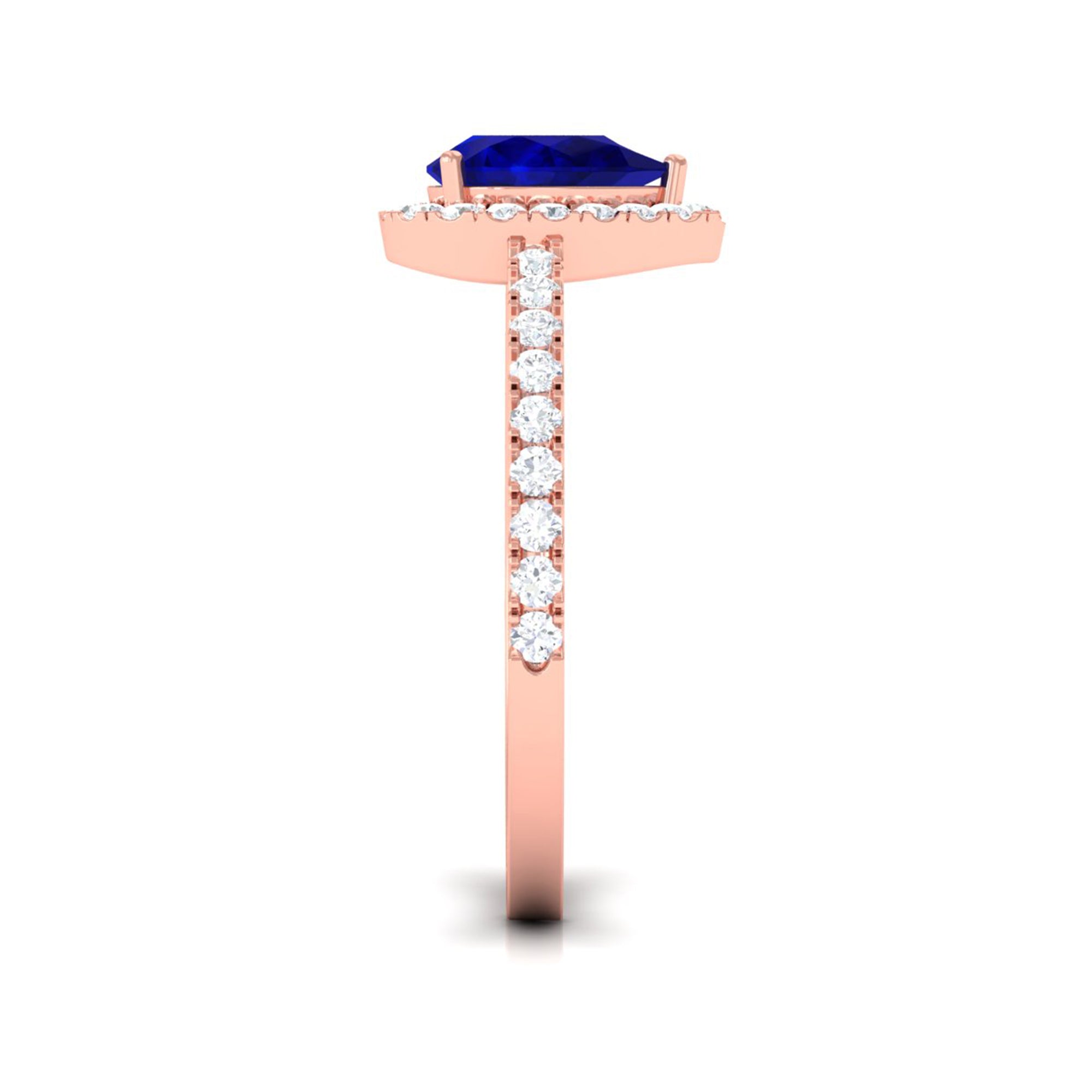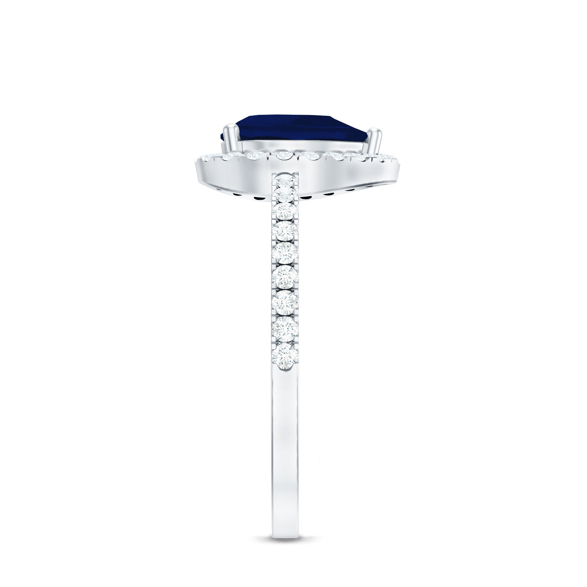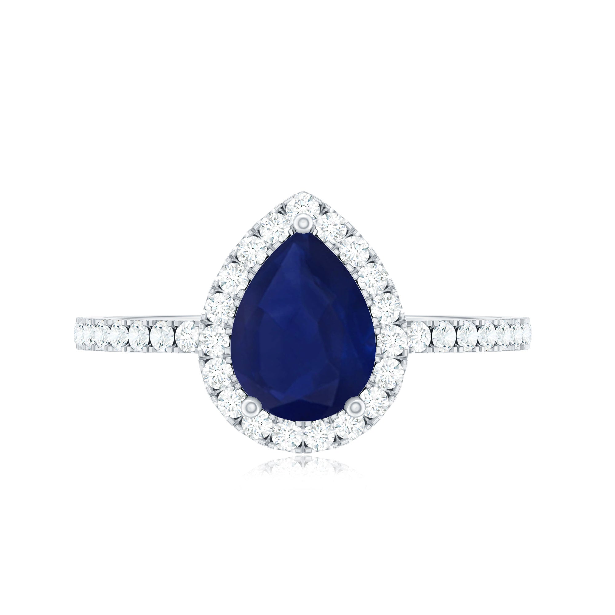 This engagement ring features a natural blue sapphire center in a teardrop shape, framed by a diamond halo. The design emphasizes elongated proportions, saturated color, and enhanced brilliance through its halo setting.