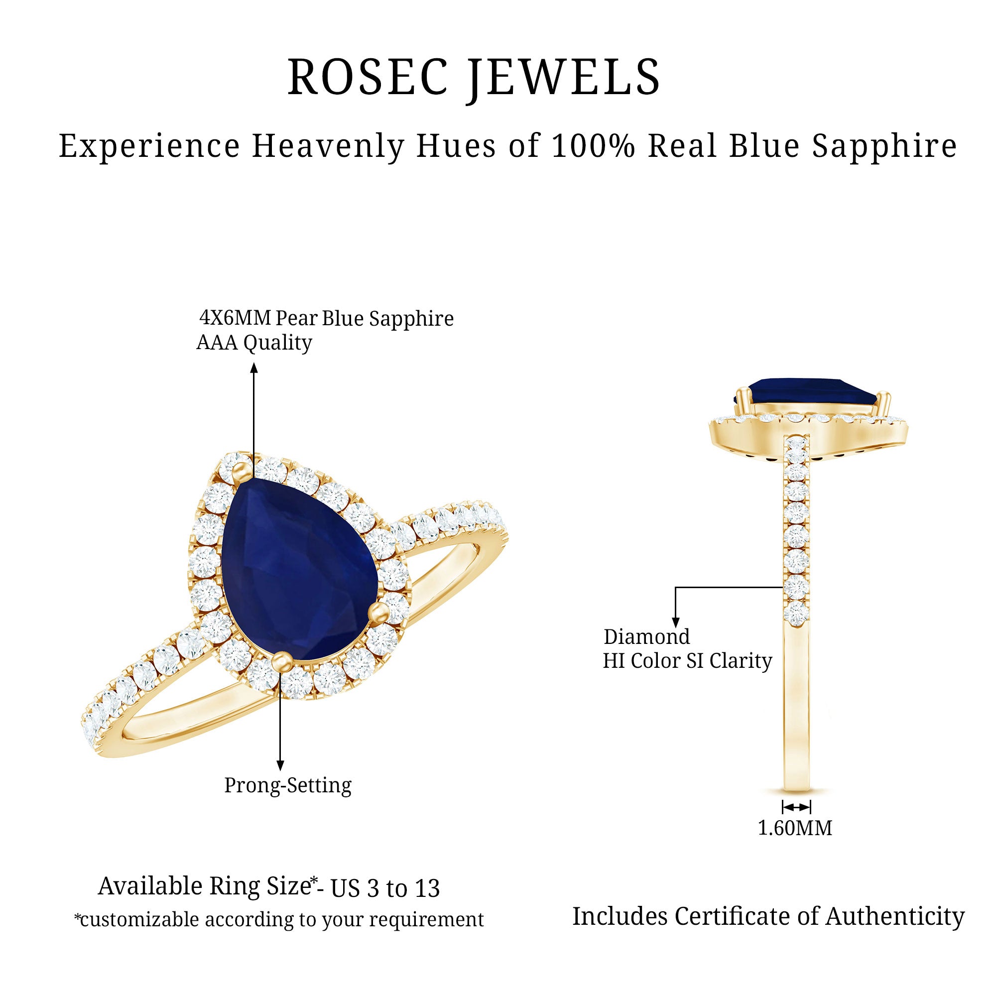 The deep blue sapphire offers classic sophistication, making this ring a meaningful choice for proposals that honor tradition with a distinctive shape.