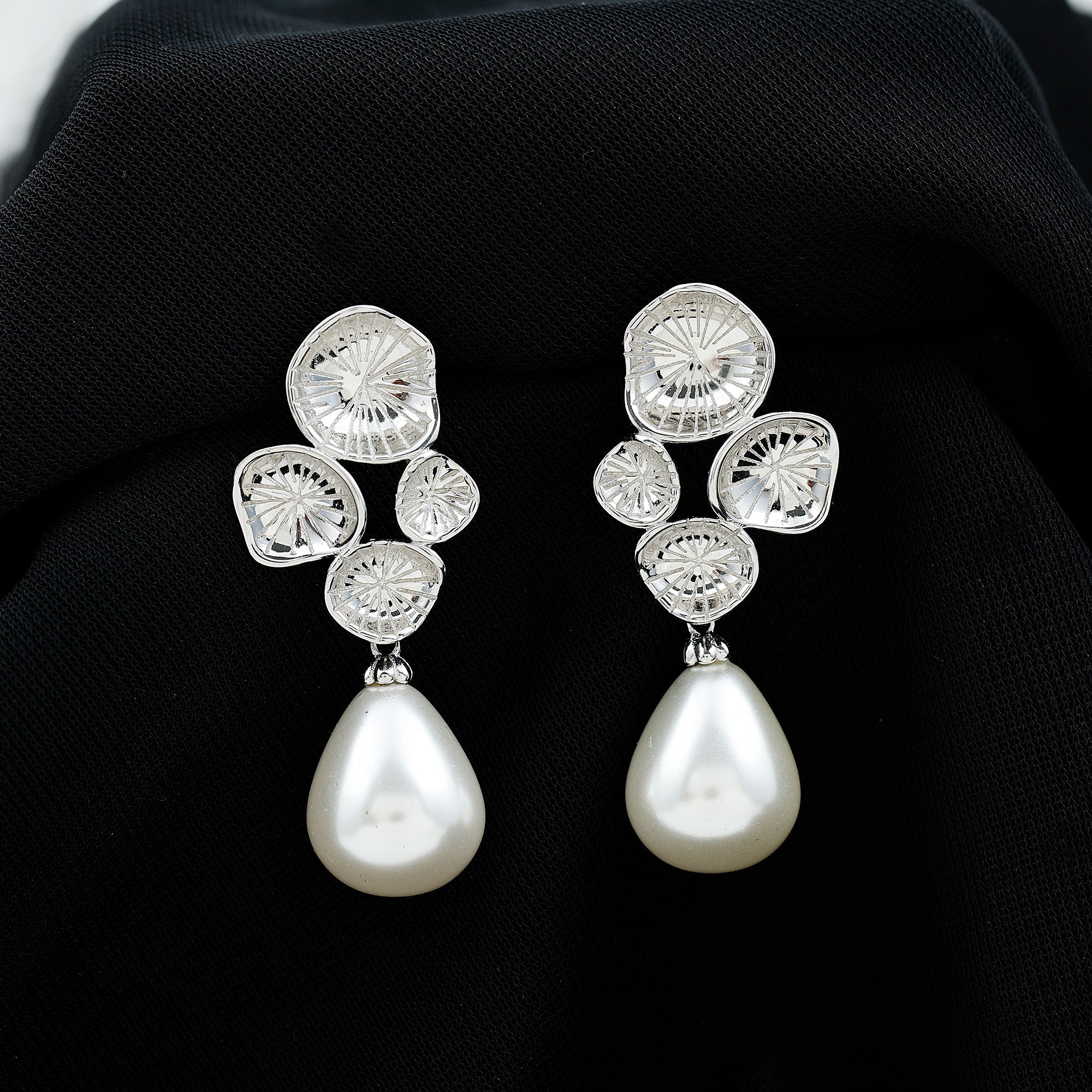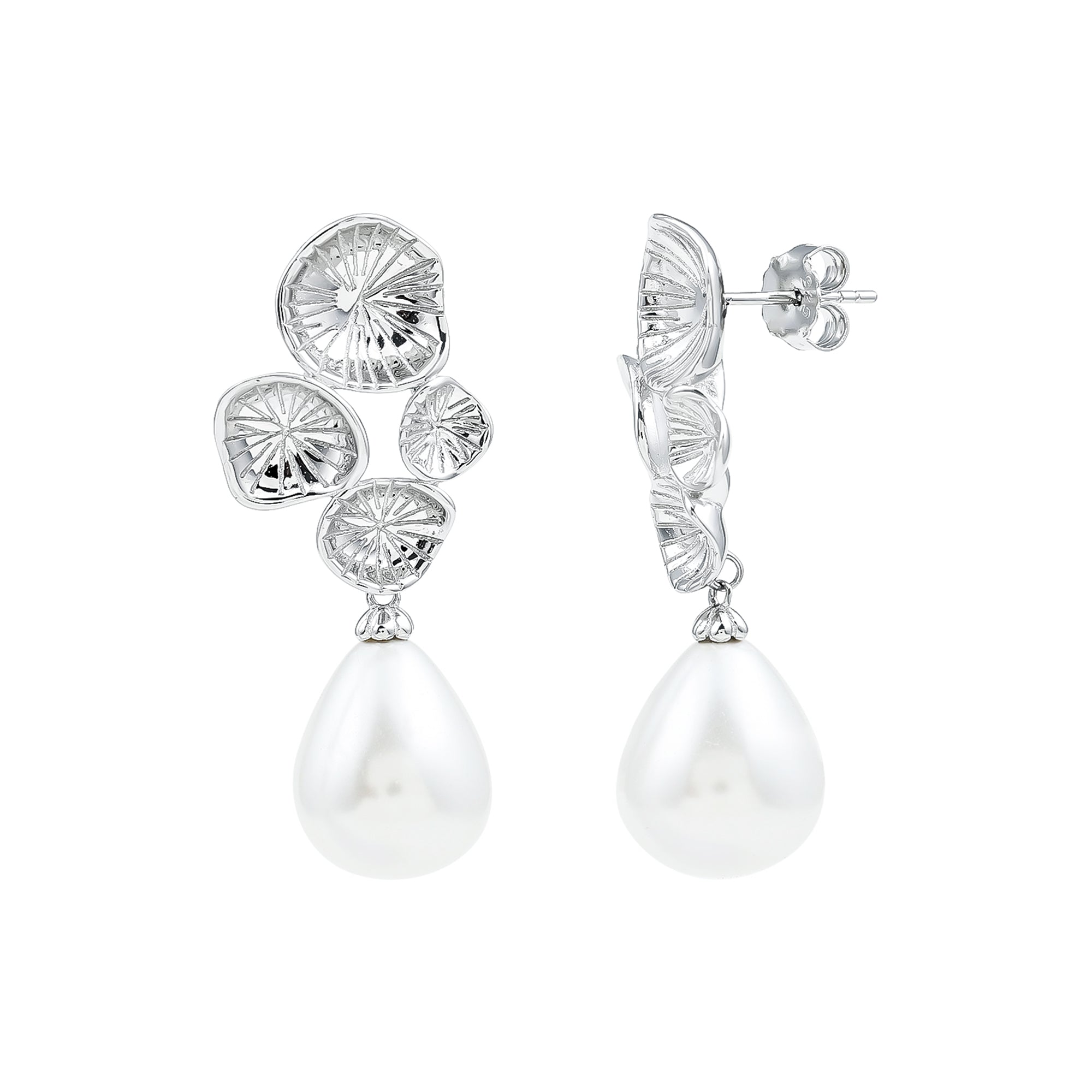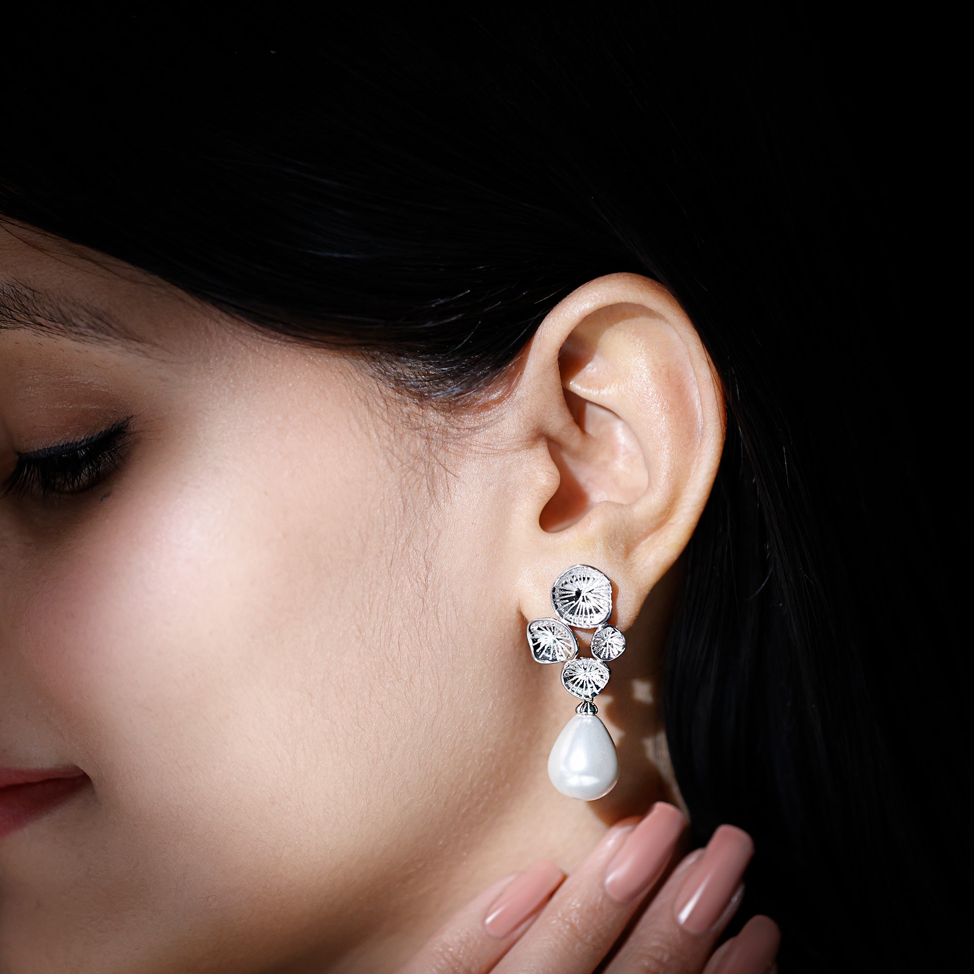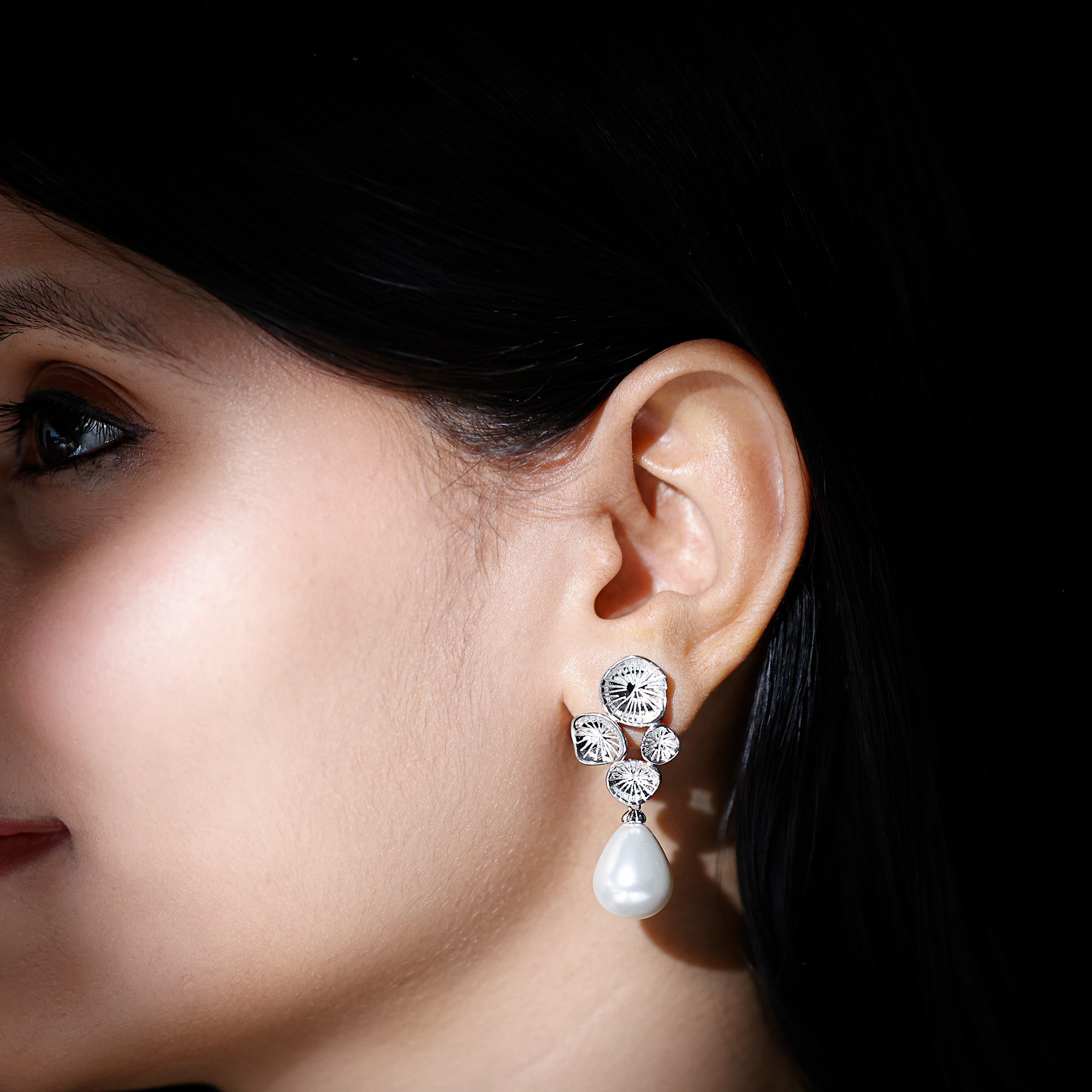 Upgrade your look with our stunning Pearl Drop Earrings - a fabulous design that is sure to boost your fashion game! Handcrafted from 14K White Gold Plated Sterling Silver. Step into elegance with our Bridal Drop Earrings, showcasing a 12X15 MM Teardrop Shaped Freshwater Pearl hanging from a cluster of sterling silver shells, capturing the beauty of the sea. The gentle movement of pearls within the silver shell cluster embodies the grace of the ocean, creating a timeless link between nature and bridal jewelry. The secure screw-back closure guarantees that style and comfort are always prioritized. Unleash the charm and surprise her with something special for her birthday or anniversary with these Pearl Dangle earrings. A gift that is sure to leave a lasting mark on her heart. Effortlessly enhance any outfit with our one-of-a-kind Freshwater Pearl Earrings. The ideal accessory for every special event - whether it is a cocktail party, date night, wedding, or prom night glam. These gorgeous Pearl Wedding Earrings are a pair that will make you shine in any crowd.