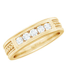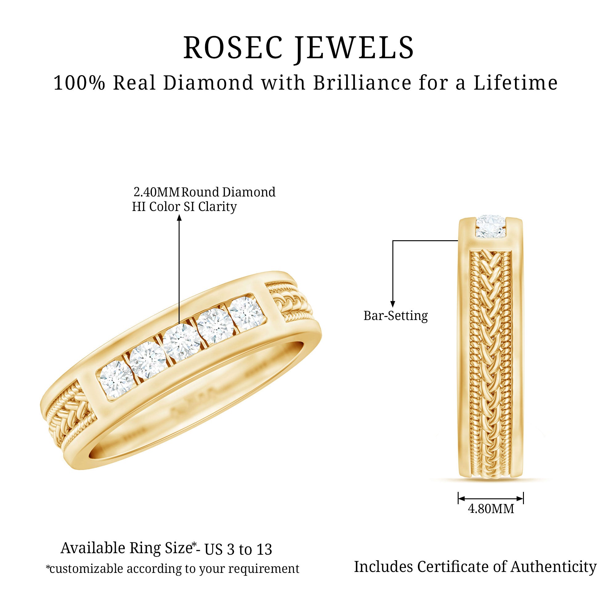 Seeking something out of the box without ditching the classics for your man? Your hunt ends on our Diamond Braided Band Ring. It is adorned with a shimmery parade of five stones of Round Shape Diamond in the center, held by Bar Setting, taking their turns at wooing us over. Lending it an eye-striking visual interest, this Diamond Band Ring has been braided on the sides. Teamed up with casuals or formals, it wont fail to make a befitting statement.