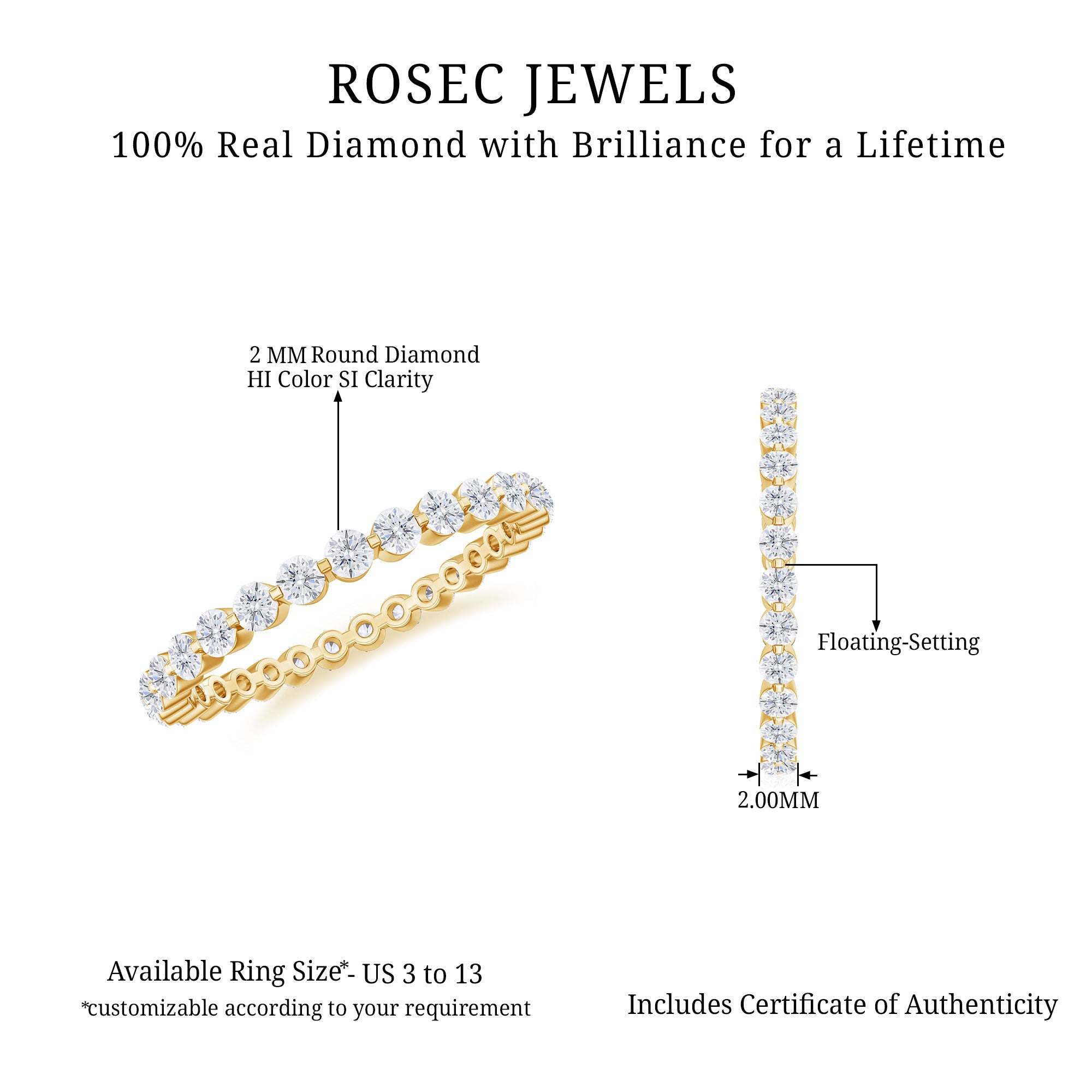 Show your love and devotion to the most special person in your life with our Diamond Full Eternity Ring. This exquisite ring features a full band of dazzling diamond gemstones, crafted in a Floating Eternity style, that adds a touch of shimmer to even the dullest of days. This precious piece of jewelry is the perfect way to express your love and make your beloved feel cherished and adored. Add a touch of glamour and elegance to any occasion with this remarkable and timeless ring that will be treasured for a lifetime.