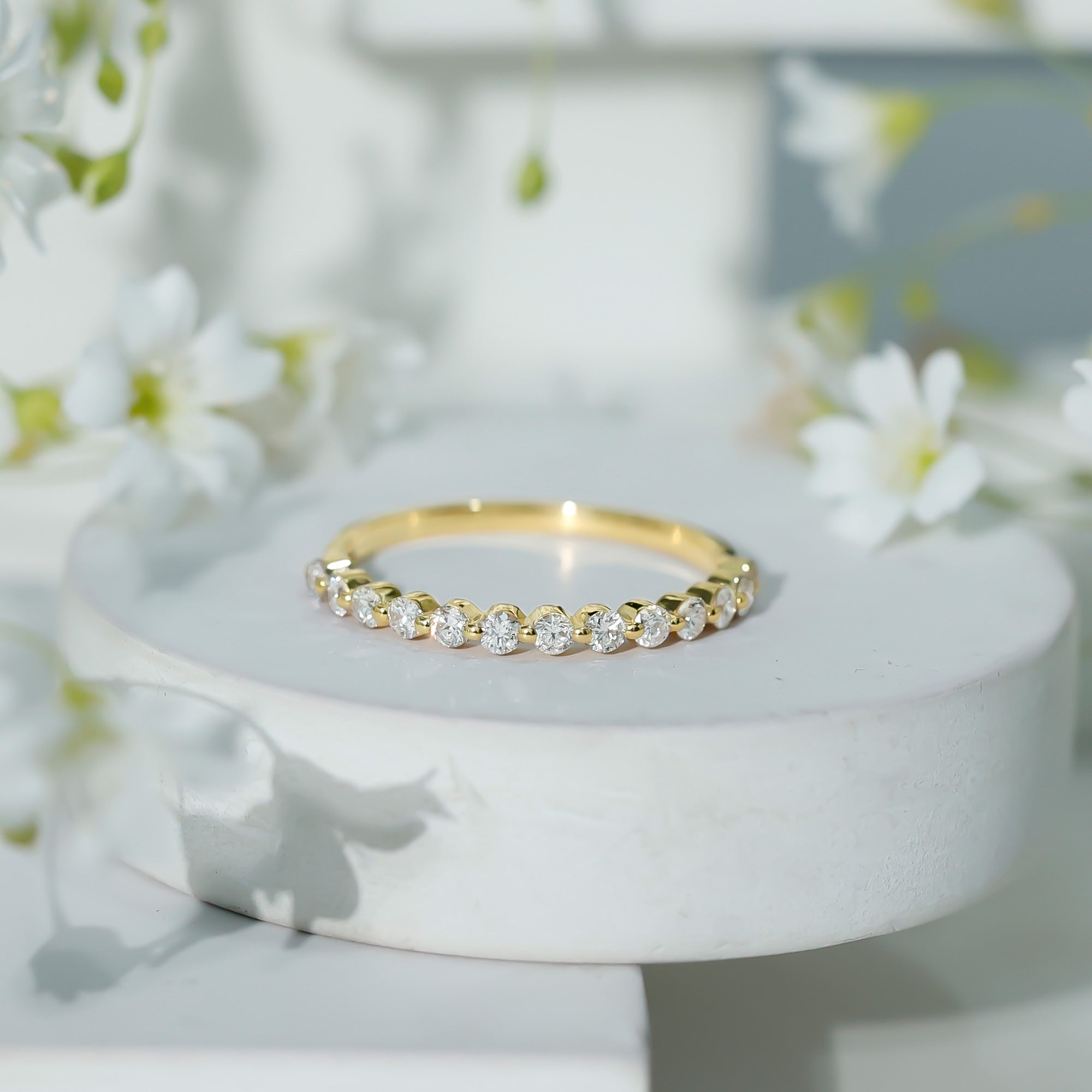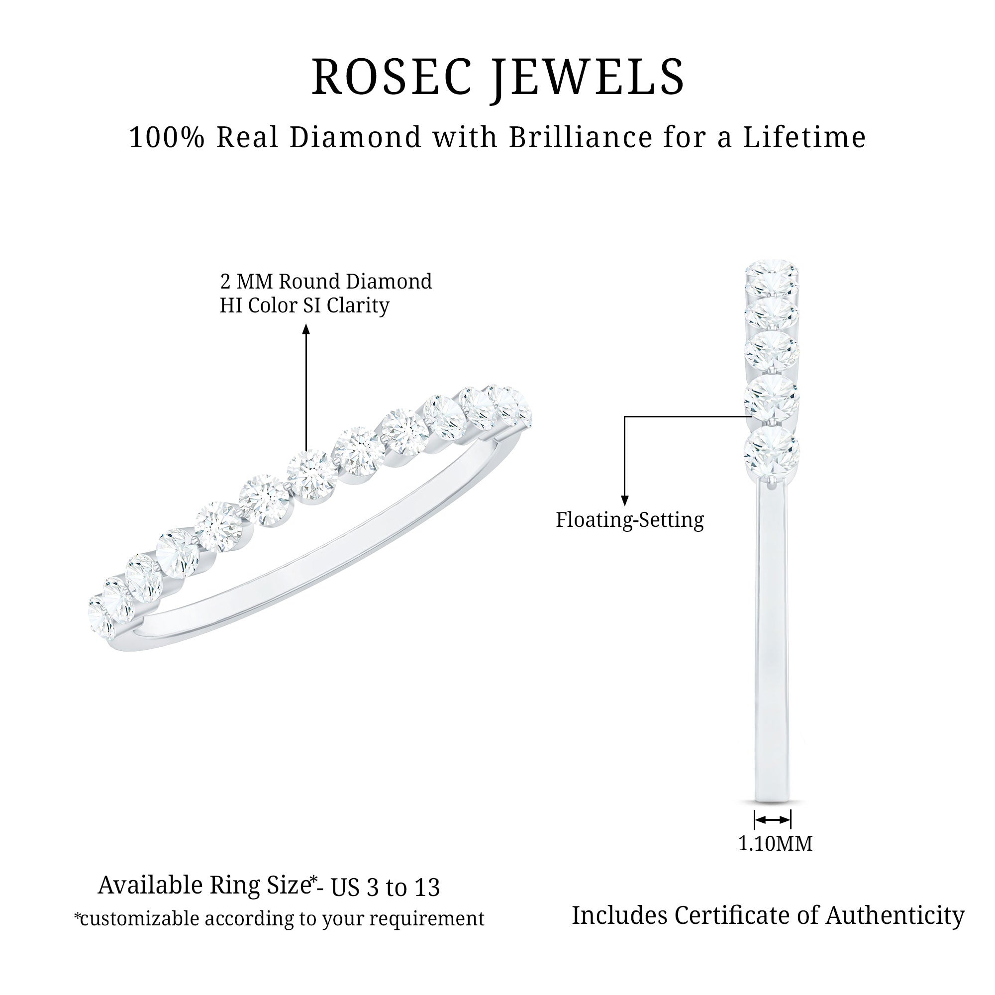 Elevate your everyday style with this chic and timeless Diamond Eternity Ring. The round-cut diamonds are elegantly adorned in a floating setting, adding a mesmerizing sparkle to your look. Embrace a charming flair with this exquisite Half Eternity Band that complements any outfit and makes you stand out with its radiant beauty.