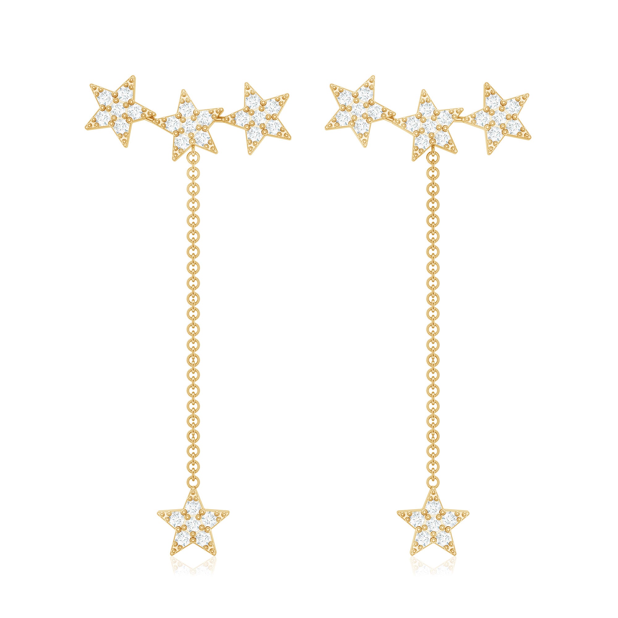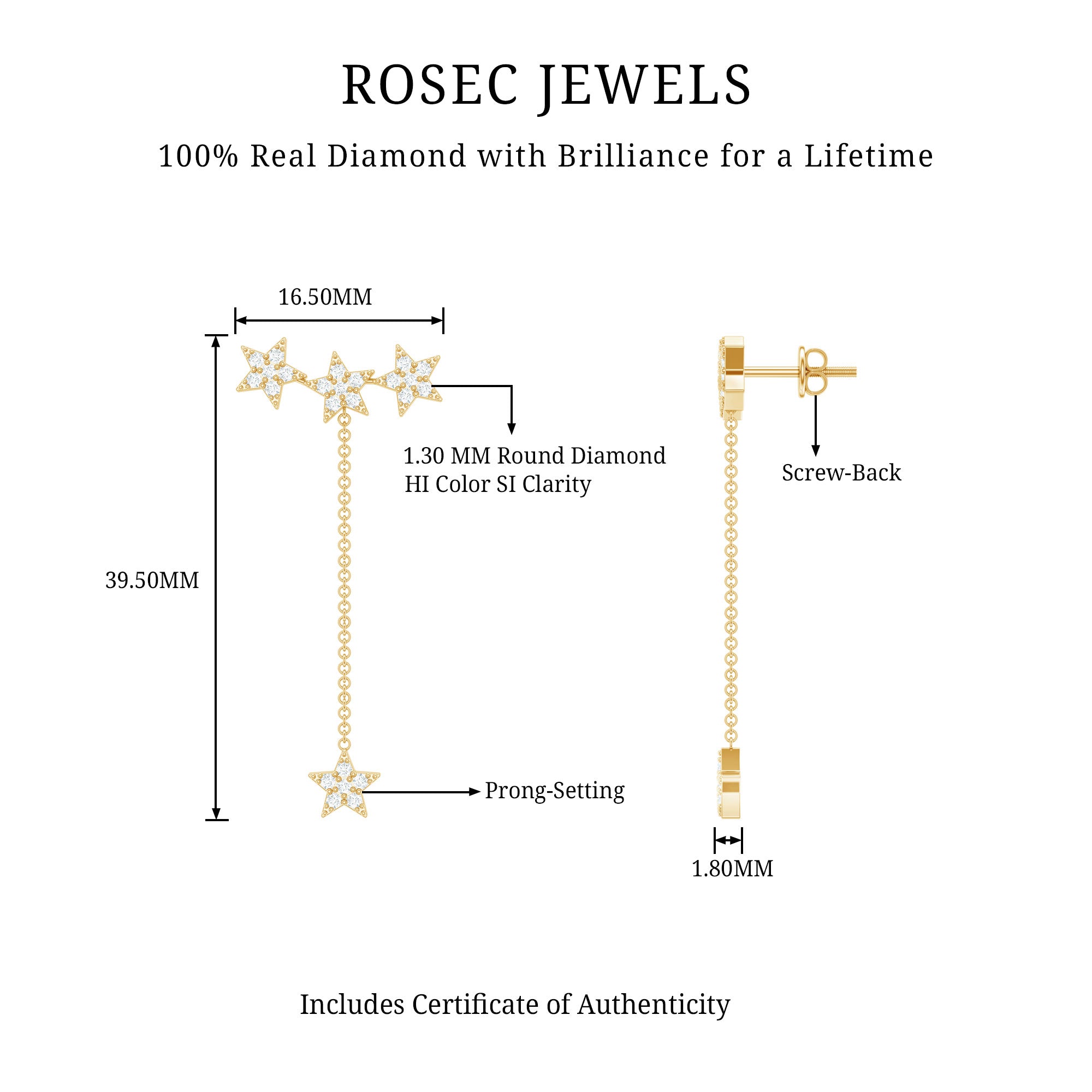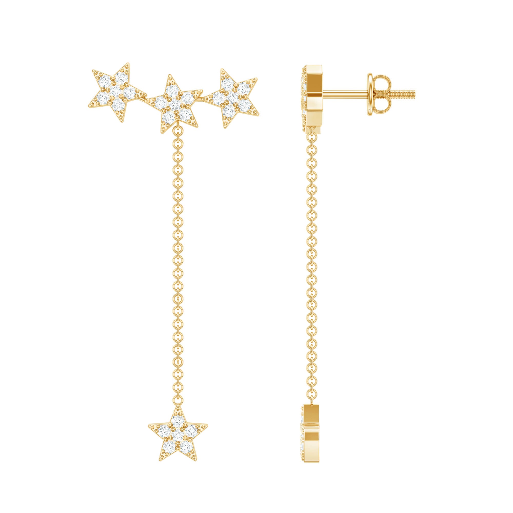 A little shimmer from the night sky feels even closer when a pair of Diamond Star Earrings rests gently on your ears. At the top sits a trio of tiny stars, each one covered in shimmering round diamonds set closely in pave setting for a bright and glowing finish. Hanging below is a dangling star, also wrapped in shining stones and connected through a delicate chain that moves gently with you. The screw back closure keeps the Diamond Dangle Earrings secure and comfortable, making them easy to wear all day without worry. Their lightweight feel adds to the charm, letting the design flow naturally without pulling or discomfort. Each stone is crafted in high HI-SI quality, giving the Star Chain Earrings a sparkling finish that stands out beautifully in both daylight and evening light. Perfect as a meaningful gift or a special treat for yourself, these Celestial Earrings offer a lovely blend of shine, movement, and star-inspired beauty, ideal for anyone who loves unique, magical designs.