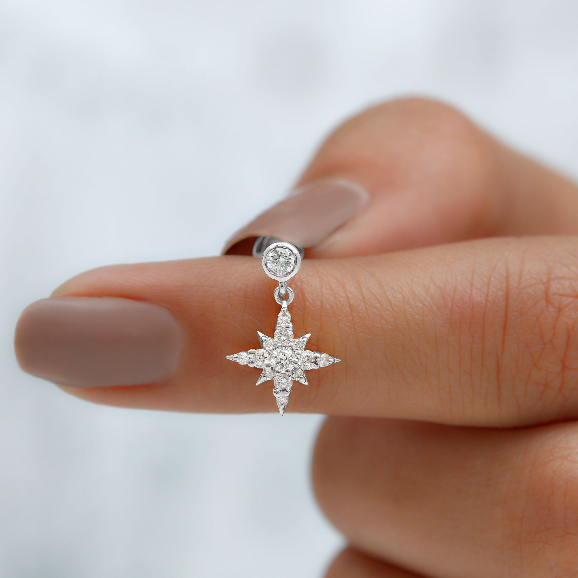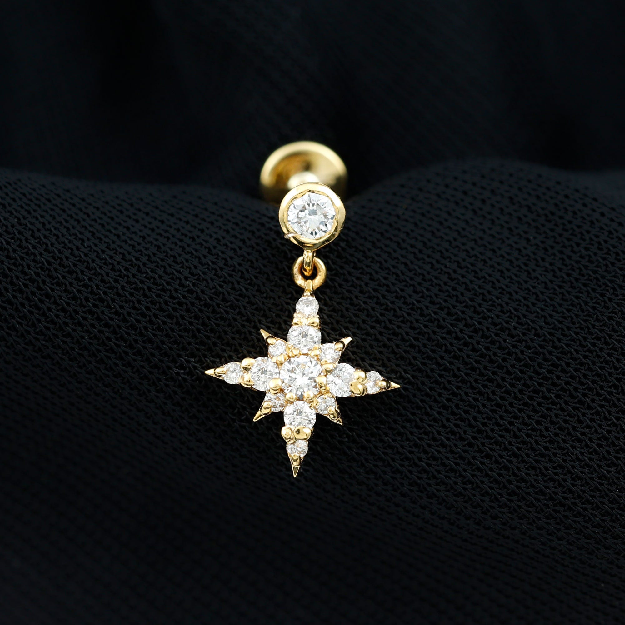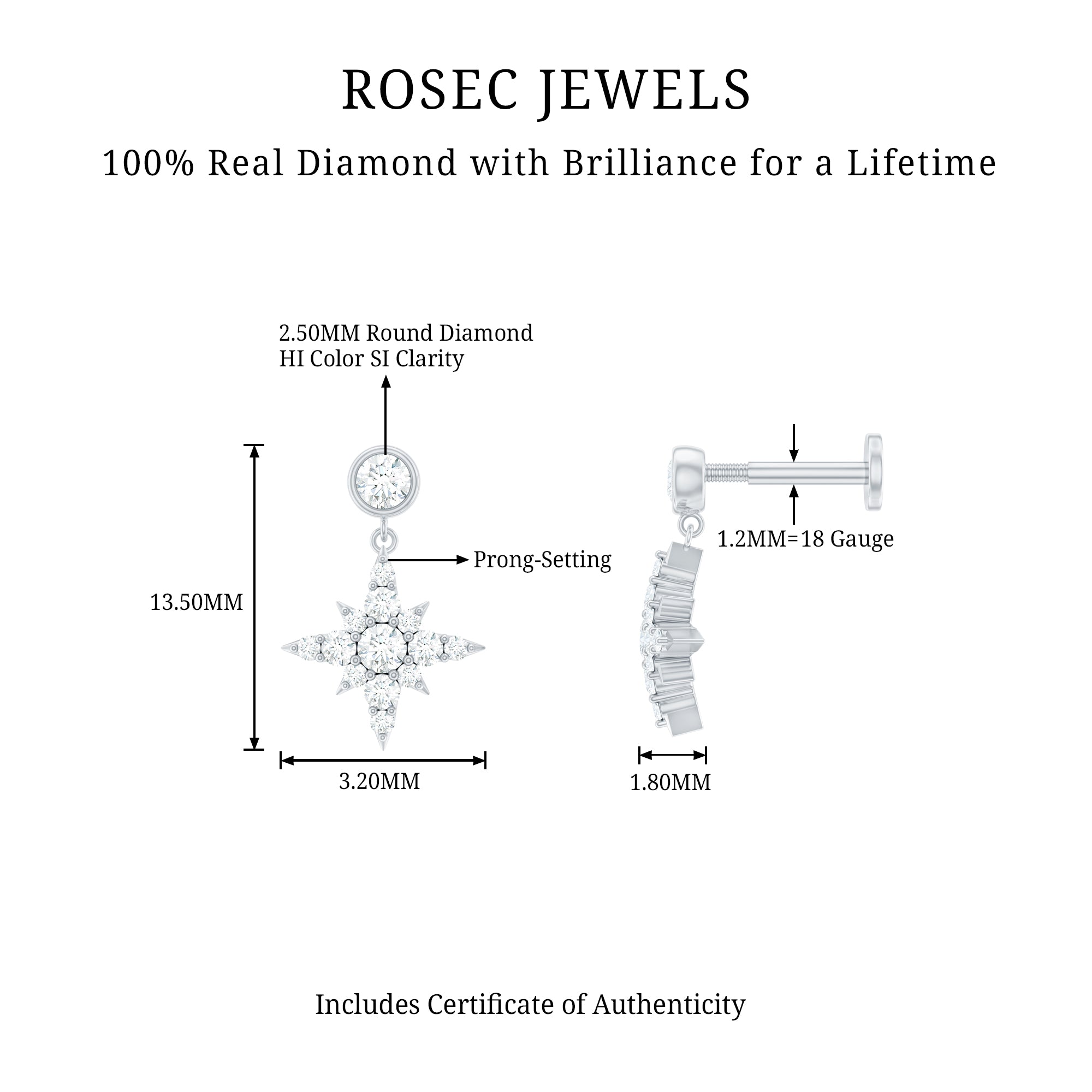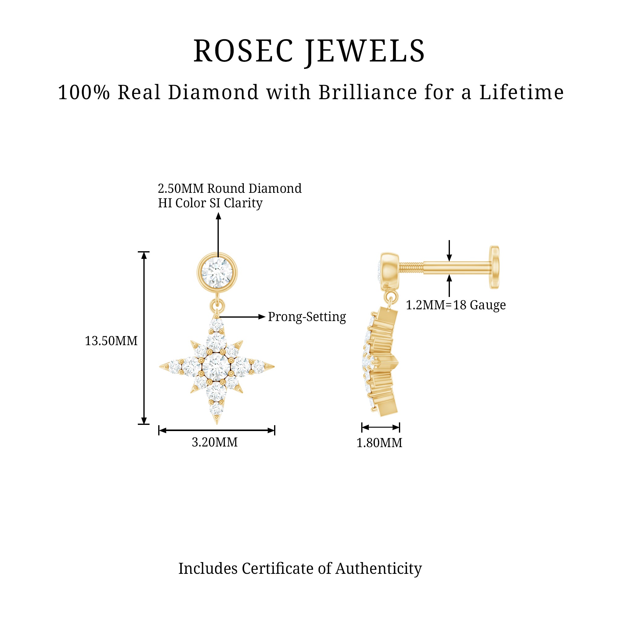 Youll never want to take out the stunning Starburst Drop Earring. Featuring a round diamond on top, while a cluster of round diamonds is studded on a star motif. This celestial earring adds a beautiful sparkle to any look and will make you feel incredible whenever you wear it. For an extra shine, pair with other diamond piercing jewelry. This stunning earpiece is ideal for Helix Piercing, it can also adorn other ear placements like Cartilage or Upper Lobe. Crafted with care and precision to ensure comfort and safety for all-day wear, this diamond drop earring can be the perfect gift to celebrate special moments and milestones.