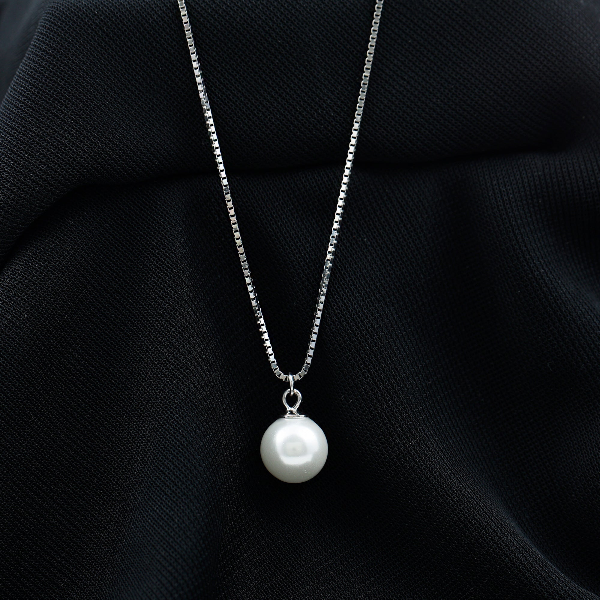 A representation of royalty, elegance, and timeless allure, this Freshwater Pearl Necklace radiates classic luxury in every aspect. Crafted with sophistication at its core, this Single Pearl Necklace showcases a lustrous 8 MM round Freshwater Pearl, delivering a timeless and opulent style that instantly enhances any ensemble. Handcrafted in 14k white gold plated silver, this White Pearl Necklace offers a brilliant and lasting finish to its design. The minimalist aesthetic allows the pearls purity to shine through, making it a versatile and enchanting accessory suitable for any event. Elevate your look with the subtle elegance of this Pearl Pendant Necklace, a testament to refined simplicity and lasting charm. It is suspended from a sturdy cable chain and secured with a lobster clasp, providing both style and assurance for wear from day to night. This Pearl Solitaire Necklace can also be effortlessly layered with a longer chain or worn solo as a chic statement piece. Perfect for weddings, festive celebrations, or as a signature everyday accessory, this One Pearl Necklace embodies refined taste, poised beauty, and graceful tradition.