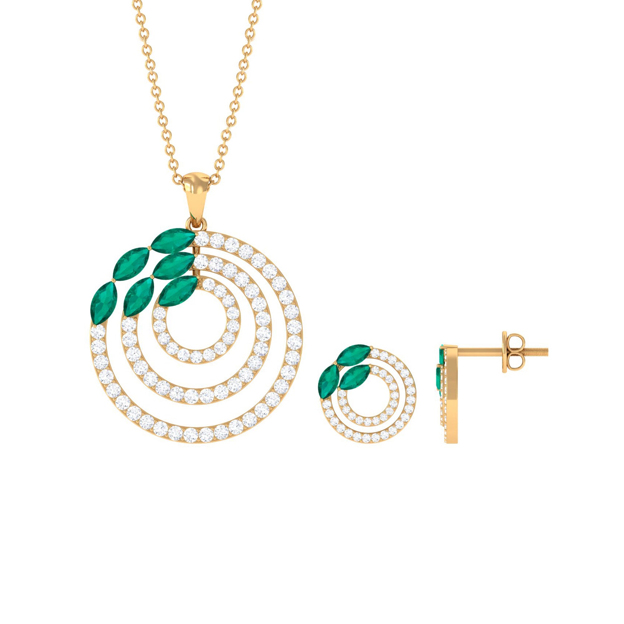 Add the perfect finishing touch to your cocktail party attire with our Emerald Pendant and Earrings Set. This elegant pendant set features a dazzling Marquise-Cut Emerald with Round Cut Moissanite Accents set in a stunning Cocktail Pendant and Earrings, expertly crafted from Solid Gold. The captivating green hue of the Emerald is complemented by the sparkling moissanite stones, creating a truly exquisite piece of jewelry.