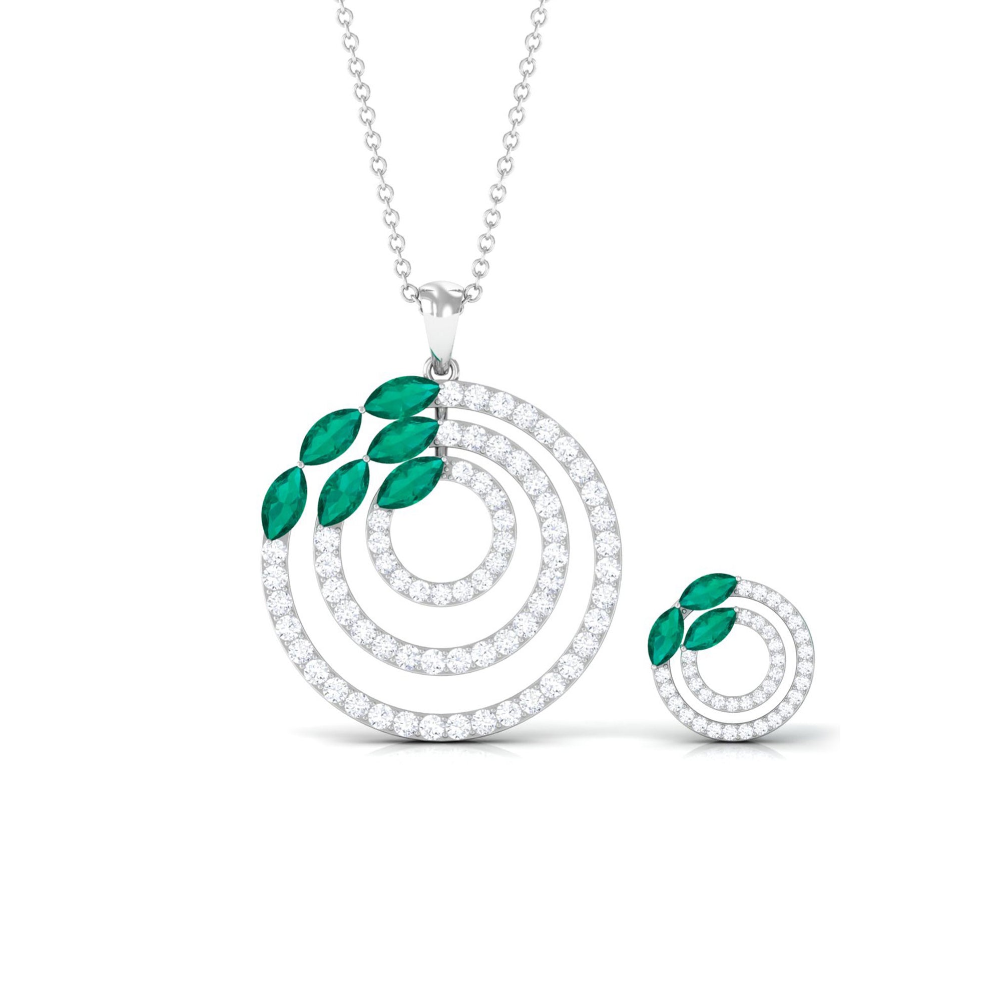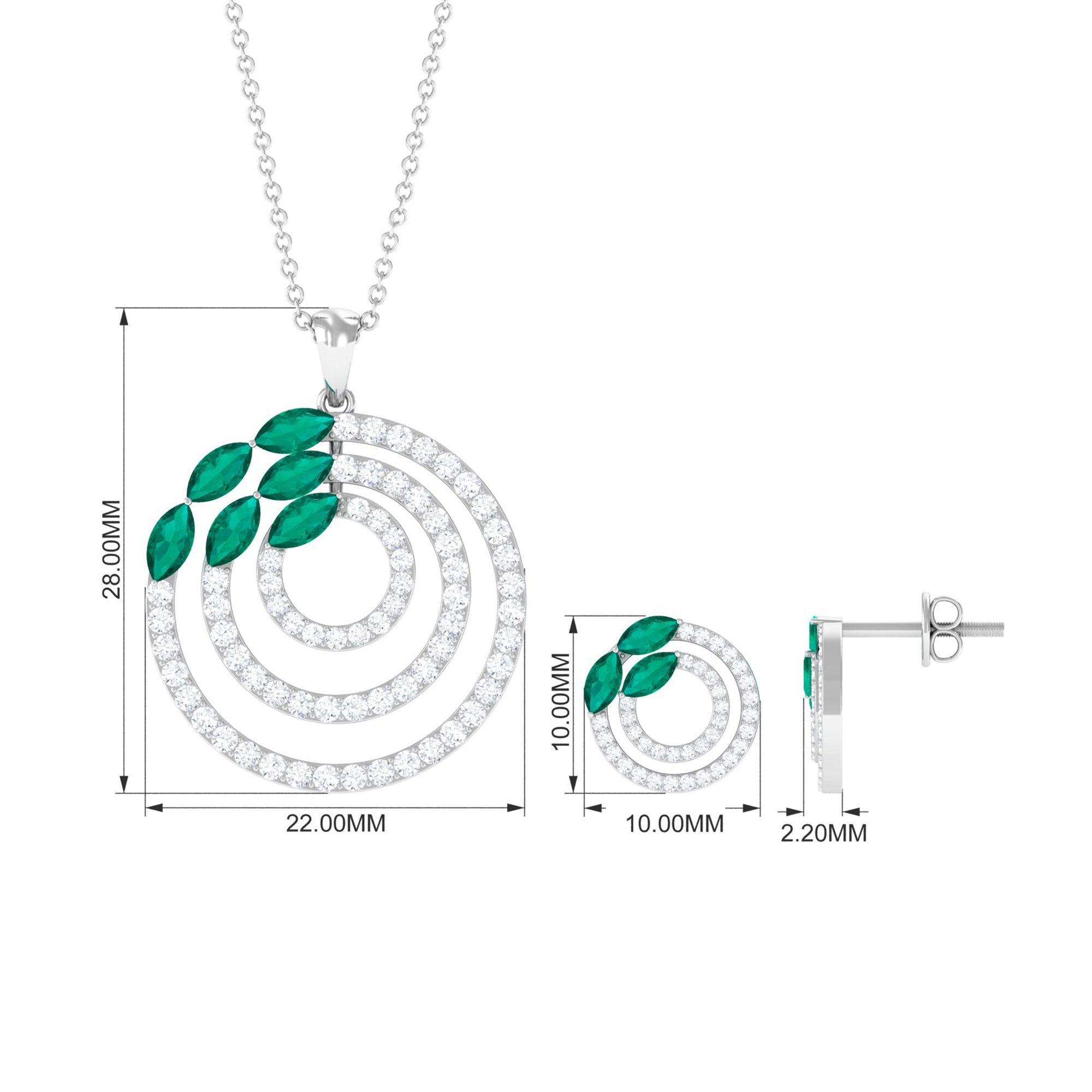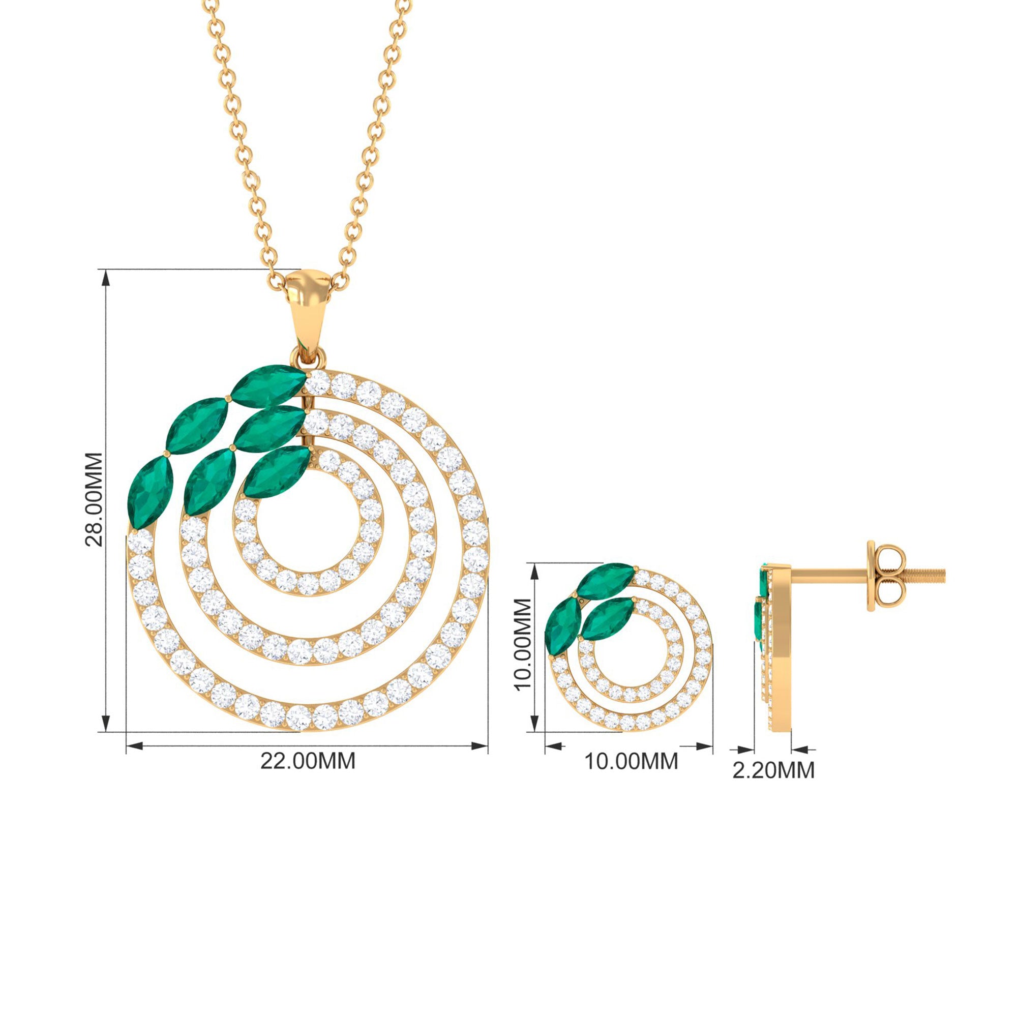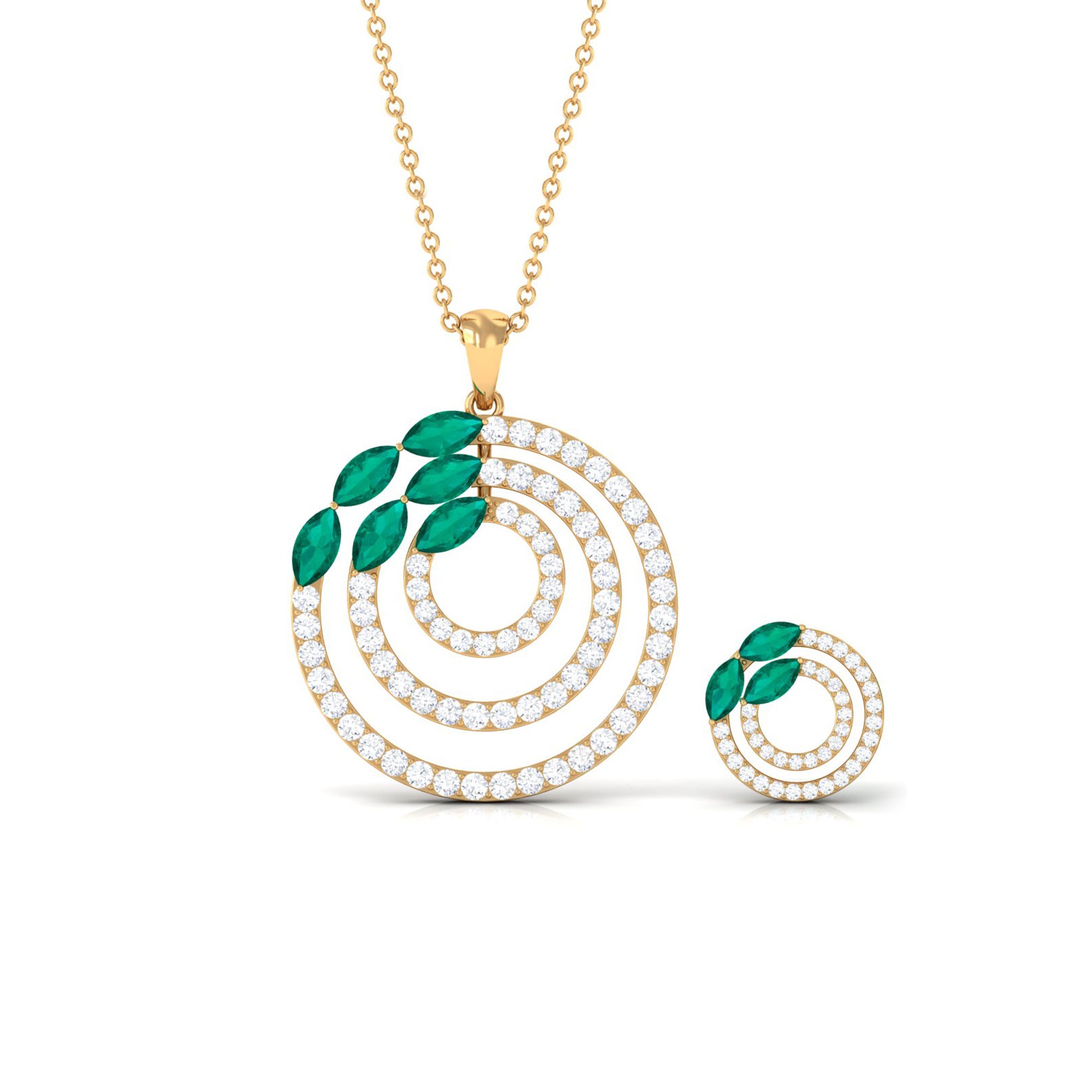 Add the perfect finishing touch to your cocktail party attire with our Emerald Pendant and Earrings Set. This elegant pendant set features a dazzling Marquise-Cut Emerald with Round Cut Moissanite Accents set in a stunning Cocktail Pendant and Earrings, expertly crafted from Solid Gold. The captivating green hue of the Emerald is complemented by the sparkling moissanite stones, creating a truly exquisite piece of jewelry.