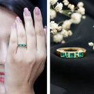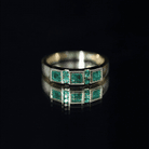 The Emerald Band Ring boasts a captivating, vibrant allure and luxurious luster that highlights its sophisticated design. Adorned with Round and Princess Cut Emeralds, this striking piece exudes elegance and timeless brilliance. The princess cut stones are set in bezel setting while the round ones are secured with tension mount setting, making it a unique and modern piece of jewelry. Crafted with precision and gleaming with an air of elegance, this exquisite Anniversary Band for Women exemplifies unparalleled quality and is sure to make a statement on any occasion. Whether marking a special moment or simply treating oneself, this Emerald Anniversary Band symbolizes love, commitment, and a shared future. The addition of emeralds to ones jewelry collection adds a touch of royal elegance, also making an ideal present for May-born individuals as a Birthstone.