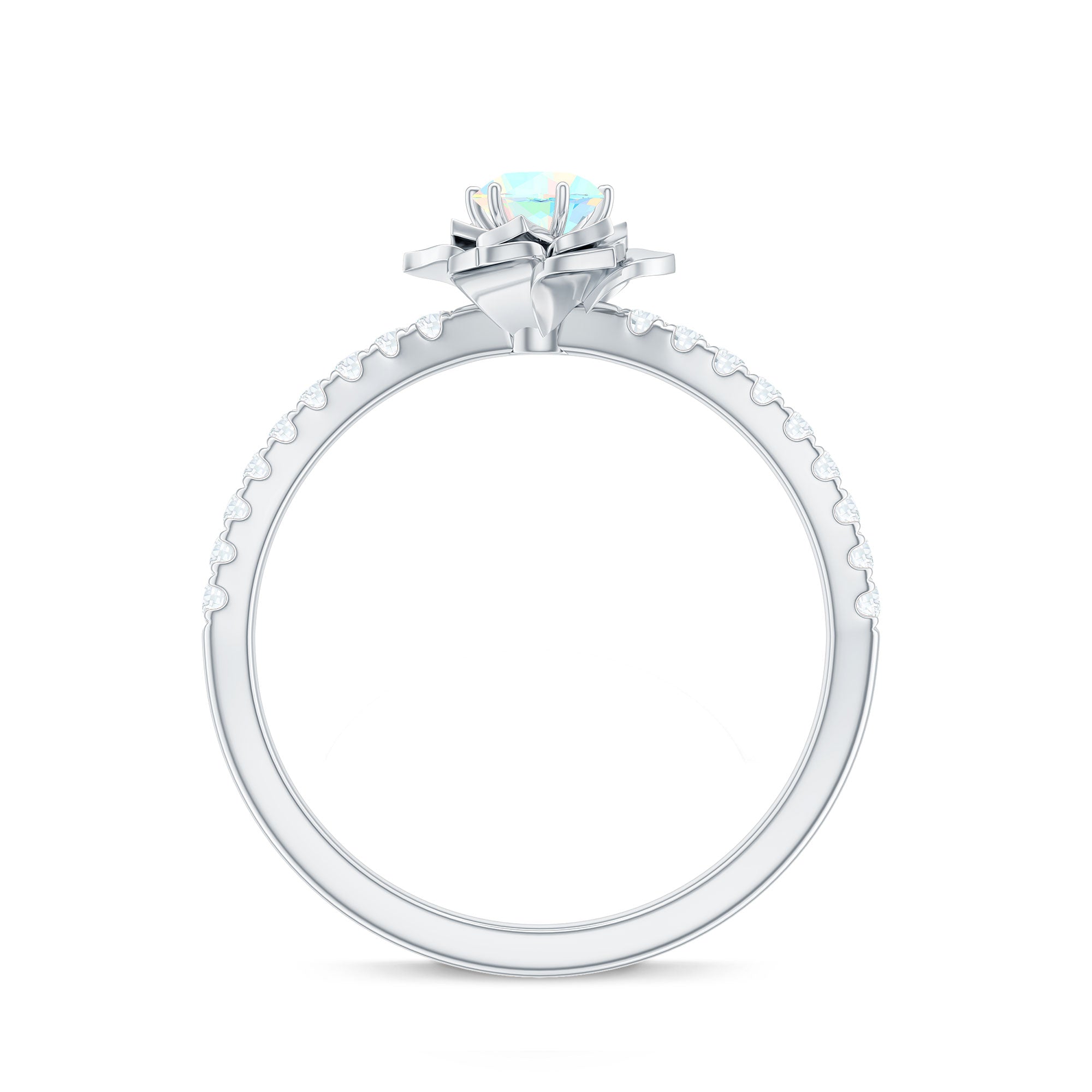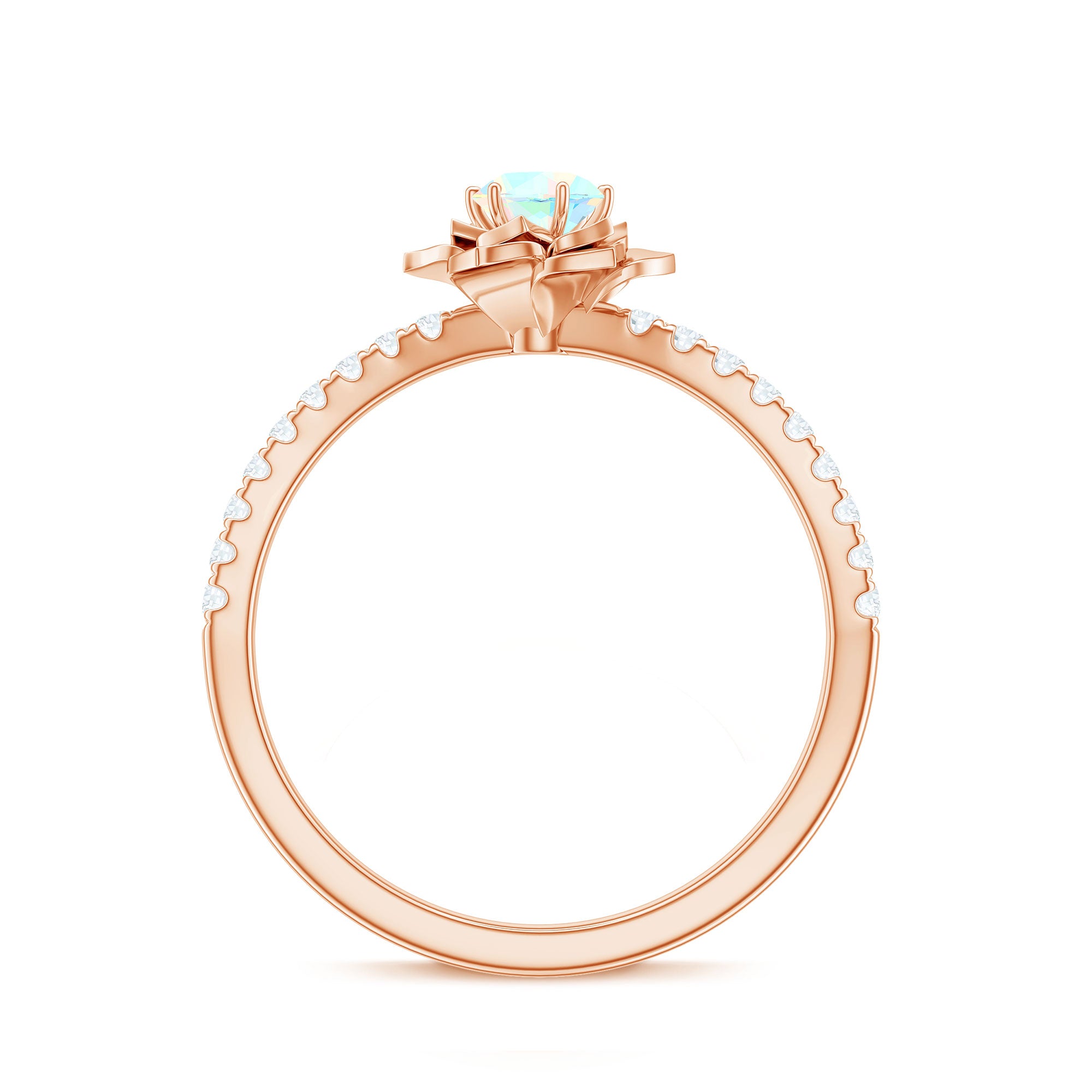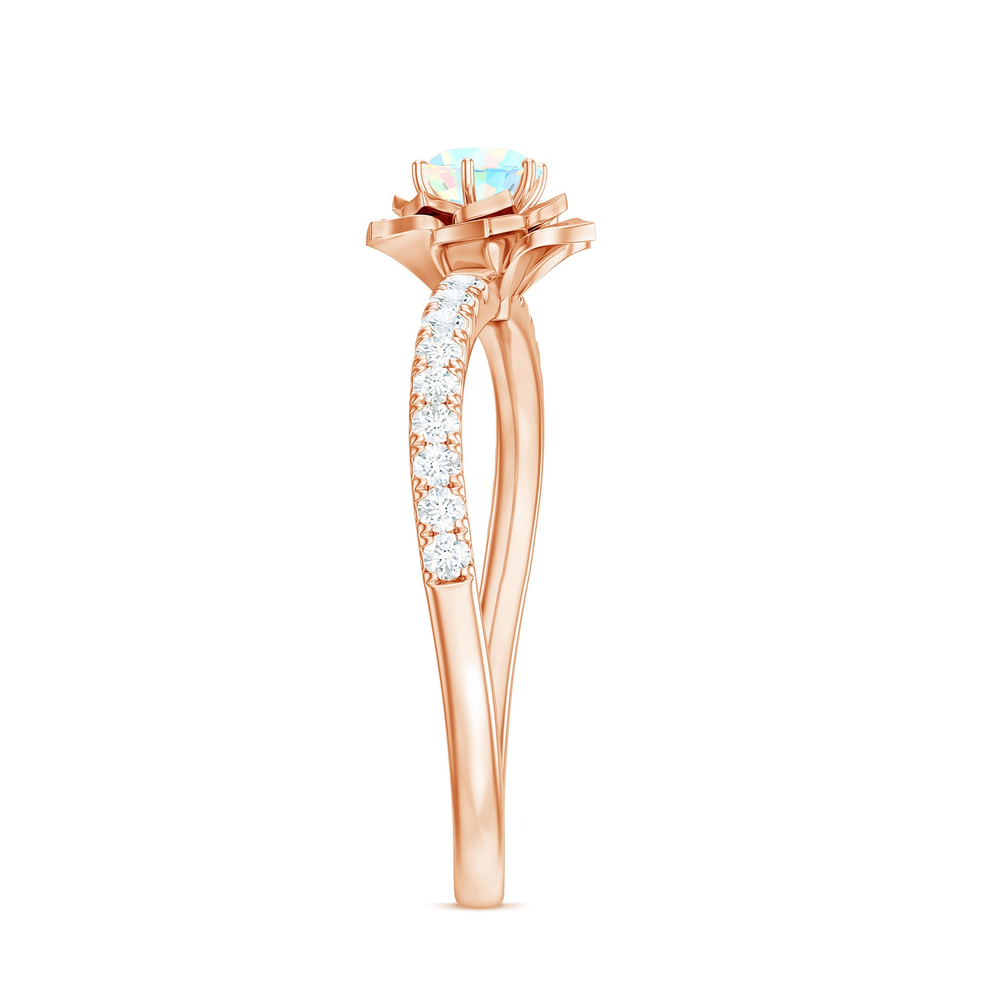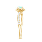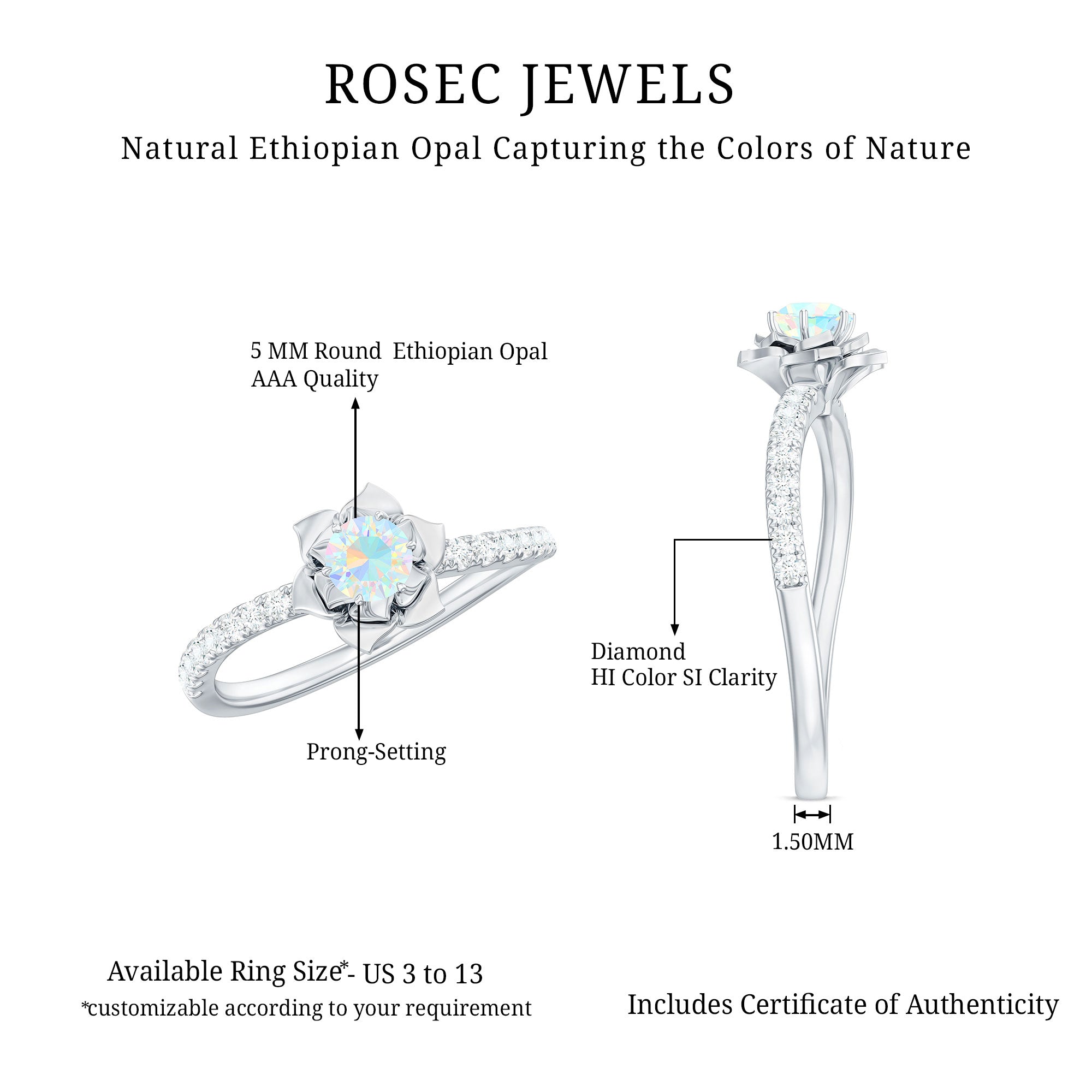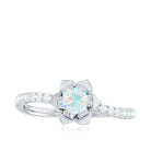 This enchanting Ethiopian Opal Ring features a soft, iridescent glow set against a beautifully sculpted floral petals frame. Inspired by nature and crafted for everyday elegance, the design celebrates feminine energy, quiet strength, and organic beauty. This Floral Opal Ring features 5 mm round shape Ethiopian Opal set at the center in a prong setting with round diamond side stones. The flower motif adds a romantic, nature-inspired touch, making the Flower Ring feel tender and full of heart. This Opal Ring for Women is elegant yet classy carries a quiet charm that makes it perfect for everyday moments or personal milestones. Designed to feel confident every time, flaunt it on any occasion may be anniversary, engagement, cocktail party etc. This Floral Engagement Ring is designed to feel lightweight and comfortable, available in a wide range of sizes. Its enduring floral pattern and radiant shimmer serve as a lovely reminder of love that is flourishing, constant, untainted, and brimming with potential.