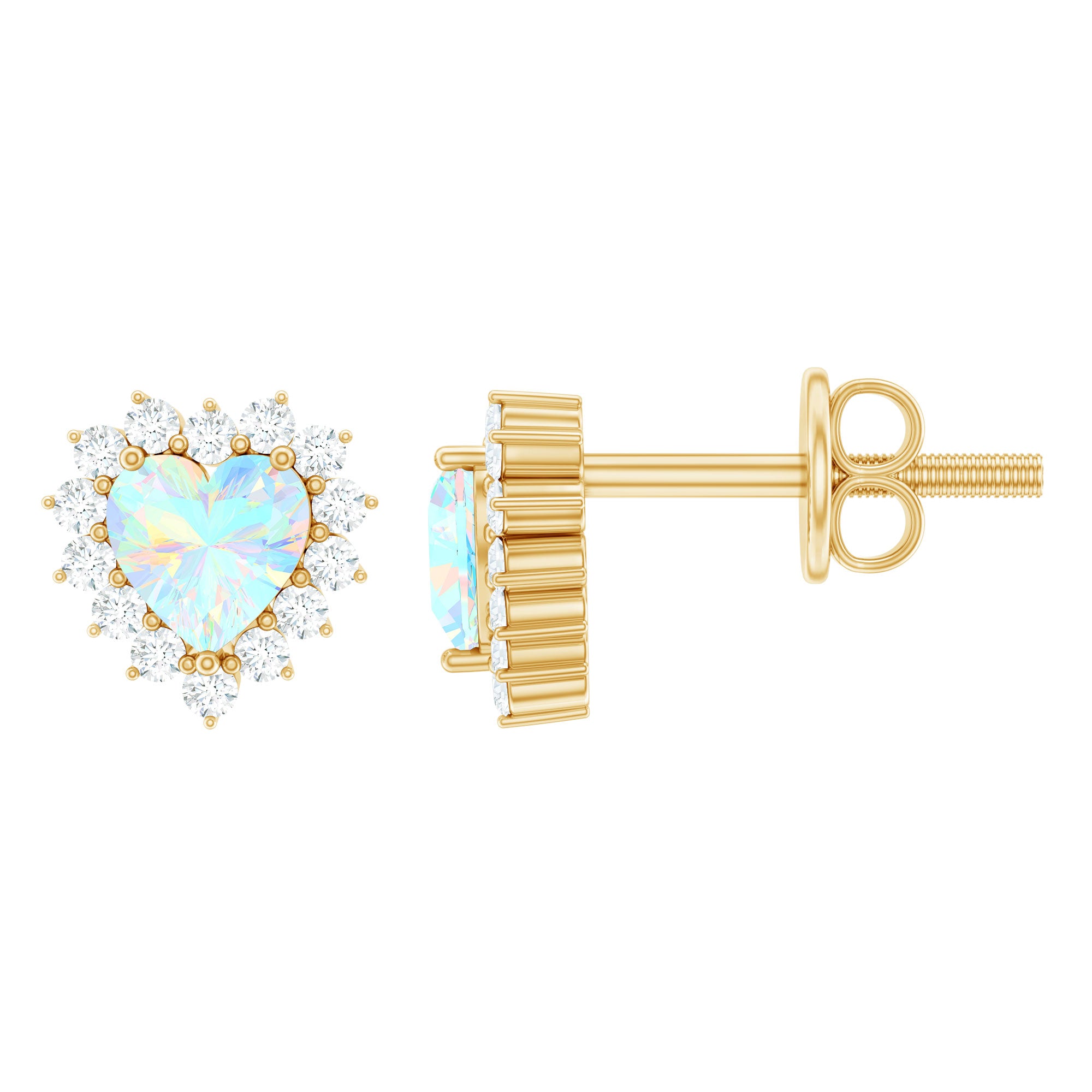 Fall in love with the enchanting beauty of these stunning Ethiopian Opal Stud Earrings. A mesmerizing 6 MM heart shaped ethiopian opal gemstone takes center stage, captivating with its vivid play of color in shades of red, green, and blue. The opal is surrounded by a halo of sparkling moissanite stones, adding a touch of timeless glamour. These Heart Stud Earrings are set with AAA quality ethiopian opal and D-VS1 quality moissanites, lending a luxurious feel. They make the perfect gift for a loved one or a special treat for yourself. Whether dressing up or keeping it casual, these Heart Opal Earrings will elevate any outfit. They are versatile enough to wear from day to night and are sure to become a cherished piece in your jewelry collection. The secure screw back closure of these Halo Earrings embraces the earlobe, ensuring they stay in place throughout the day. They are perfect for making a bold statement in your jewelry collection and will arrive in premium packaging along with a certificate of authenticity.