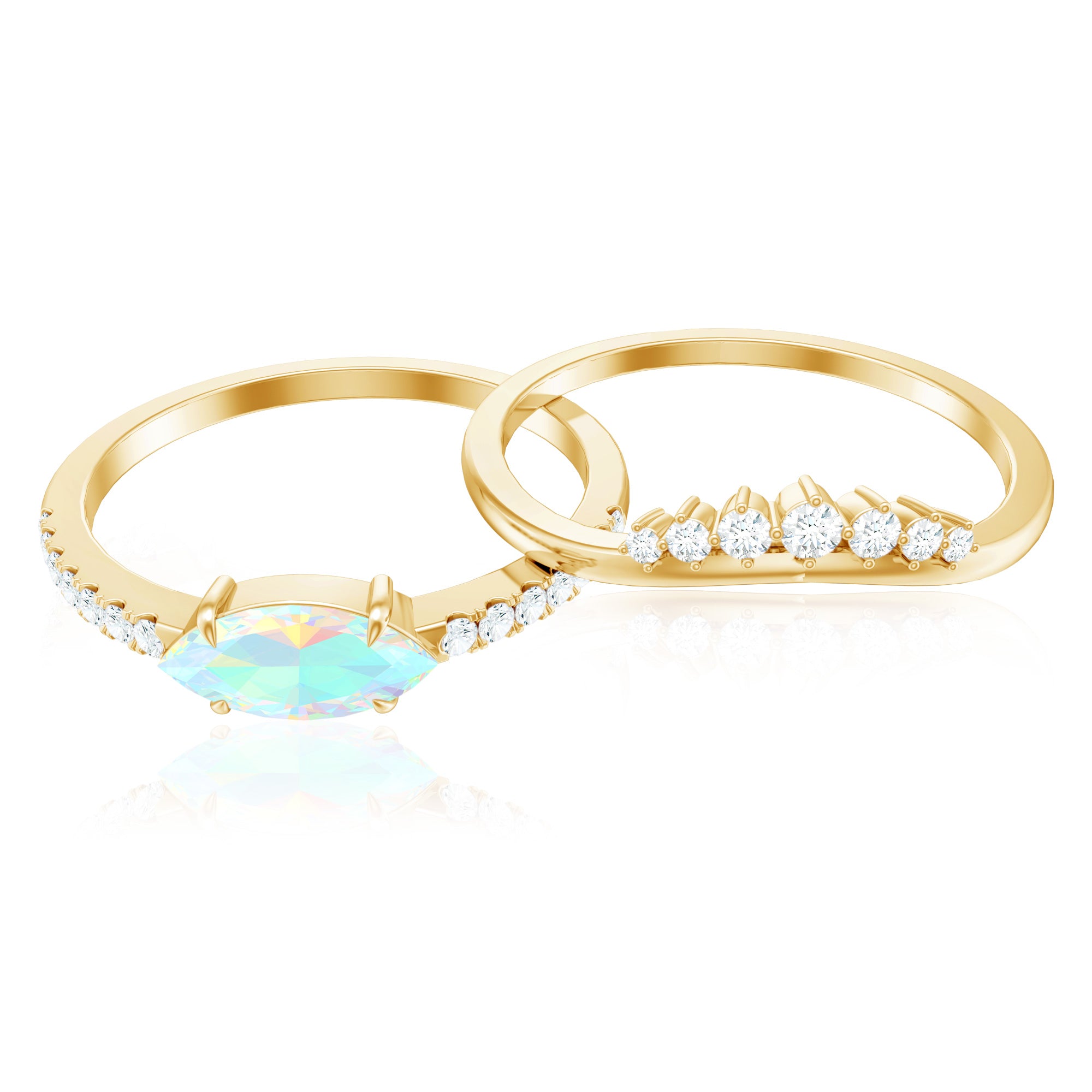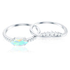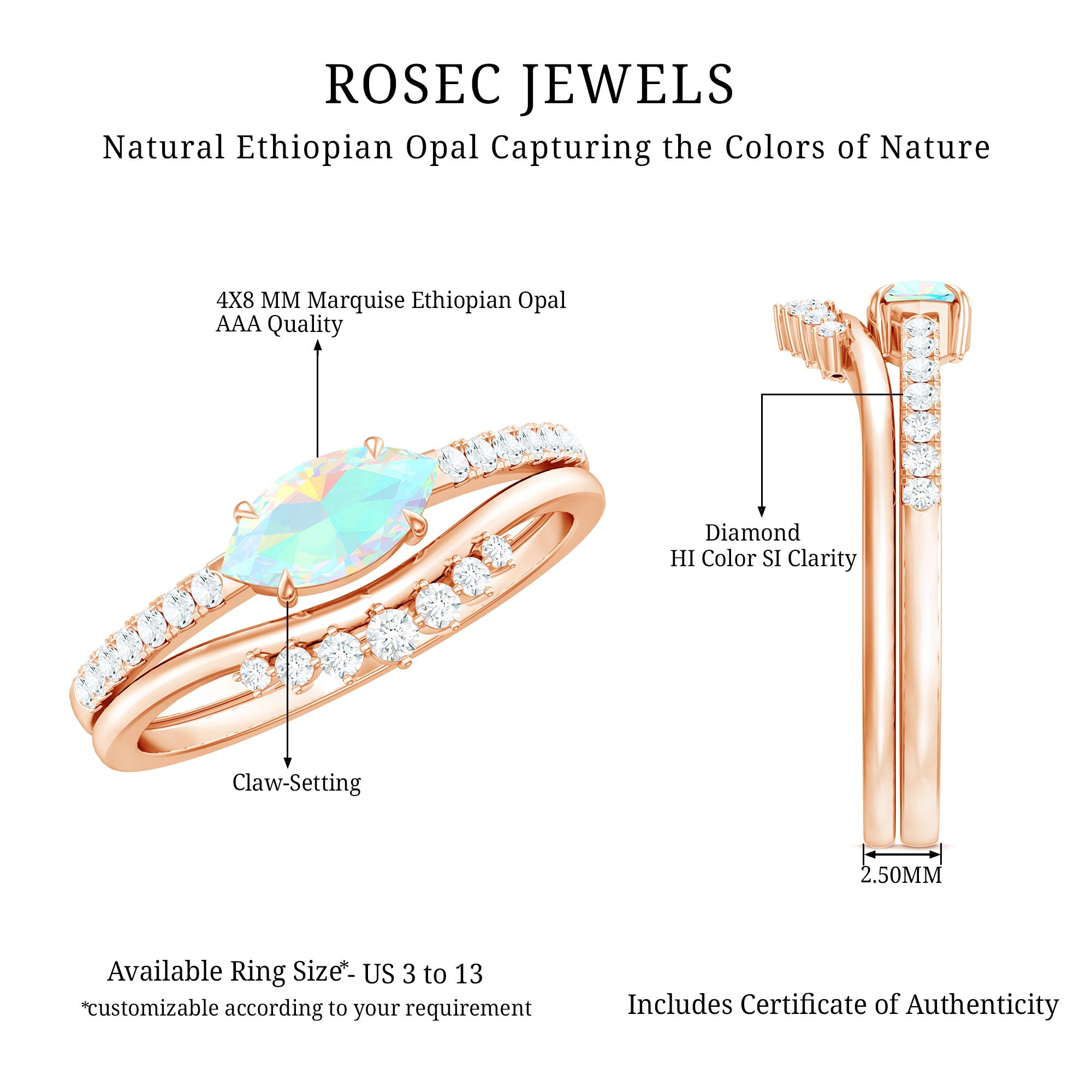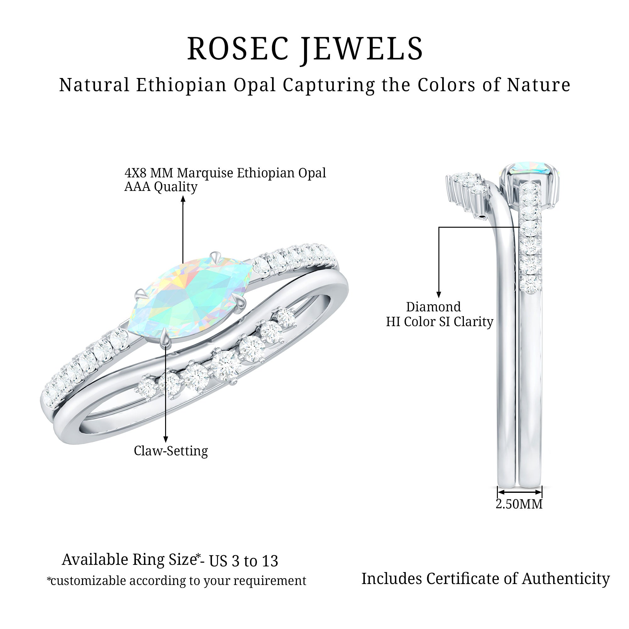 Break away from tradition and embrace a love story that shines with individuality in this Wedding Bridal Ring Set. This 2 Piece Ring Set includes a Solitaire Engagement Ring adorned with a mesmerizing 4X8 mm Marquise Shape Ethiopian Opal, set horizontally for a bold, contemporary twist. Its rainbow hue dances with every movement, reflecting the depth, magic and ever-changing beauty of true love. Framed by delicate Diamond Side Stones and paired with a gracefully Curved Diamond Band, this Opal Engagement Ring Set is designed to wear perfectly together, symbolizing harmony, balance and unity. The east-west style adds a modern edge to the timeless elegance of Opal and Diamond, making this Marquise Wedding Ring Set ideal for those who crave something unique yet meaningful. Whether you are saying yes, I do, or simply celebrating your one-of-a-kind connection, this Marquise Engagement Ring with Wedding Band delivers unmatched sparkle and style. Available in multiple ring sizes and presented in a signature jewelry box, this Opal Ring Set is ready for the big moment and every day after.