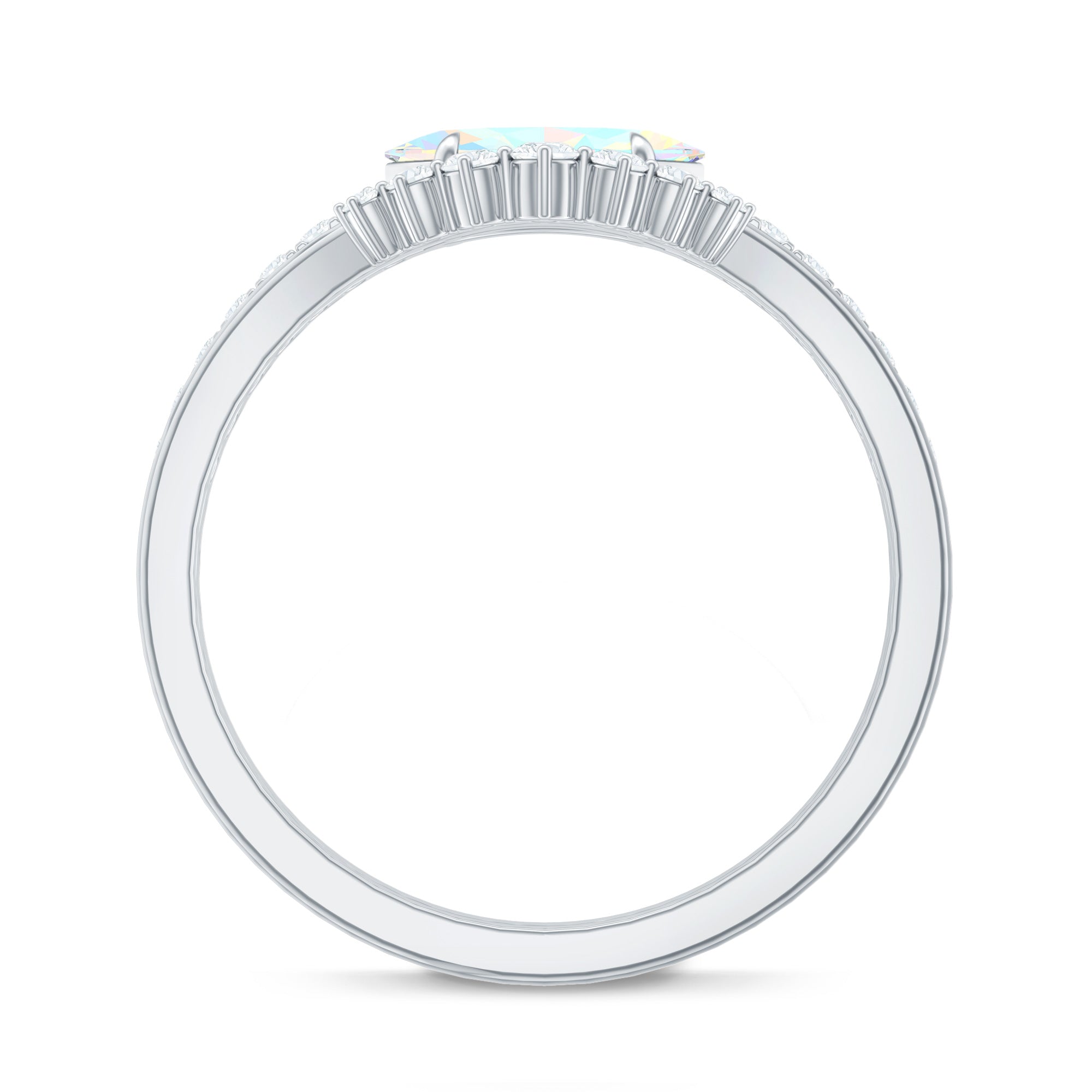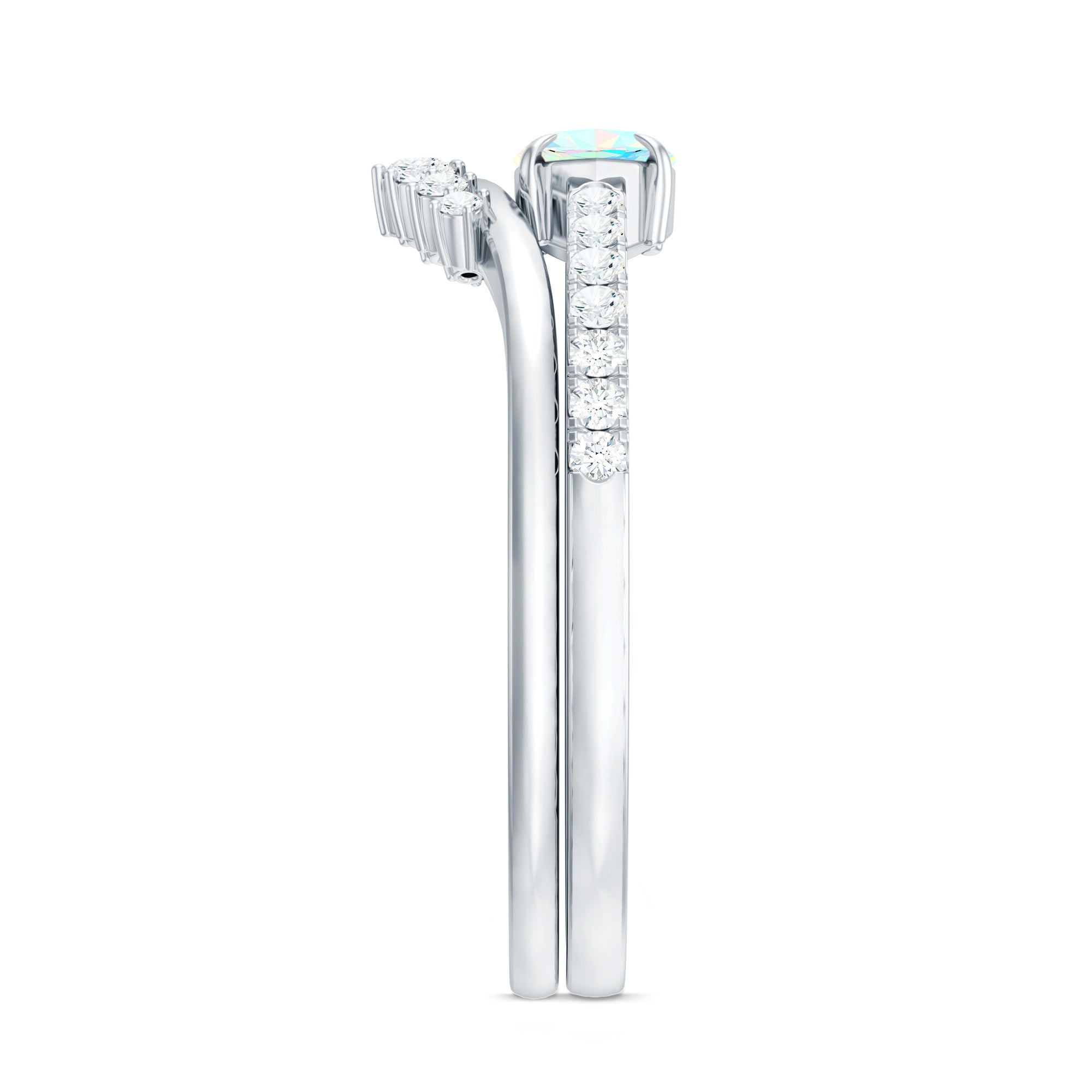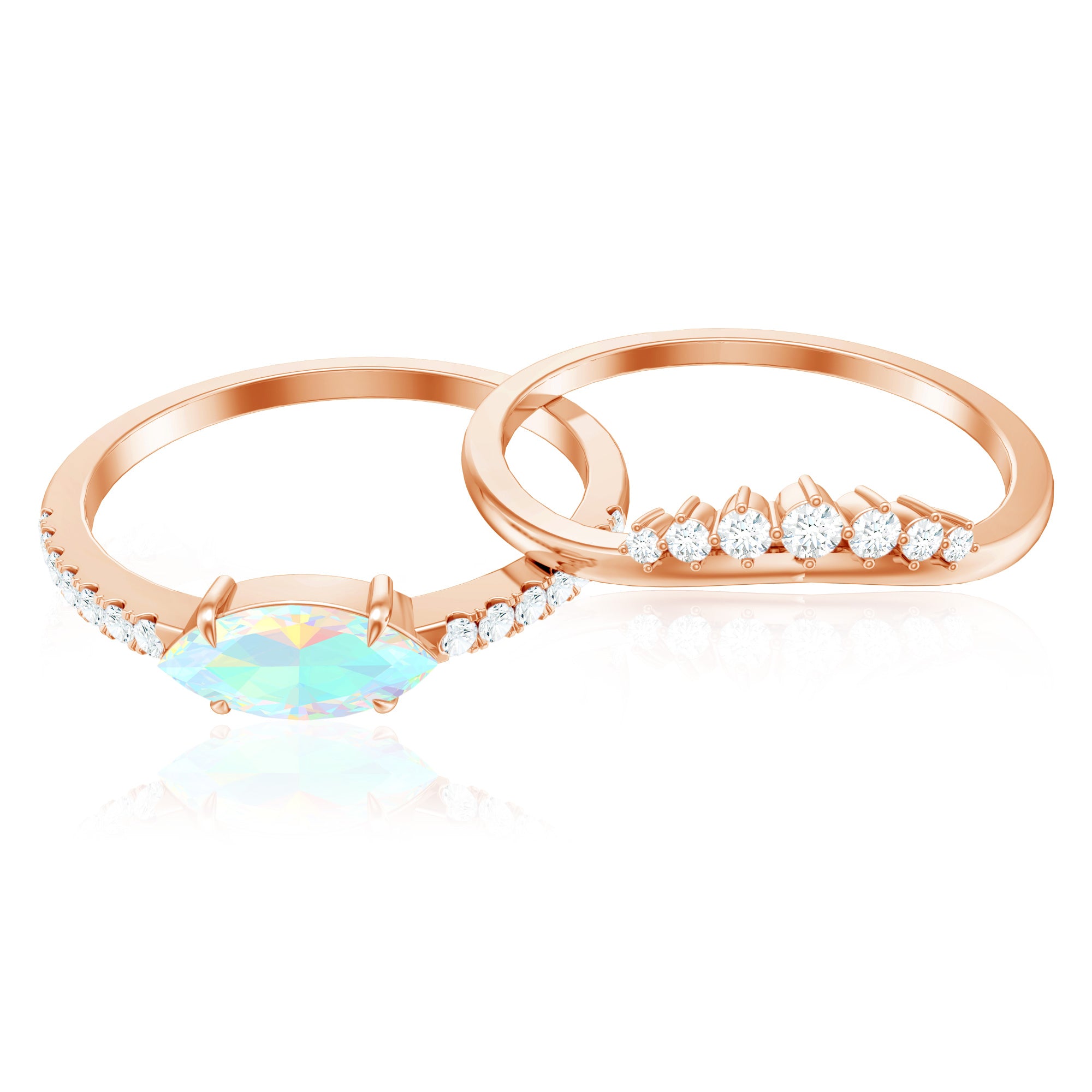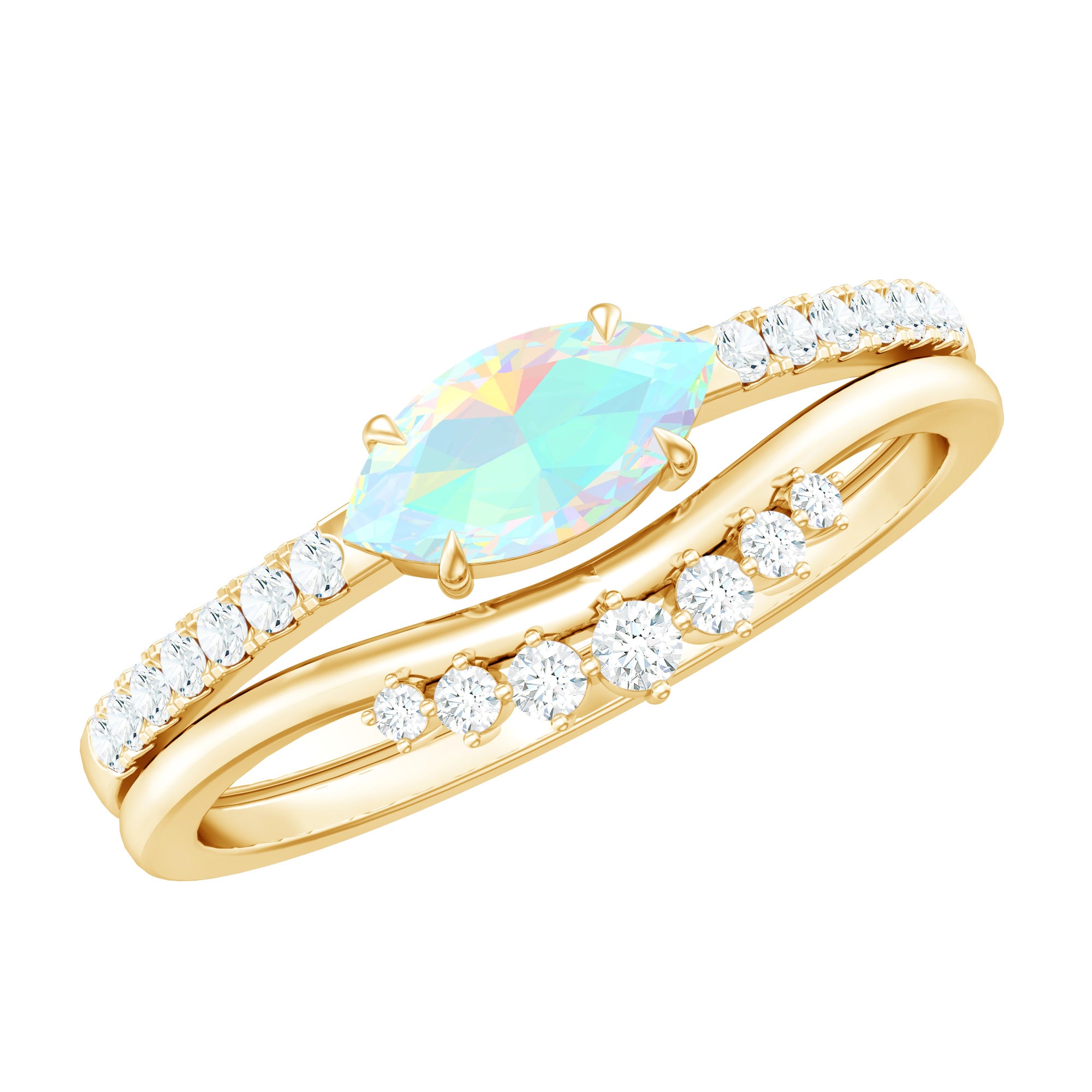 Break away from tradition and embrace a love story that shines with individuality in this Wedding Bridal Ring Set. This 2 Piece Ring Set includes a Solitaire Engagement Ring adorned with a mesmerizing 4X8 mm Marquise Shape Ethiopian Opal, set horizontally for a bold, contemporary twist. Its rainbow hue dances with every movement, reflecting the depth, magic and ever-changing beauty of true love. Framed by delicate Diamond Side Stones and paired with a gracefully Curved Diamond Band, this Opal Engagement Ring Set is designed to wear perfectly together, symbolizing harmony, balance and unity. The east-west style adds a modern edge to the timeless elegance of Opal and Diamond, making this Marquise Wedding Ring Set ideal for those who crave something unique yet meaningful. Whether you are saying yes, I do, or simply celebrating your one-of-a-kind connection, this Marquise Engagement Ring with Wedding Band delivers unmatched sparkle and style. Available in multiple ring sizes and presented in a signature jewelry box, this Opal Ring Set is ready for the big moment and every day after.