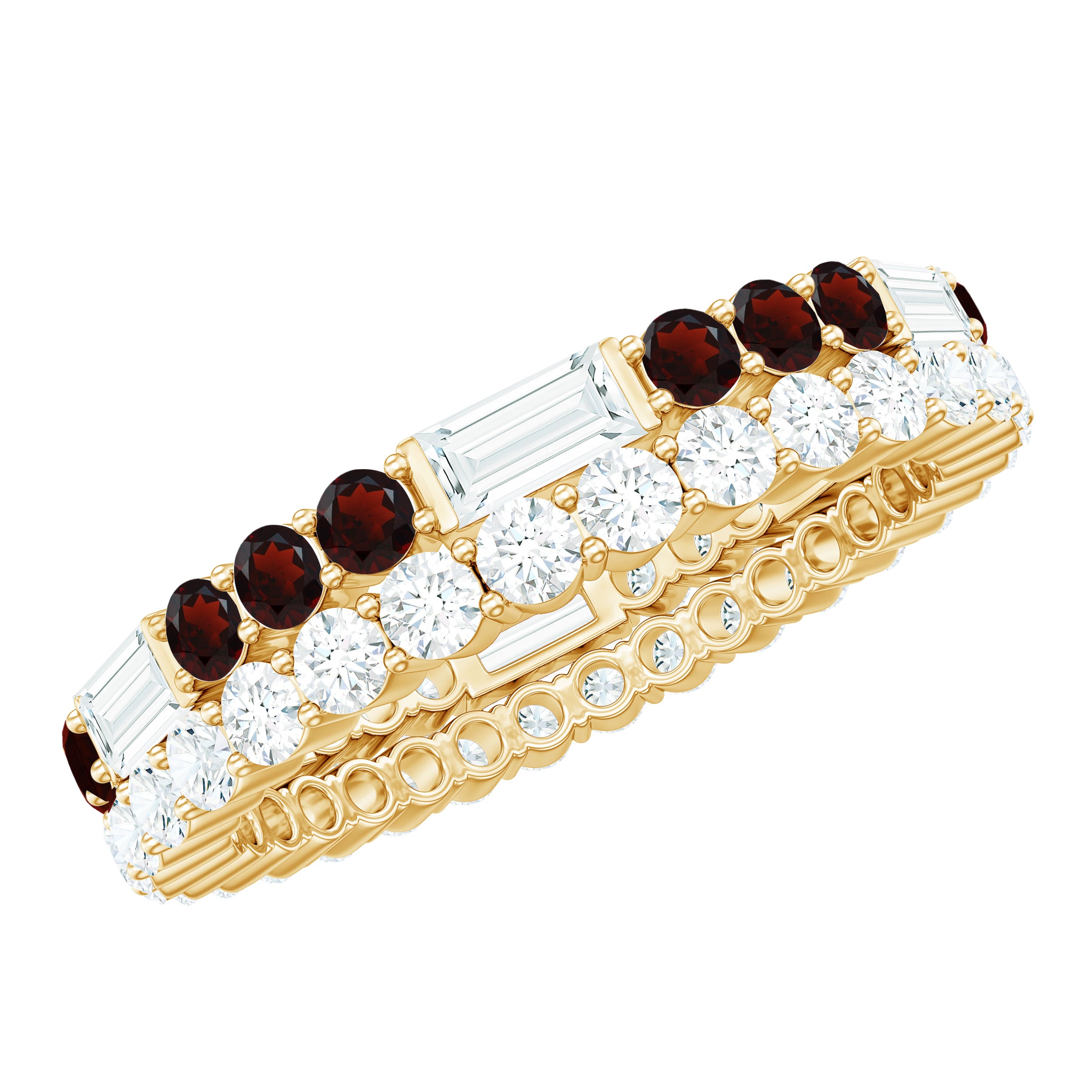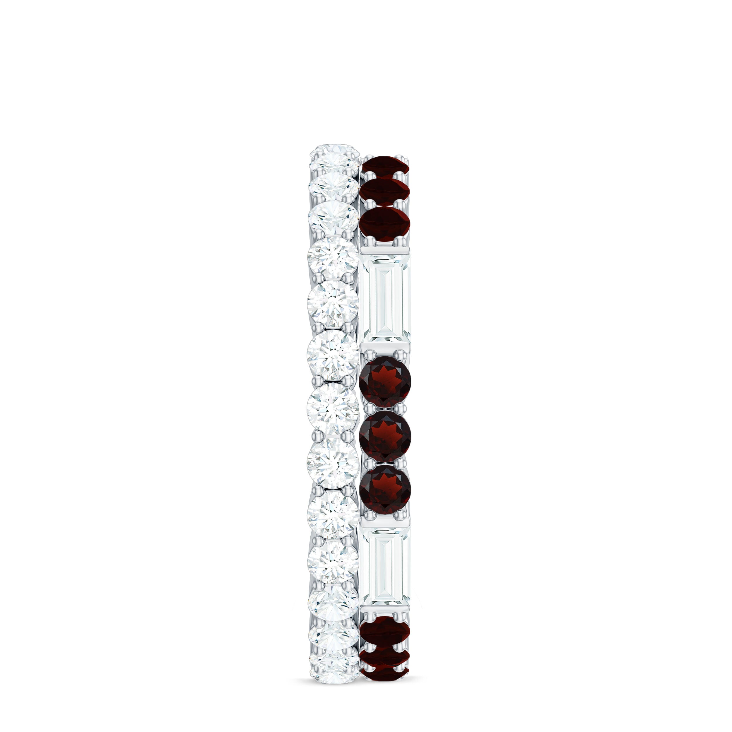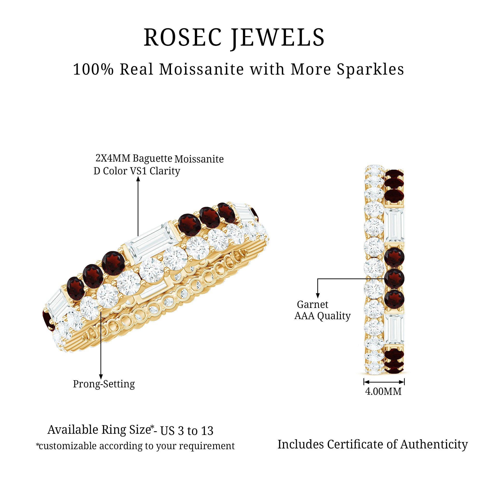 Cherished moments deserve a ring that speaks with the same depth and devotion, and this Wedding Eternity Band does exactly that. Designed with two beautifully contrasting rows, this Full Eternity Ring brings together shimmering Round Moissanite stones on one side and a captivating mix of Round Shape Garnet and Baguette Shape Moissanite on the other. The result is a dazzling blend of warmth and brilliance, the rich red glow of AAA Quality Garnet stones symbolizing passion, and the radiant sparkle of D-VS1 Quality Moissanite stones reflecting clarity, loyalty and forever. Every detail of this Garnet Wedding Band is crafted to feel meaningful. Arriving in a signature jewelry box that adds an air of elegance, this Garnet Eternity Band makes gifting unforgettable, whether for a wedding, anniversary or a heartfelt promise. With various ring sizes available, you can find the perfect fit for the person who means everything to you. Romantic, modern and full of emotion, this Garnet Ring for Women is a shimmering reminder that true love never stops growing.