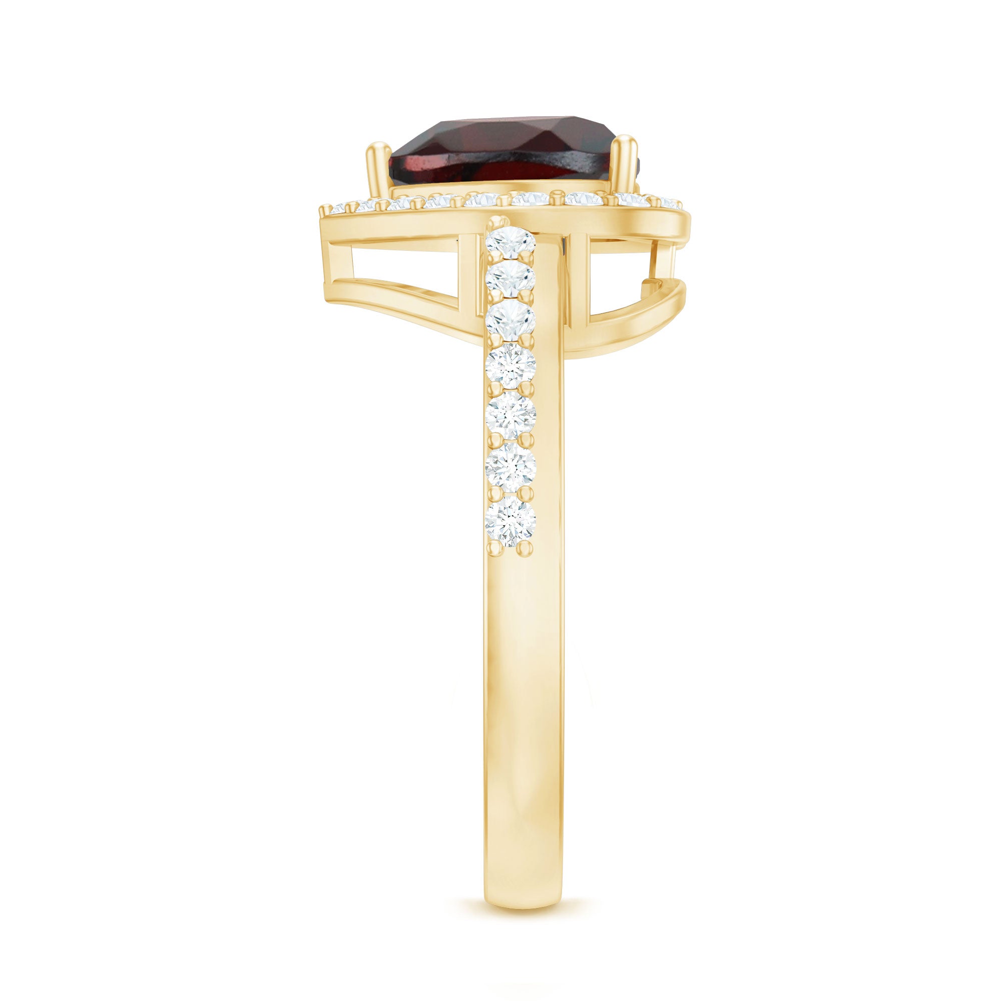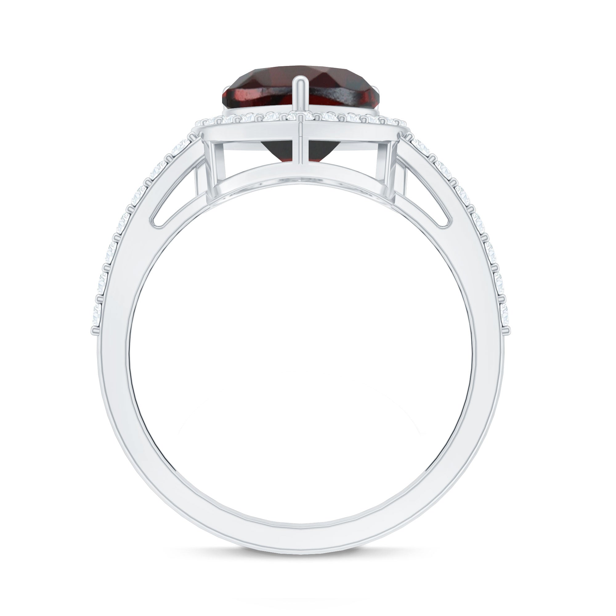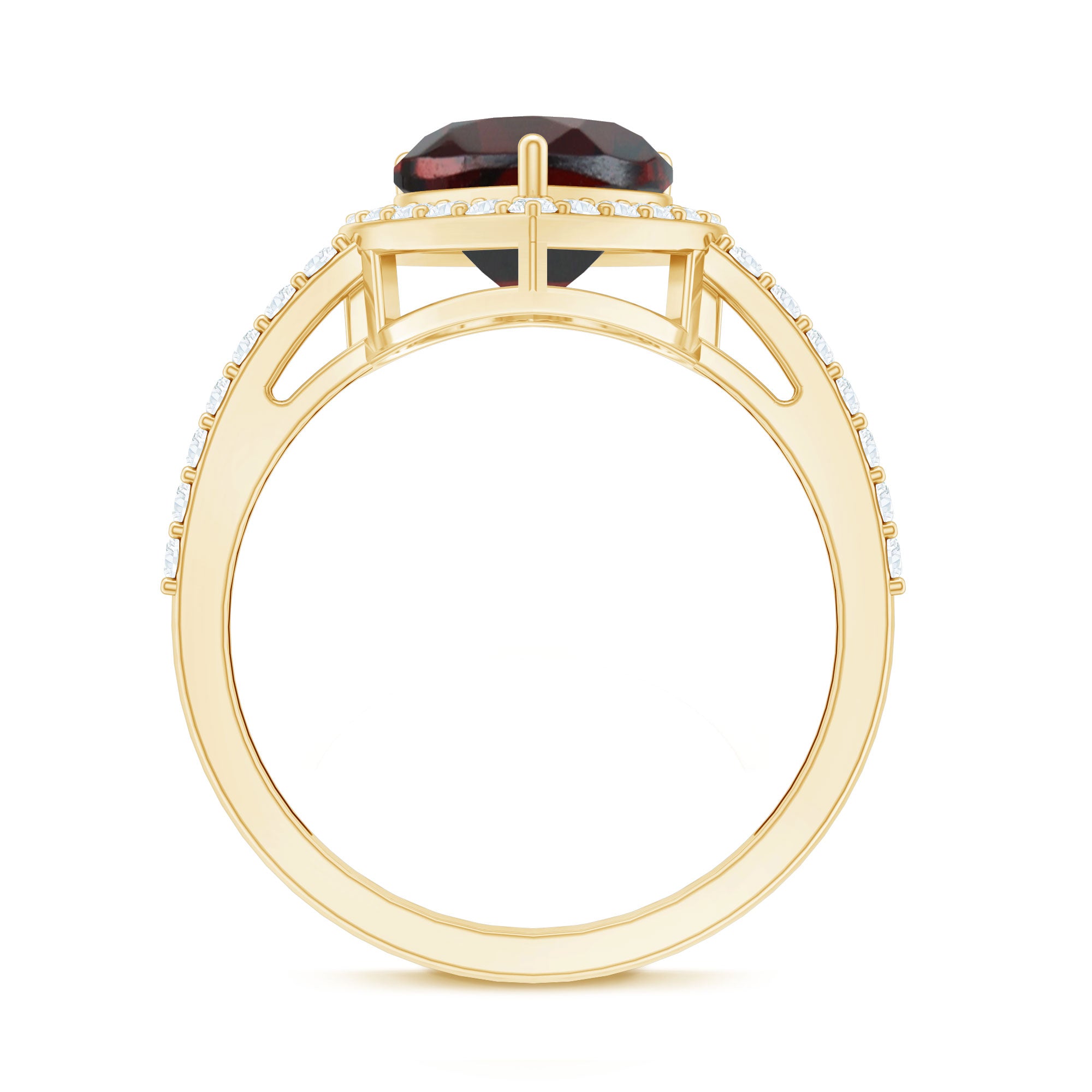 An emblem of love that will last forever, this Heart Engagement Ring is the perfect way to express your deepest feelings. The stunning 8 mm Heart Shape Garnet at the center radiates a rich, passionate red hue that symbolizes the warmth and depth of your love. Surrounding it is a sparkling Halo of Diamond stones, adding extra brilliance and elevating the glow of the garnet. What makes this ring truly special is the row of Diamond stones that grace the band, creating a seamless flow of light and adding even more allure to its timeless design. Available in various sizes and presented in a signature jewelry box, this Garnet and Diamond Ring is the ideal choice for a proposal, an anniversary or any moment where you want to show just how much you care. This Garnet Engagement Ring combines classic elegance with a modern, romantic twist, making it a piece she will cherish forever. Simple yet stunning, this Halo Engagement Ring with Garnet will sparkle with every heartbeat, reminding her of your love with each passing day.