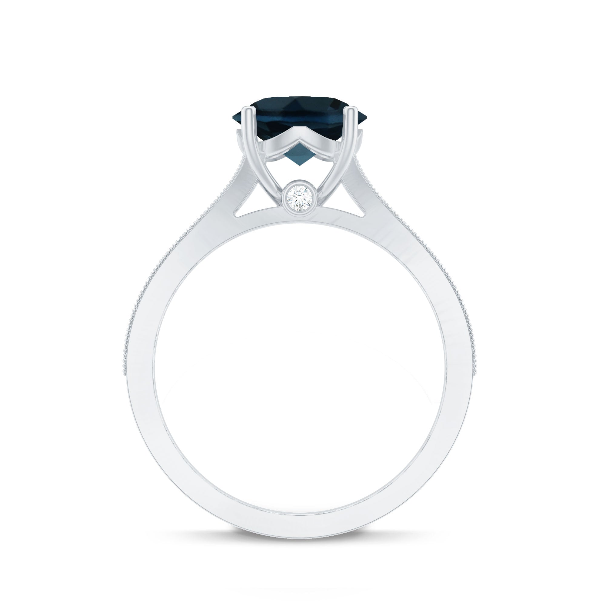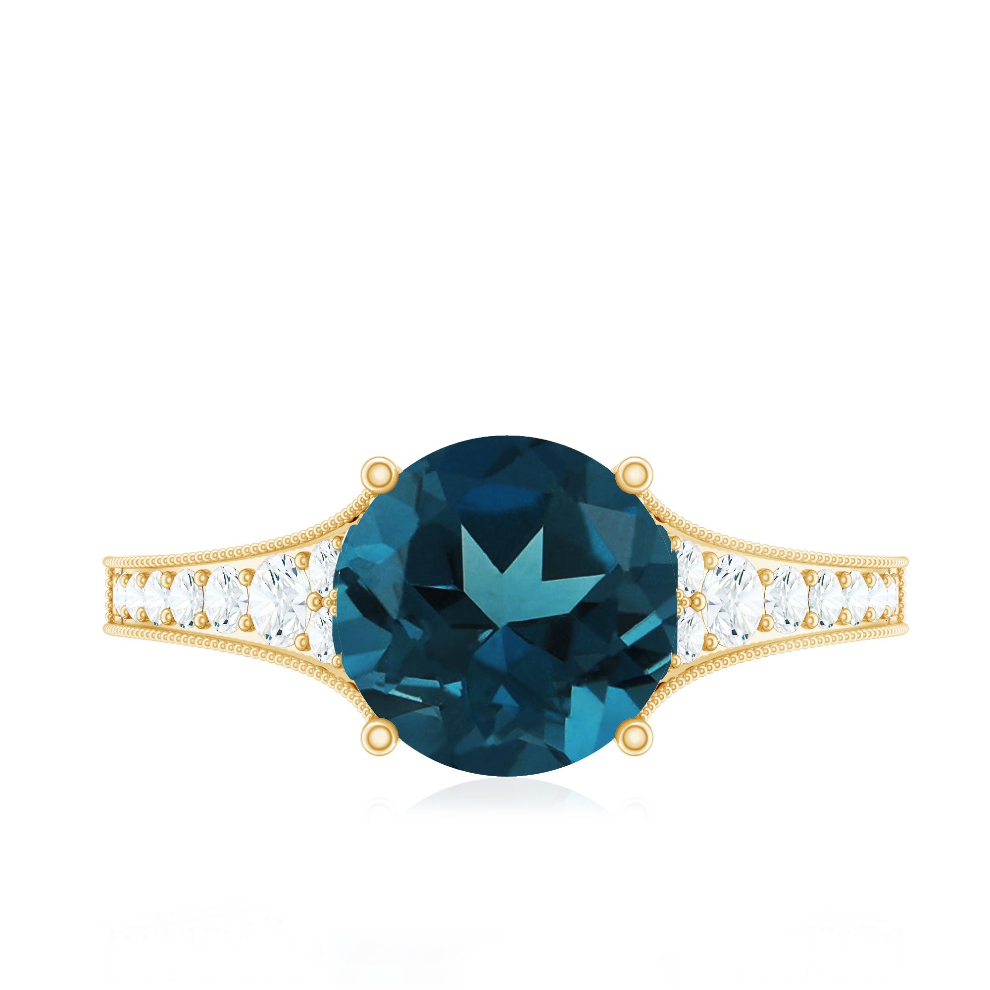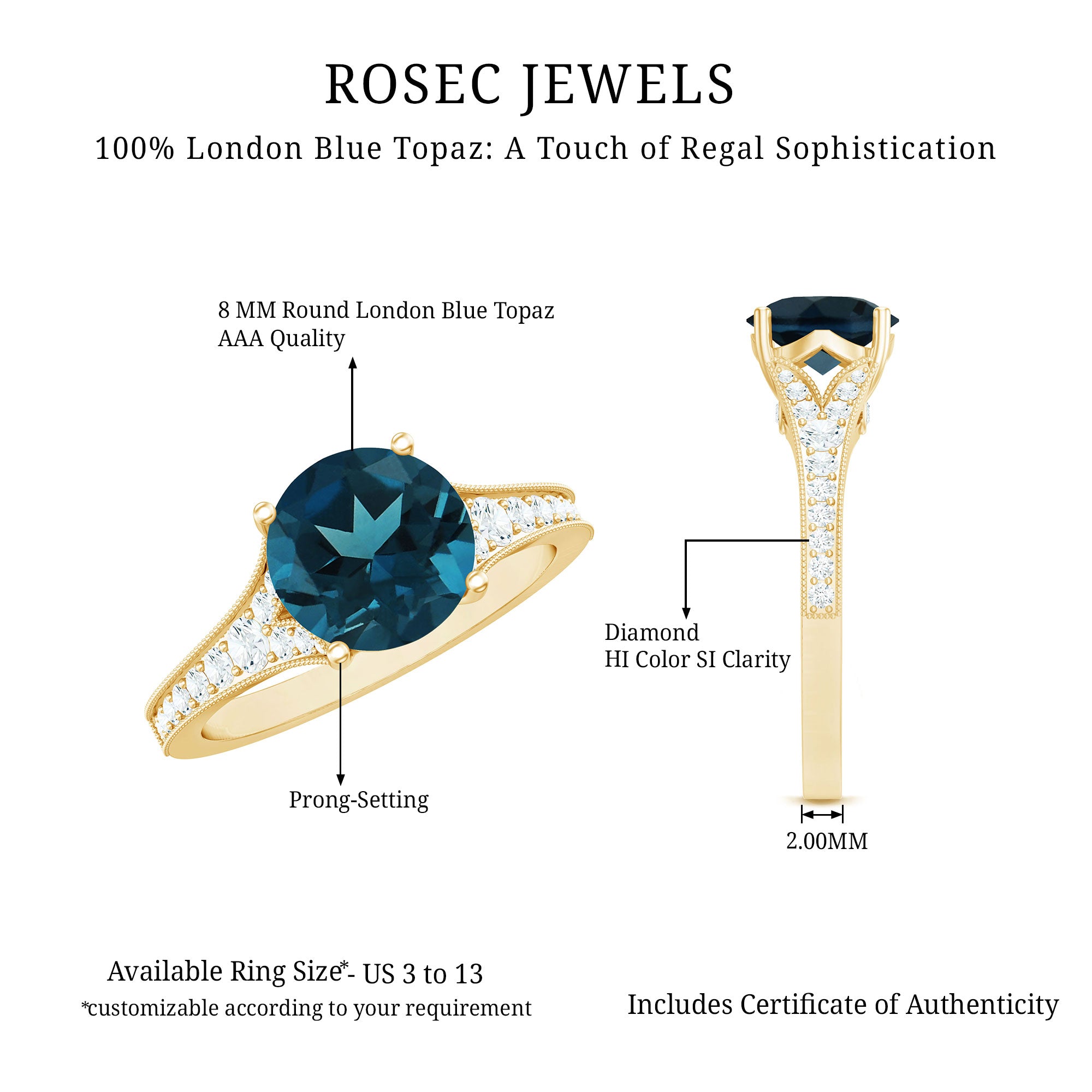 Turn heads with a ring that is made to shine. This London Blue Topaz Ring is all about elegance with a modern twist. At the center sits a sparkling 8 MM round cut London Blue Topaz, held securely in prong setting. The color and shine of the topaz make it the perfect standout piece for anyone who loves a bold yet timeless look. The designer band gives the Solitaire Engagement Ring a fresh and unique feel. It is lined with round diamonds that add just the right amount of sparkle without taking away from the main stone. And for a little extra magic, there is a tiny diamond tucked under the center stone in bezel setting, a sweet detail that adds charm and surprise. Crafted using AAA quality London Blue Topaz and HI-SI quality diamonds, this Round Engagement Ring is made to last and look amazing for years to come. It is designed to fit comfortably, whether you wear it every day or save it for special occasions. This London Blue Topaz and Diamond Ring is available in US sizes 3 to 13, so you can find the perfect fit. Whether it is for an engagement, anniversary, or just because, it is a beautiful way to show love, celebrate your story, or treat yourself. Simple, stunning, and full of meaning, this Designer Ring is the kind of piece you will treasure forever.
