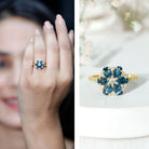 This exquisite Floral Engagement Ring is carefully handcrafted for the contemporary woman who values both individuality and elegance. At the core of this remarkable piece is an 3x6mm oval shape London Blue Topaz set surrounding the round Diamond stone, and more round diamond set surrounding blue topaz stones. The halo design is crafted to enhance light reflection, providing the gemstone with an additional sparkle that represents eternal love. This London Blue Topaz Engagement Ring is a timeless masterpiece, serving as the perfect complement to any outfit. With its unique color spectrum, the AAA Quality London Blue Topaz exudes a lasting allure due to its distinctive shade. This Blue Topaz and Diamond Ring evokes a sense of nostalgia within modern designs, making it an eye-catching choice for anyone looking to make a statement. This Flower Cocktail Ring, showcasing intricate craftsmanship, reflects the artistry of previous generations. As topaz are the birthstone for December, they represent a lovely gift for cherished ones.