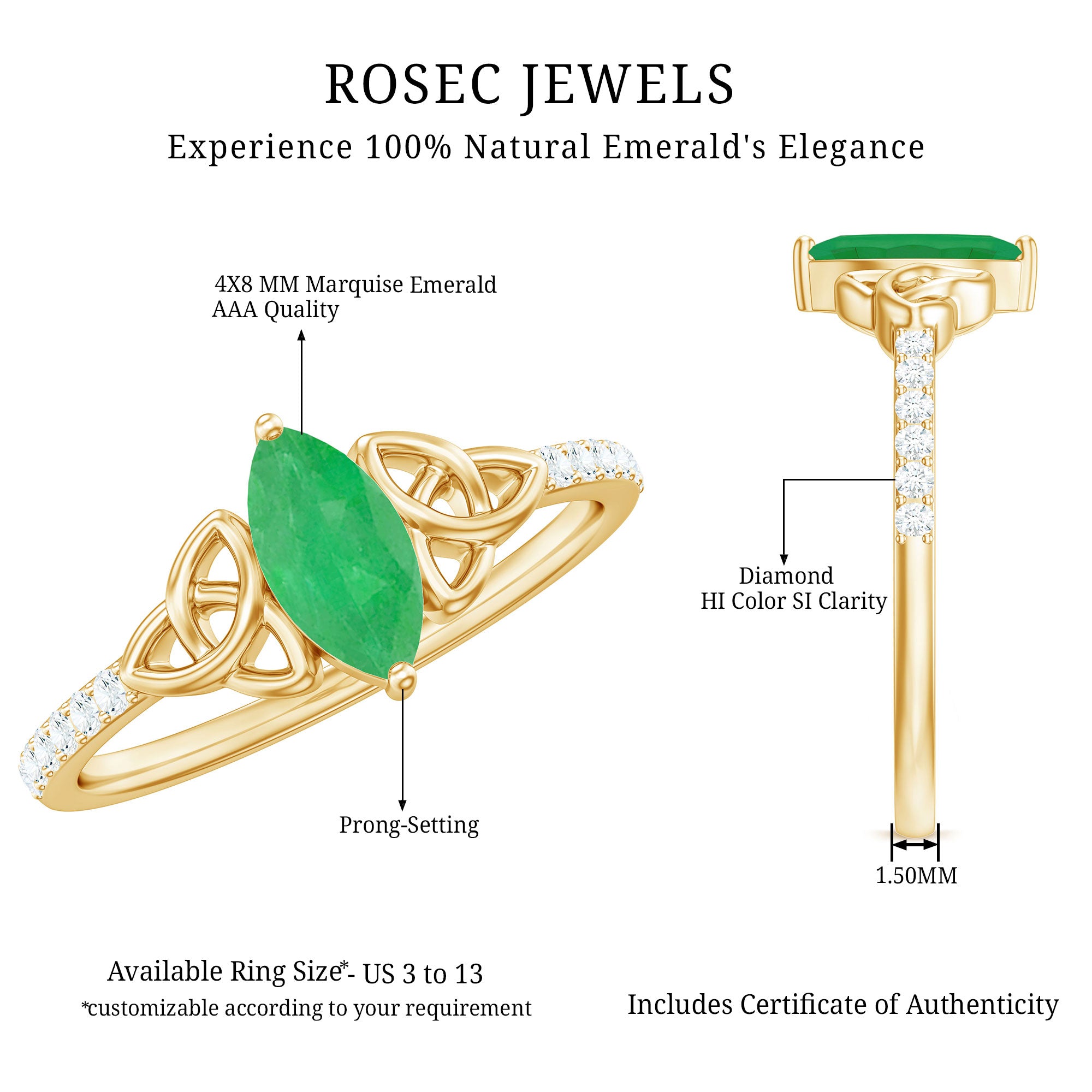 Weave your love story with elegance and meaning with this breathtaking Marquise Promise Ring, a piece that perfectly blends symbolism, sophistication and romance. The striking 4X8 mm Marquise Shape Emerald takes center stage in Prong Setting, its rich green hue evoking harmony and the deep-rooted passion of true love. Flanking the center stone, sparkling Diamond Side Stones add a touch of brilliance, catching the light with every movement and enhancing the overall radiance of the ring. What makes this Marquise Emerald Ring truly exceptional is the Celtic knot design delicately woven into the band, a timeless emblem of eternity, unity and the intertwining of two souls destined to be together. Presented in a signature jewelry box and available in multiple sizes, this Emerald Promise Ring is ready to mark a proposal, an anniversary or a meaningful milestone in your journey together. This Celtic Knot Ring is a symbol of devotion, a daily reminder of shared dreams and a celebration of a bond that grows stronger with every passing day, a radiant testament to a love story that will shine for a lifetime.