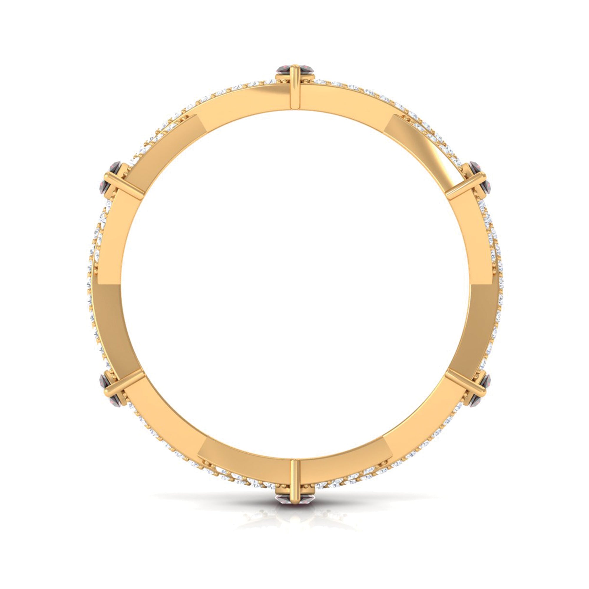 Add a flair of romantic brilliance to every moment with this Full Eternity Ring, designed to capture the beauty of everlasting love. The striking 2X4 mm Marquise Shape Garnet stones, glowing with a deep and passionate red, create an elegant rhythm around the band. Enhancing this fiery charm is the graceful Crossover Shank, beautifully studded with dainty Diamond stones that add a soft, sparkling contrast. The crossed design feels symbolic on its own, like two paths intertwining into one, making this Marquise Eternity Band even more meaningful for anniversaries or heartfelt celebrations. The refined yet captivating style makes it perfect for everyday elegance or special occasions that call for a touch of sparkle. Presented in a signature jewelry box and available in various ring sizes, this Garnet Diamond Ring is ready to be gifted and prepared to be cherished for years to come.