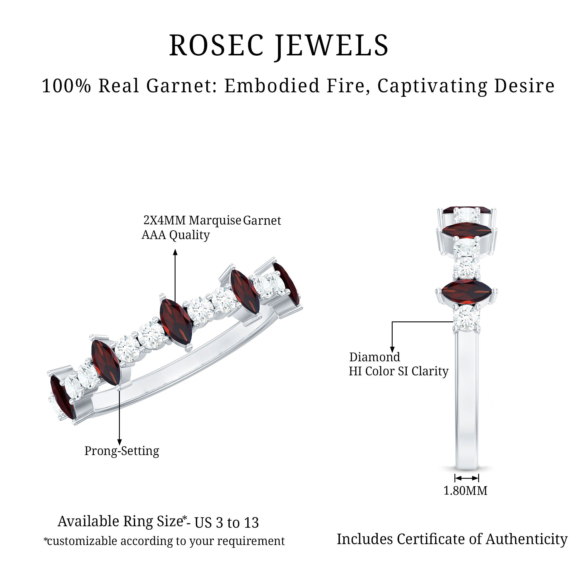 With every glance, this Half Eternity Ring tells a story of love that is as unique as it is timeless. The 2X4 mm Marquise Shape Garnet stones, with their red glow, alternate gracefully with sparkling Round Shape Diamond stones, creating a rhythm of elegance and romance that catches the eye from every angle. This half-eternity design embodies both sophistication and sentiment, offering a delicate sparkle that feels modern yet everlasting. Carefully crafted to celebrate devotion, this Marquise Garnet Ring slips comfortably onto the finger, making it perfect for daily wear or special occasions. This Garnet Diamond Ring comes in our signature jewelry box, ready to be gifted as a meaningful token of love. Available in various ring sizes, this Marquise Eternity Band ensures the perfect fit for the person who holds your heart. This Wedding Anniversary Ring is a symbol of passion, connection and everlasting commitment, a gentle reminder that true love shines brightest when shared.
