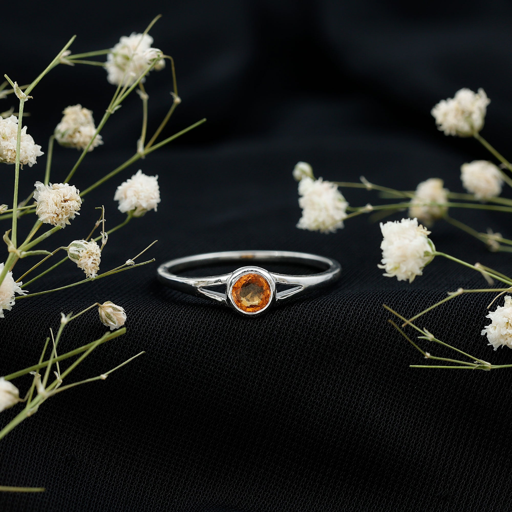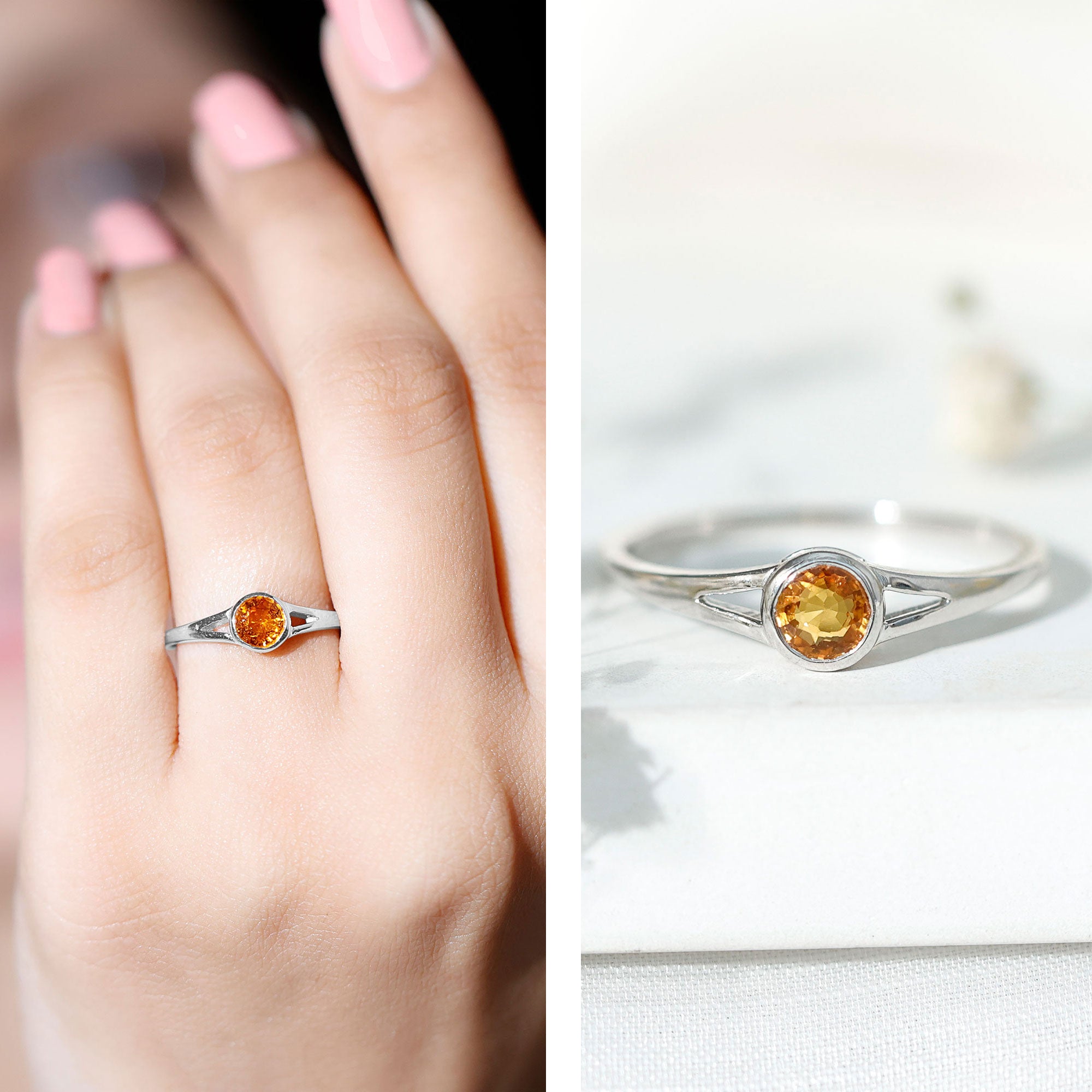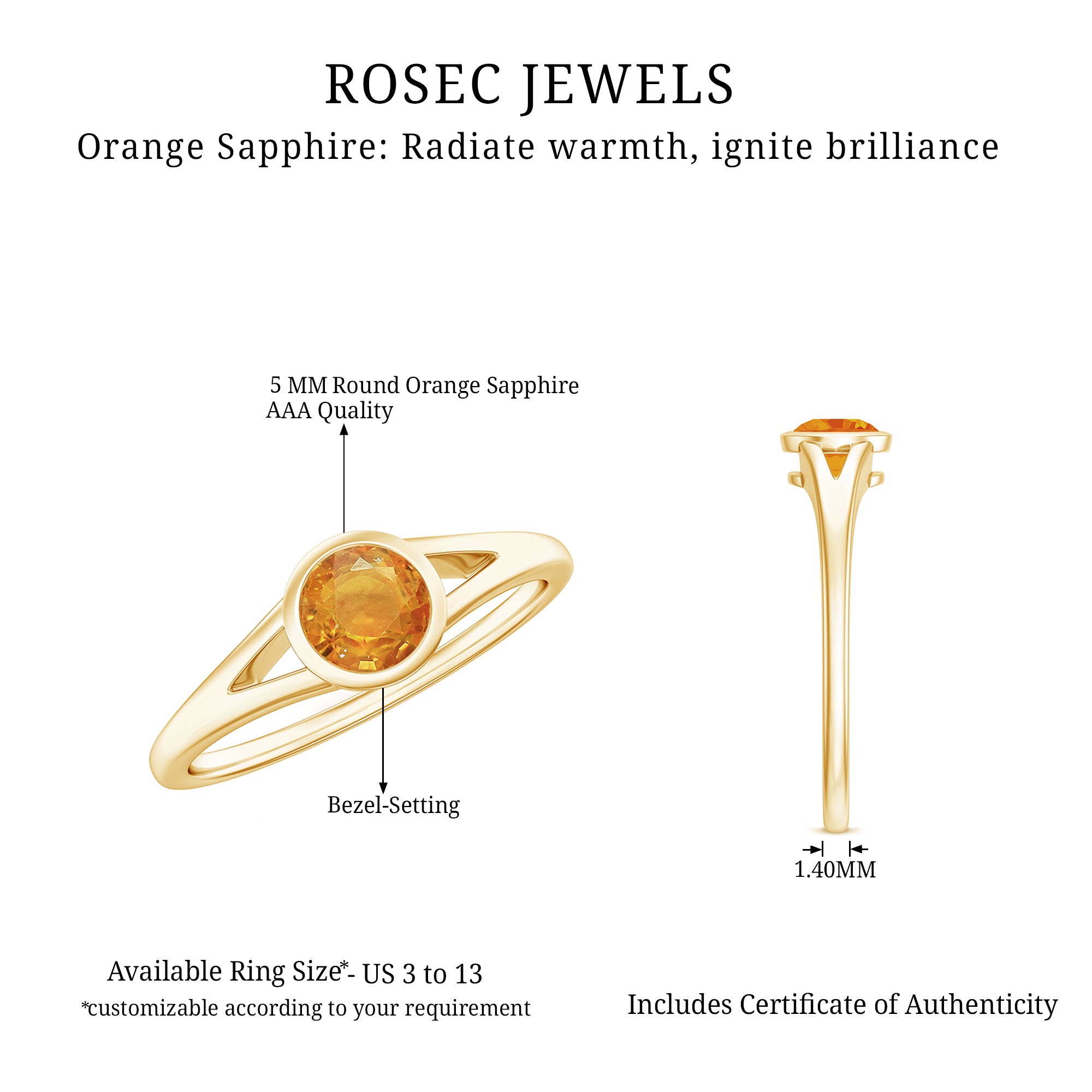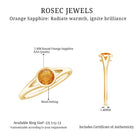 Rosec Jewels Solitaire Promise Ring showcases a stunning 5 MM round cut orange sapphire, securely set in bezel setting. As a September birthstone, orange sapphire represents strength, wisdom, and positive energy, qualities that make it a powerful choice for a promise ring, engagement ring, or meaningful keepsake. Its warm, sun-like hue sets it apart from traditional stones, offering a unique and modern twist. The Orange Sapphire Ring features a beautifully crafted split shank design, adding elegance and a touch of contemporary charm. Whether given as a symbol of love, commitment, or personal empowerment, this Sapphire Promise Ring carries deep emotional significance. Its vibrant color and thoughtful craftsmanship make it ideal for someone who appreciates jewelry that blends simplicity with standout beauty. Perfect for birthdays, proposals, or anniversaries, this September Birthstone Ring offers timeless elegance with a radiant and modern twist, destined to become a treasured piece for years to come.