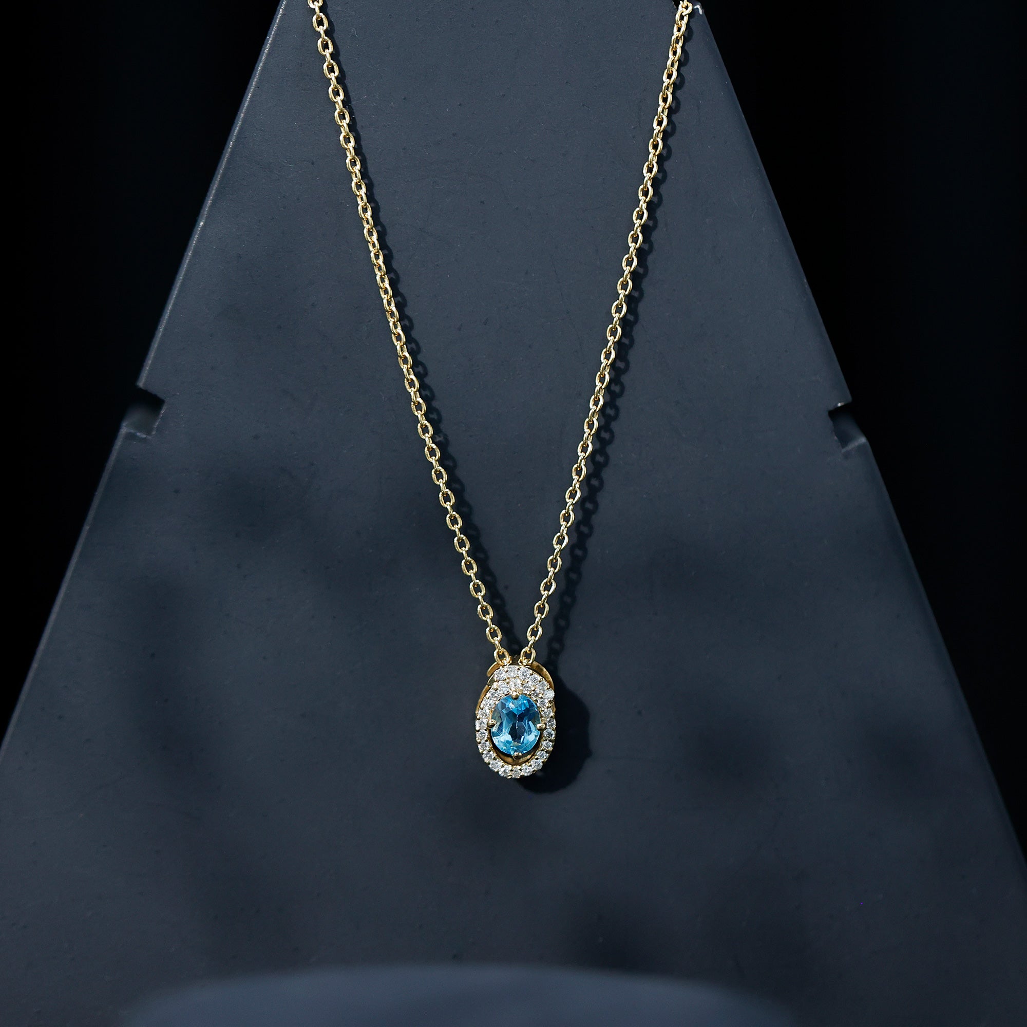 Celebrate love, beauty, and new beginnings with this stunning Sky Blue Topaz Necklace. Handcrafted in 14k yellow gold plated silver, this Swirl Necklace features a 4X5 MM oval shaped Sky Blue Topaz, surrounded by a graceful swirl halo of lab grown diamonds. Whether you are dressing up or keeping things simple, this Oval Locket Necklace adds charm and grace to any outfit. As the December birthstone, it makes a thoughtful gift for someone born in that month. This Blue Topaz and Diamond Necklace is also ideal for many special occasions, whether you are looking for a Valentine’s Day surprise, a birthday present, or a heartfelt Mother’s Day gift. It is a wonderful pick for Christmas, New Year, or simply to let someone know how much they mean to you. The Blue Stone Necklace comes with a sturdy chain that sits comfortably on the neck, making it easy to wear every day or on special evenings. The AAA quality sky blue topaz, and eco-friendly lab grown diamonds of EF-VS quality make it a piece you will treasure for years. Comes in a beautiful jewelry box, this Oval Pendant Necklace is ready to light up someone’s day, or your own.