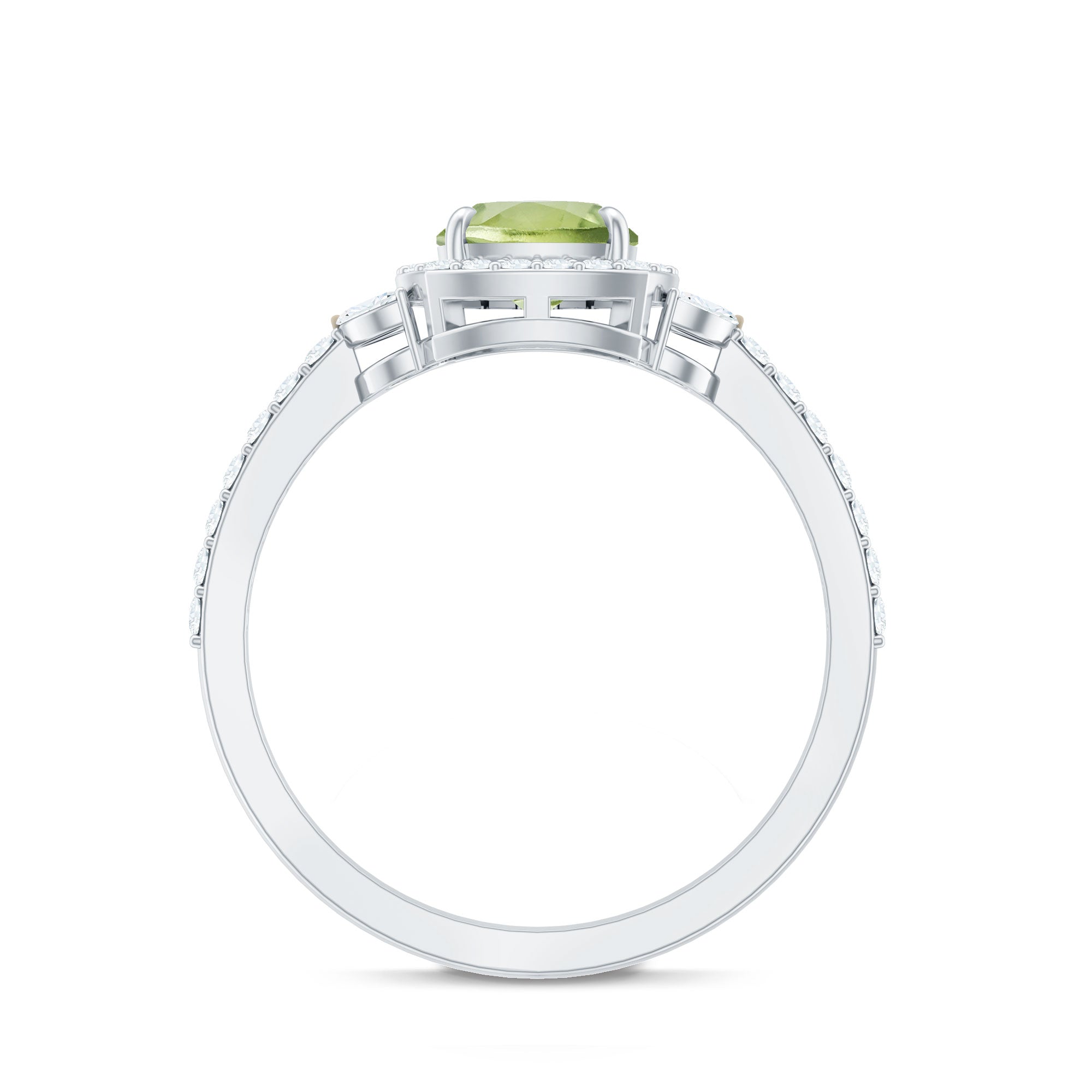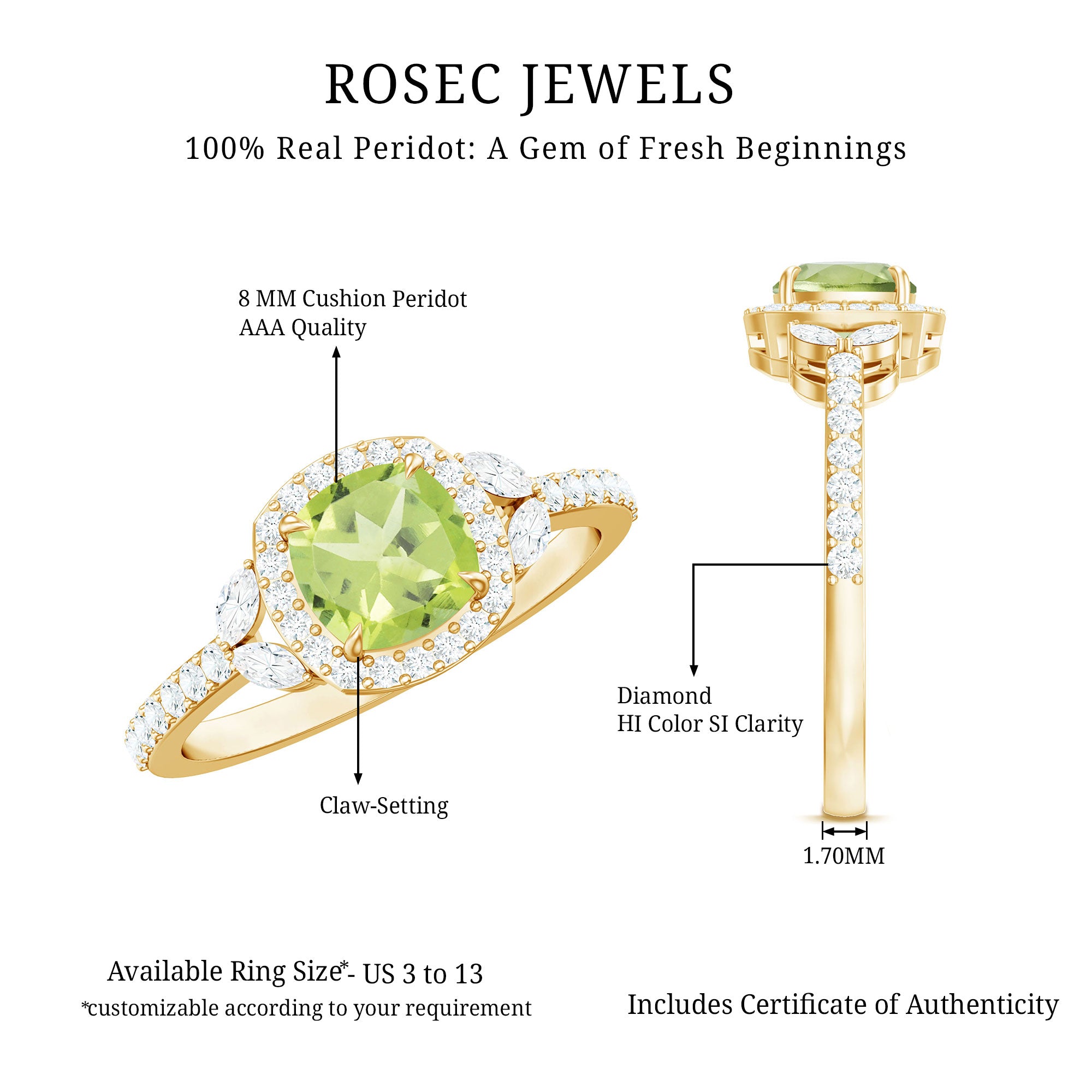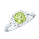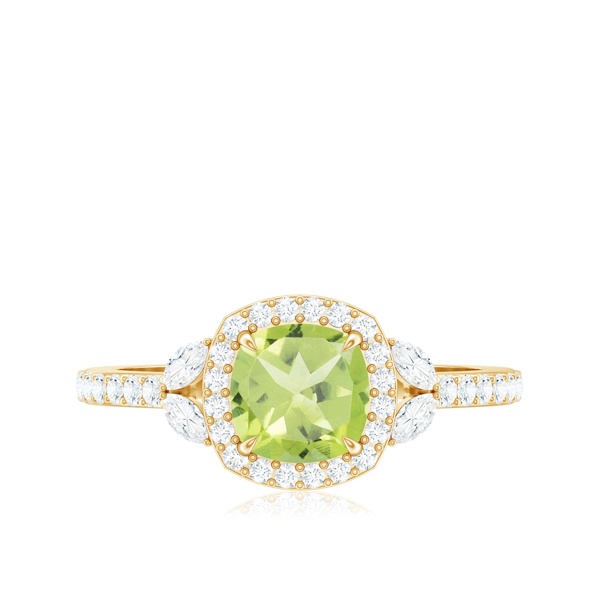 Capture her heart with this breathtaking Peridot Engagement Ring, featuring a dazzling cushion cut natural Peridot in the center, surrounded by a halo of sparkling Diamond stones. The cushion cut of the Peridot creates a unique and vintage-inspired look, while the Diamond halo adds a touch of glamour and luxury. This exquisite ring is made from the finest materials, ensuring its longevity and timeless appeal. Its the perfect engagement ring for a woman who loves both classic and contemporary styles.