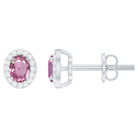 Add a touch of sparkle and charm to your look with these beautiful Pink Sapphire Stud Earrings. Designed to blend modern elegance with classic beauty, these Oval Stud Earrings are perfect for both everyday wear and special moments. Each earring features a 3X5 MM oval shaped Pink Sapphire set in prong setting. Surrounding the center stones is a delicate halo of round lab grown diamonds, carefully placed to reflect light and add extra shimmer. The soft pink hue of the sapphire and the sparkling white diamonds create a lovely contrast that feels fresh, feminine, and timeless. The Pink Sapphire and Diamond Earrings are made from 14K white gold plated silver and finished with secure screw back closures, giving you both comfort and peace of mind. These Halo Earrings are made of AAA quality pink sapphire paired with EF-VS quality lab made diamonds, ensuring excellent sparkle and long-lasting shine. Whether you are dressing up for a romantic evening, a wedding, or simply adding a touch of beauty to your everyday outfit, these Bridal Stud Earrings are a perfect choice. They also make a thoughtful gift for birthdays, anniversaries, or meaningful celebrations. More than just jewelry, these earrings are a beautiful way to show love, celebrate moments, and add timeless elegance to any collection.