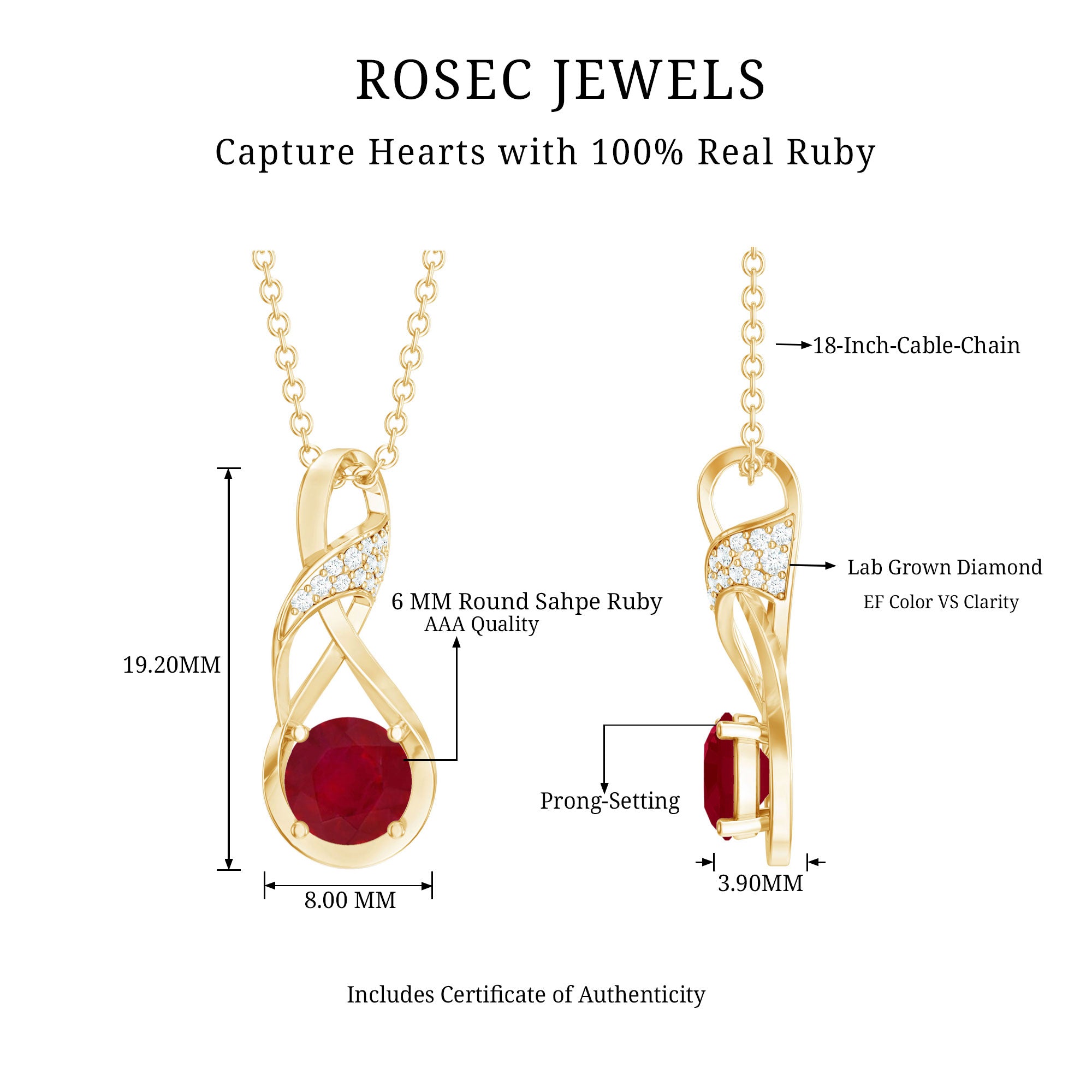 Celebrate the beauty of lasting love with this stunning Ruby Infinity Necklace, a graceful blend of emotion, style, and elegance. Crafted in 14k yellow gold plated silver, this Ruby Pendant features a beautifully flowing infinity design that gently twists to form a loop, symbolizing love without end. At the base of the pendant sits a brilliant 6 MM round cut ruby, securely held in prong setting. The infinity loop gently curves and sparkles with lab grown diamonds, adding a soft brilliance to the design. This Ruby and Diamond Necklace hangs gracefully from a matching chain, making it easy to wear every day or save for moments that matter. Whether you are gifting it to someone you love or treating yourself, the message behind this piece is clear, a symbol of love that is strong, infinite, and full of meaning. This piece showcases a AAA quality ruby and EF color and VS clarity lab grown diamond, offering a striking and sophisticated look to the timeless infinity design. The color of love is combined with a shape that stands for forever, making this Infinity Symbol Necklace a perfect expression of romance and enduring devotion, whether gifted to a partner or kept as a meaningful reminder of self-love.