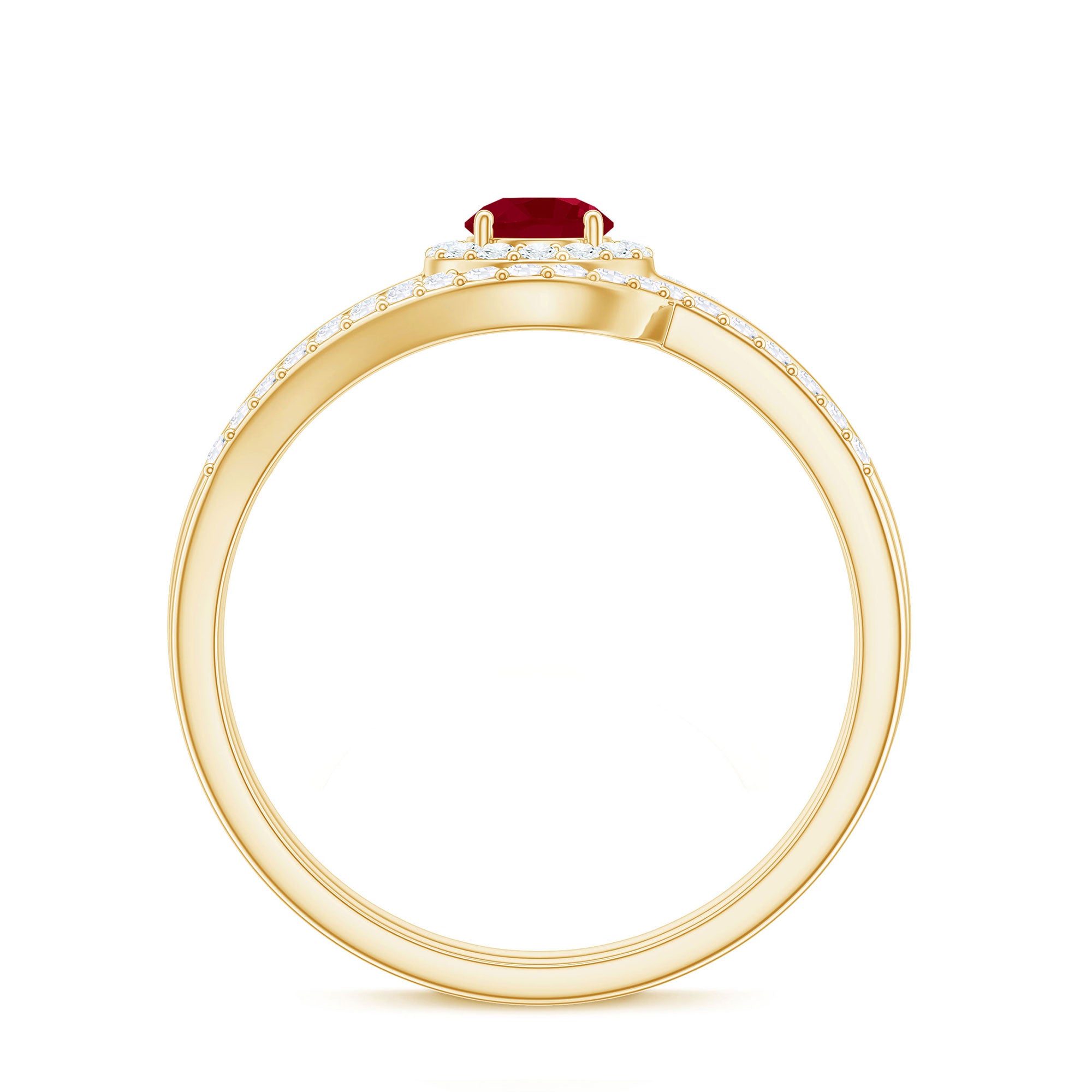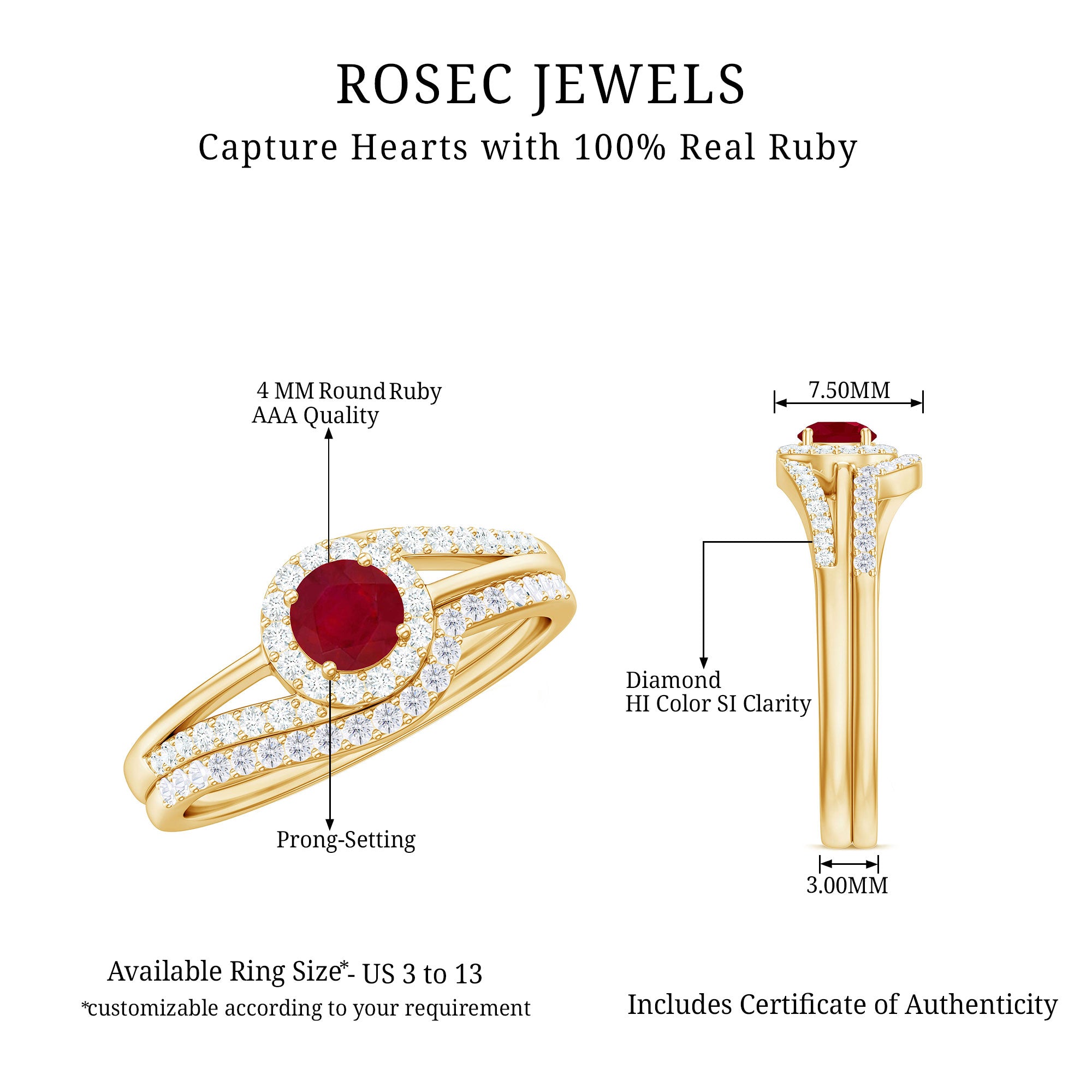 Make your special day even more memorable with our glorious Minimal Wedding Ring set. This stunning Bridal Ring Set features a Round Shape Ruby at the center, adorned with Diamond Accents, and crafted with high-quality Gold for an opulent appeal. With its elegant and timeless design, this ring set is perfect for any special occasion, adding a touch of sophistication and beauty to your look.