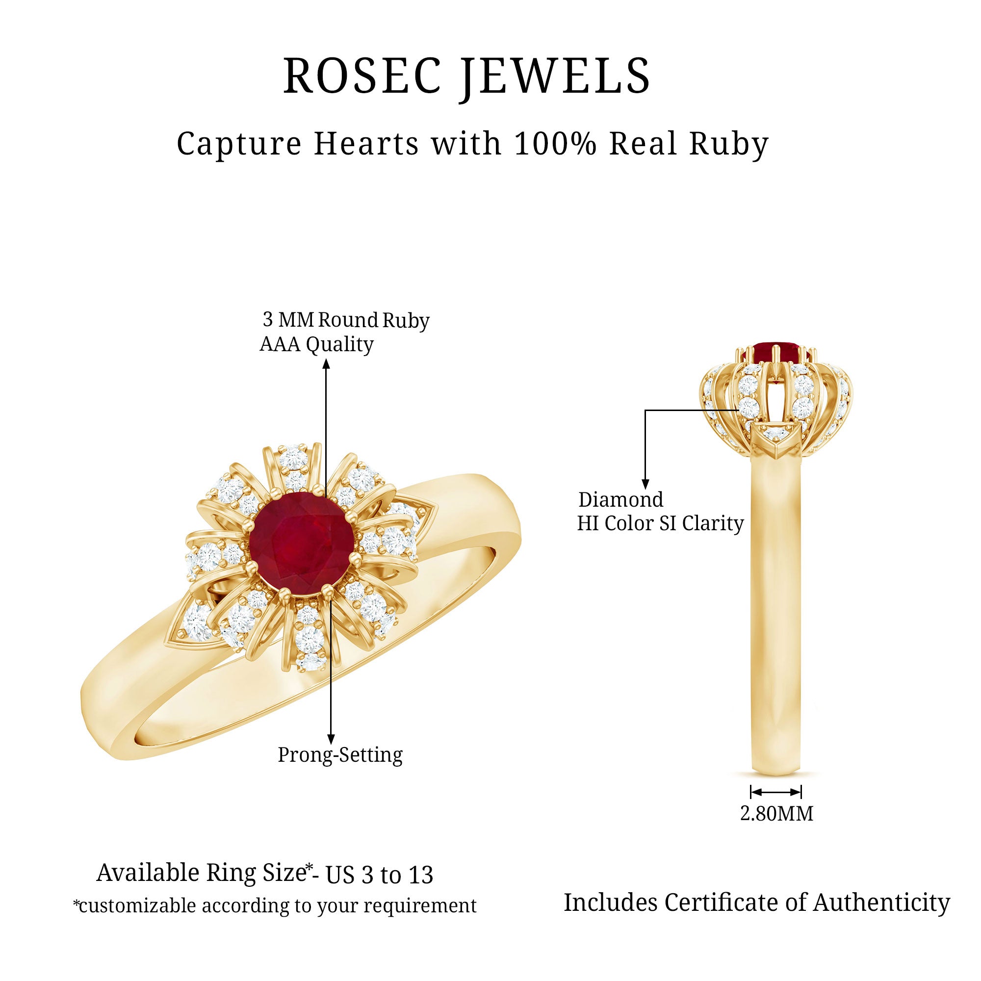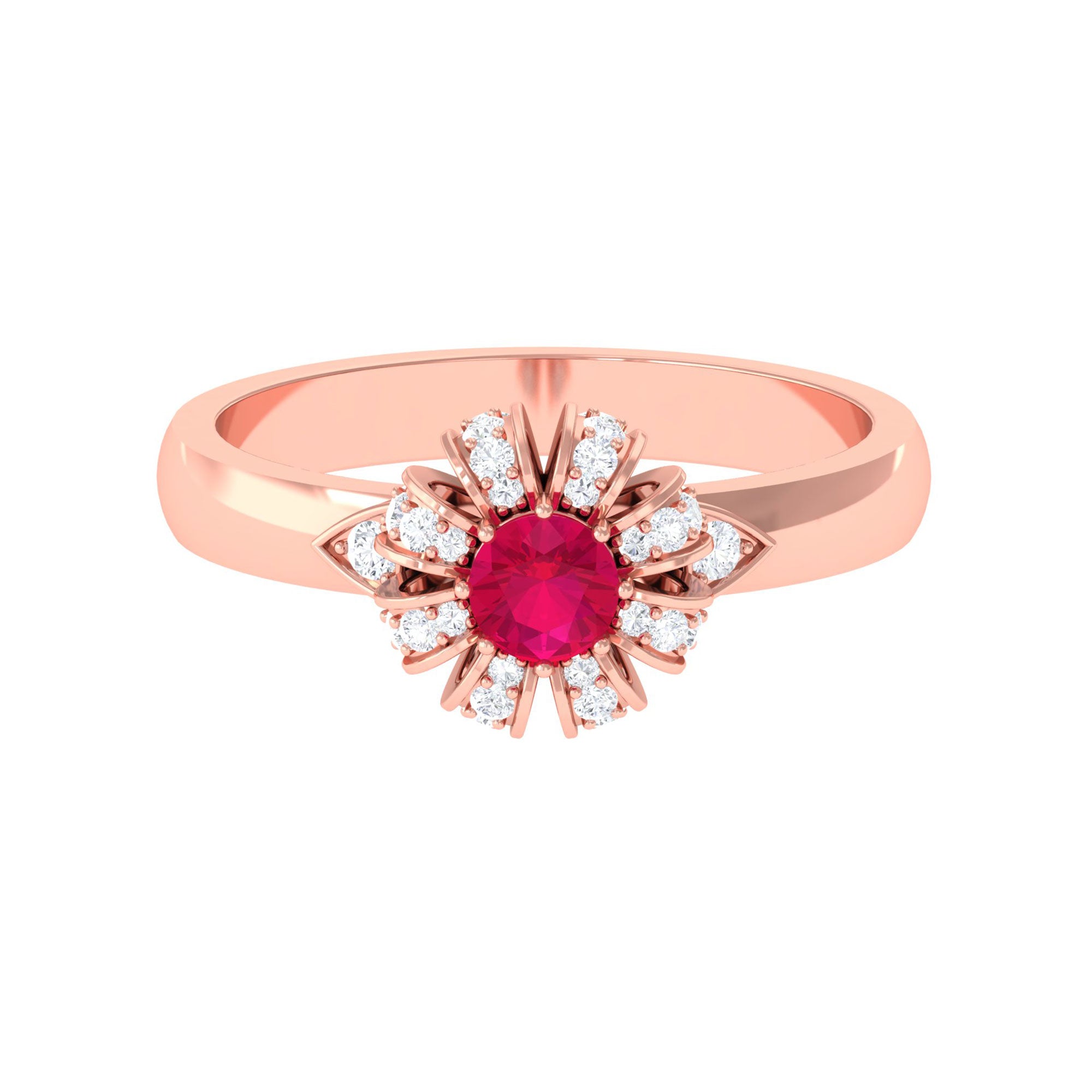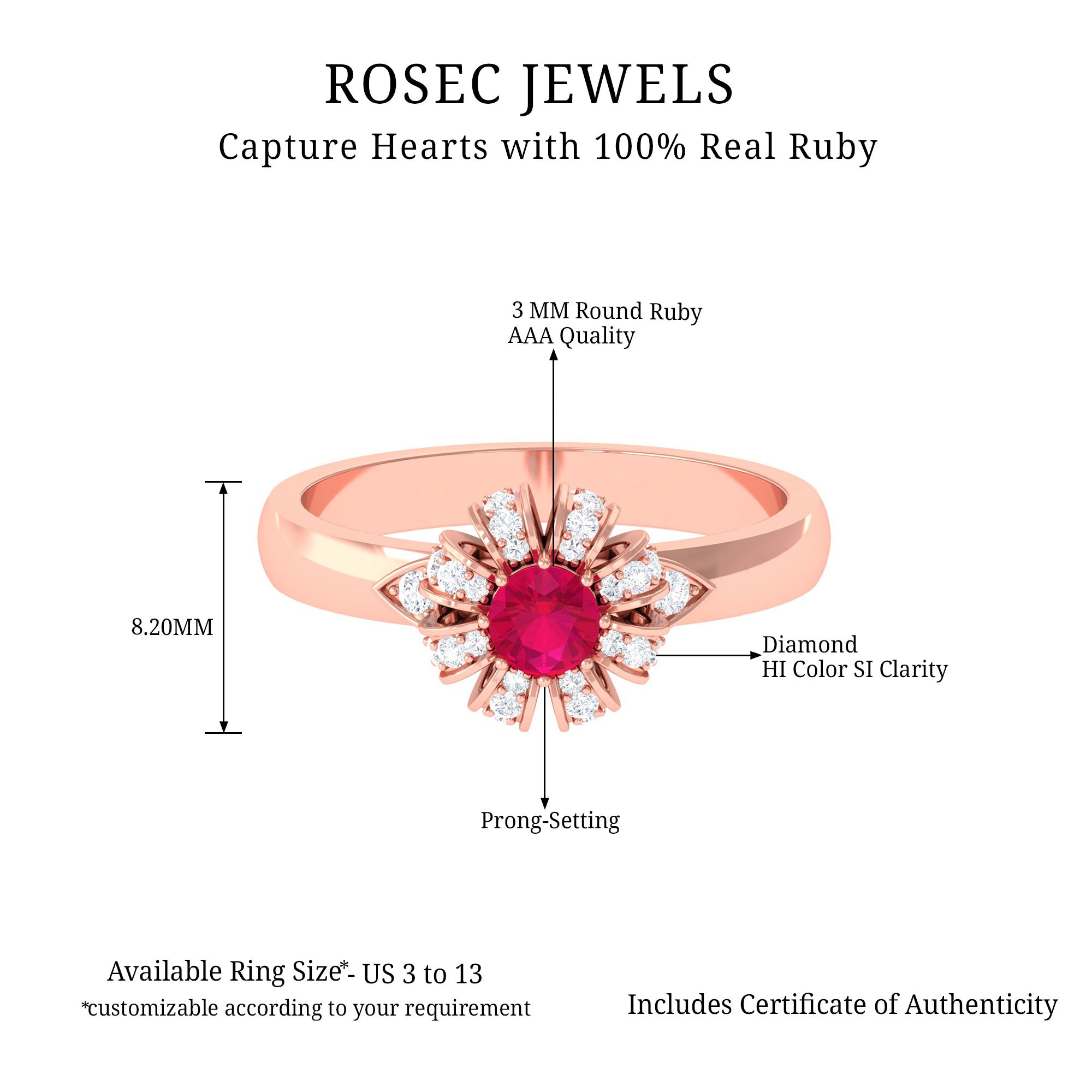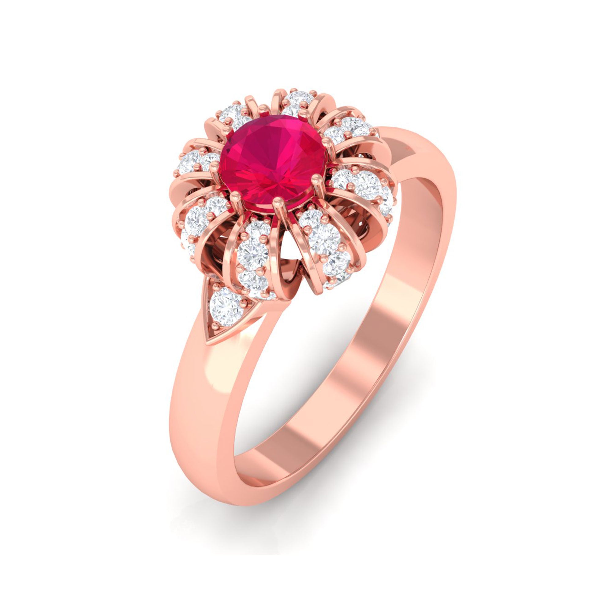 Elevate your style with the alluring and radiant Flower Ring, featuring a captivating round-shaped ruby as the solitaire centerpiece. It is delicately nestled within a stunning floral design adorned with small round-shaped Diamond stones, beautifully engraved on the petals in a pave setting. This Ruby Flower Ring is an exquisite addition to any jewelry collection, making it an ideal choice for bridal wear in a Jewelry Wedding Collection.