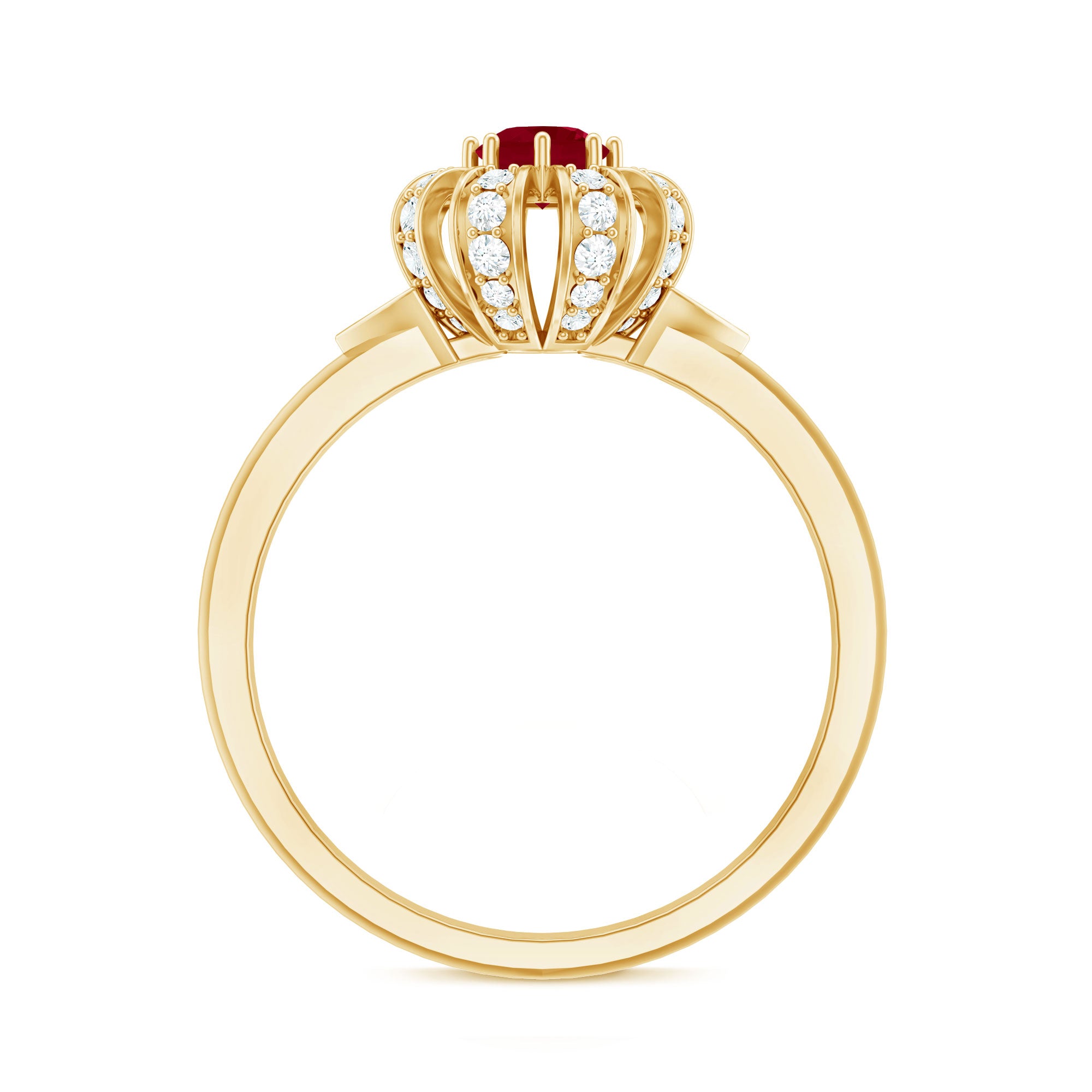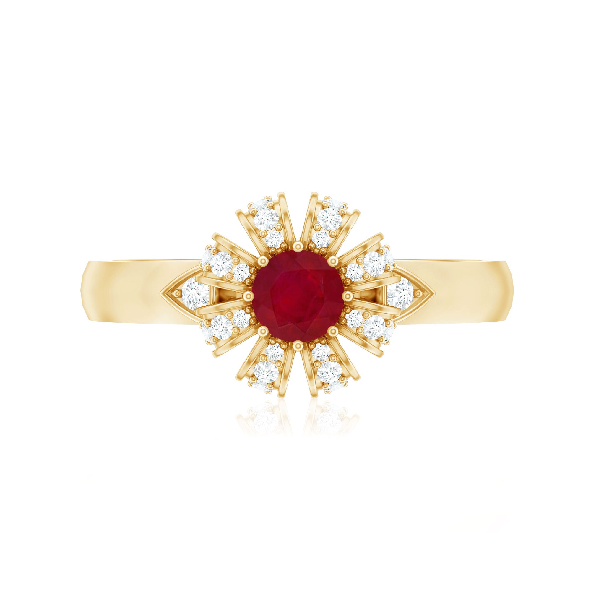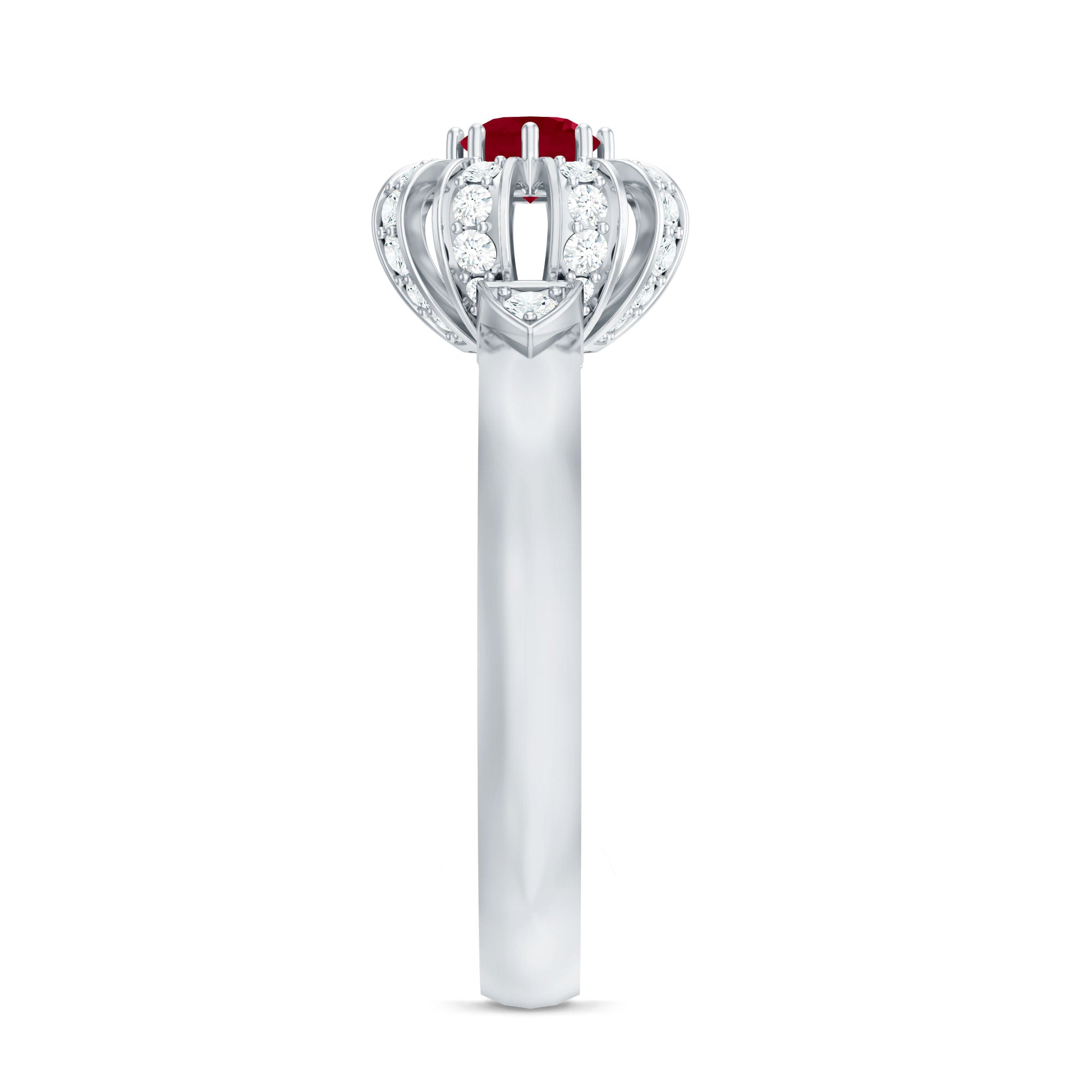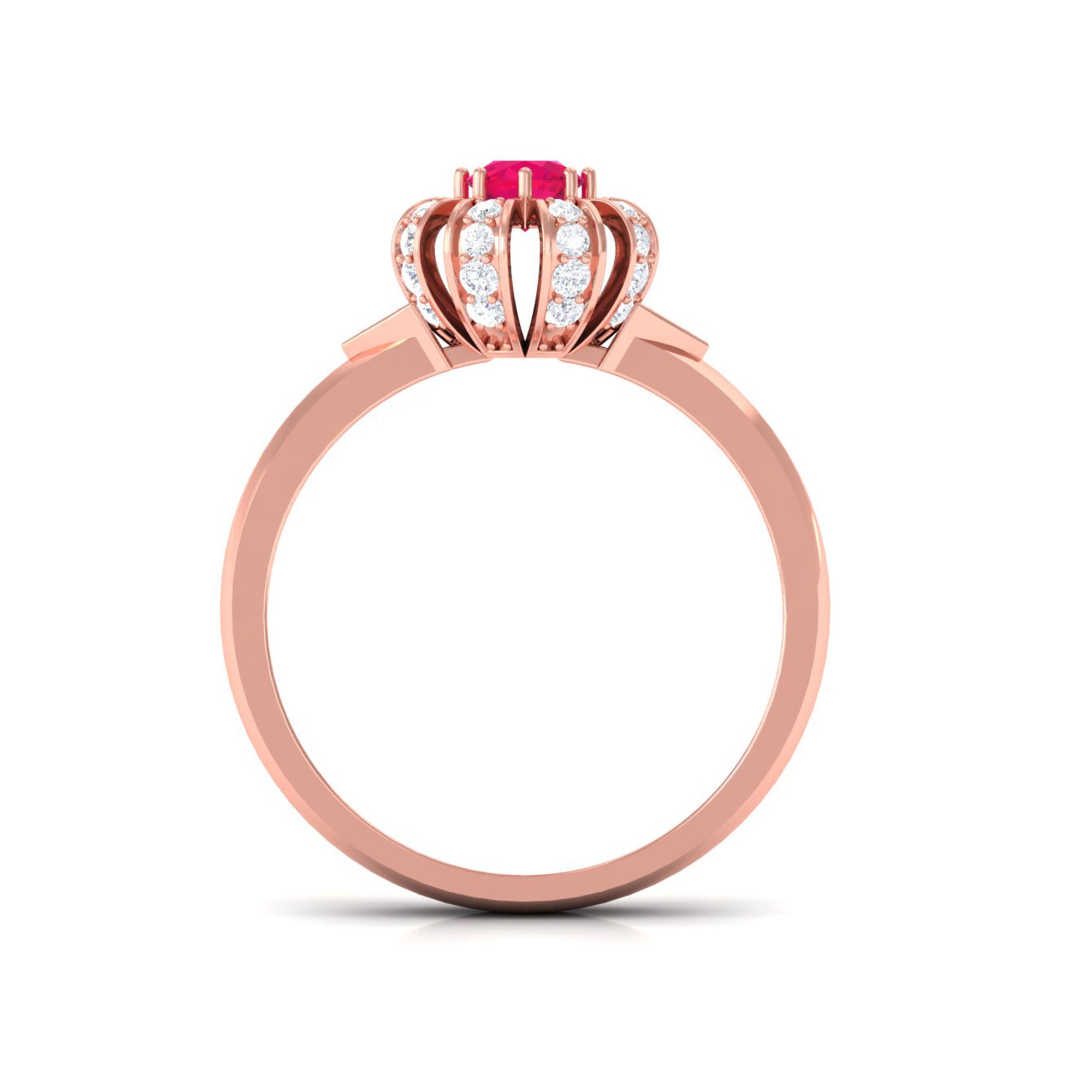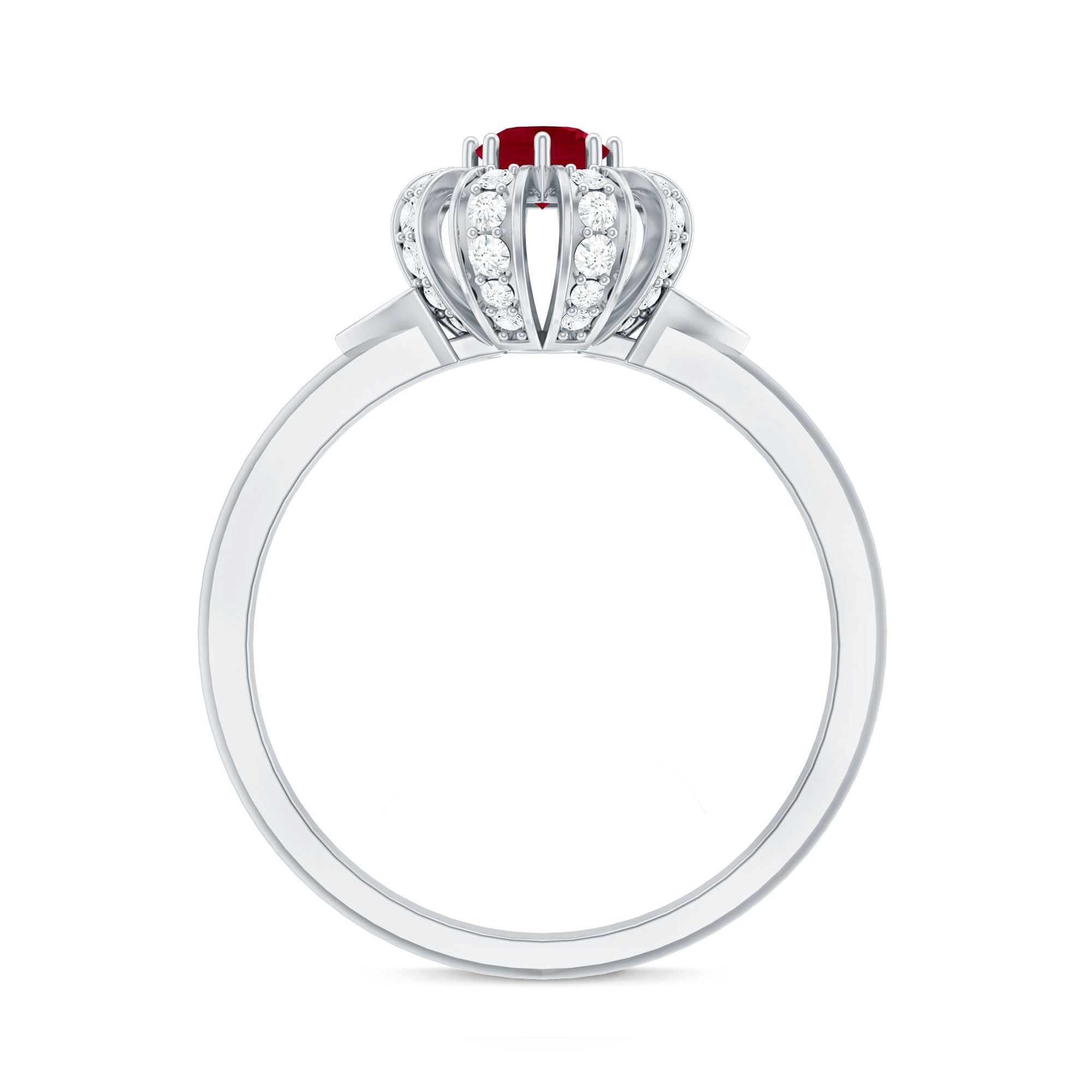 Elevate your style with the alluring and radiant Flower Ring, featuring a captivating round-shaped ruby as the solitaire centerpiece. It is delicately nestled within a stunning floral design adorned with small round-shaped Diamond stones, beautifully engraved on the petals in a pave setting. This Ruby Flower Ring is an exquisite addition to any jewelry collection, making it an ideal choice for bridal wear in a Jewelry Wedding Collection.